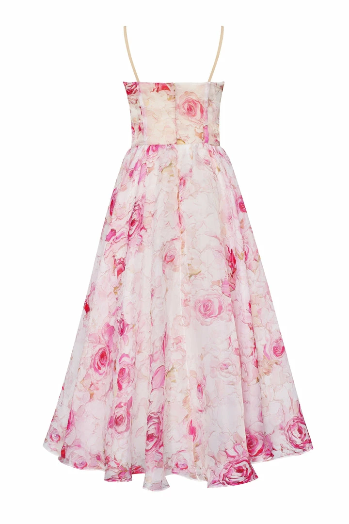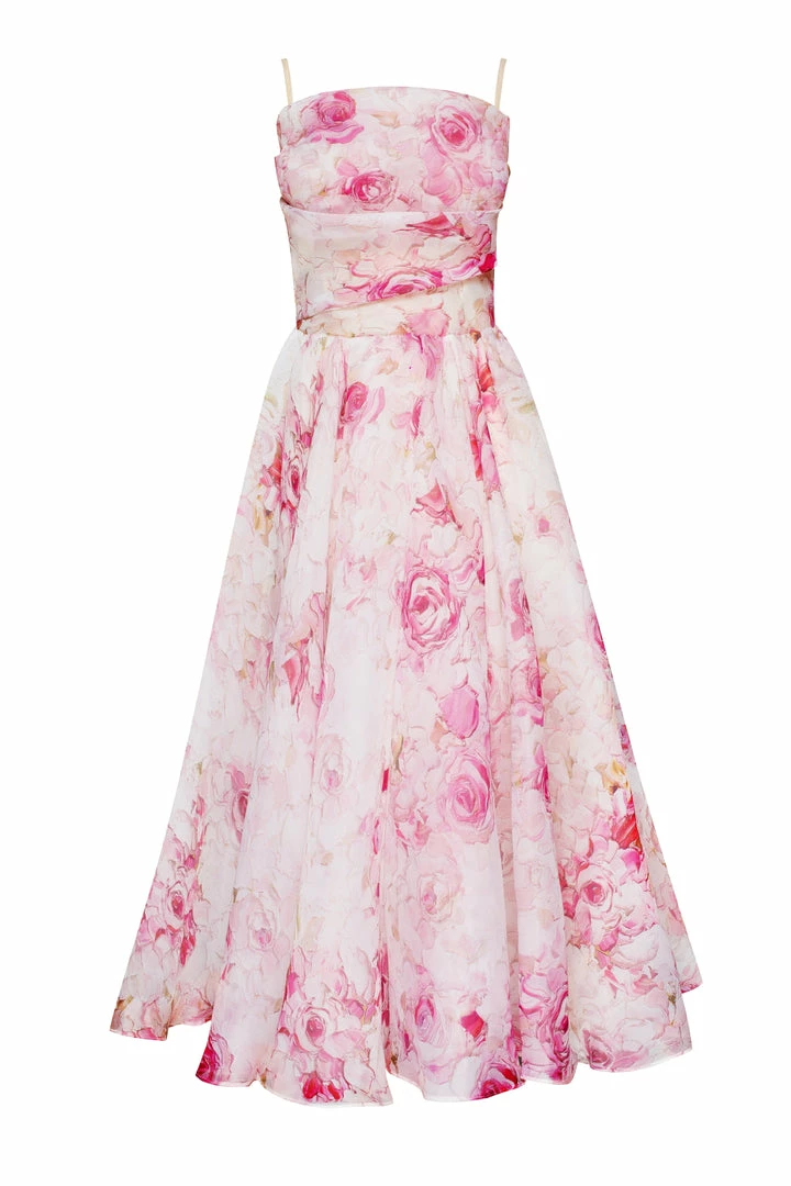 Tender spaghetti strap a-line midi dress with a flared full skirt and a ruched bodice. Features a