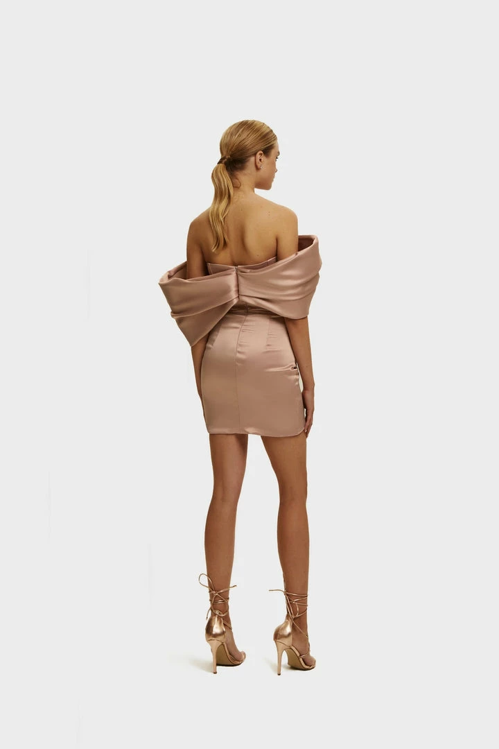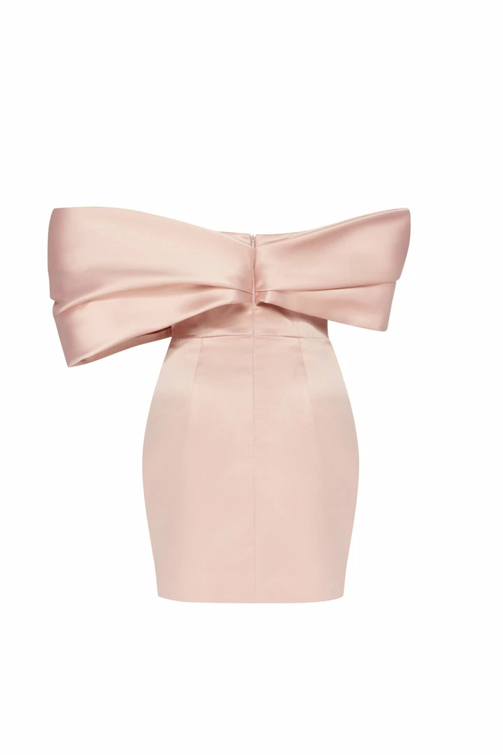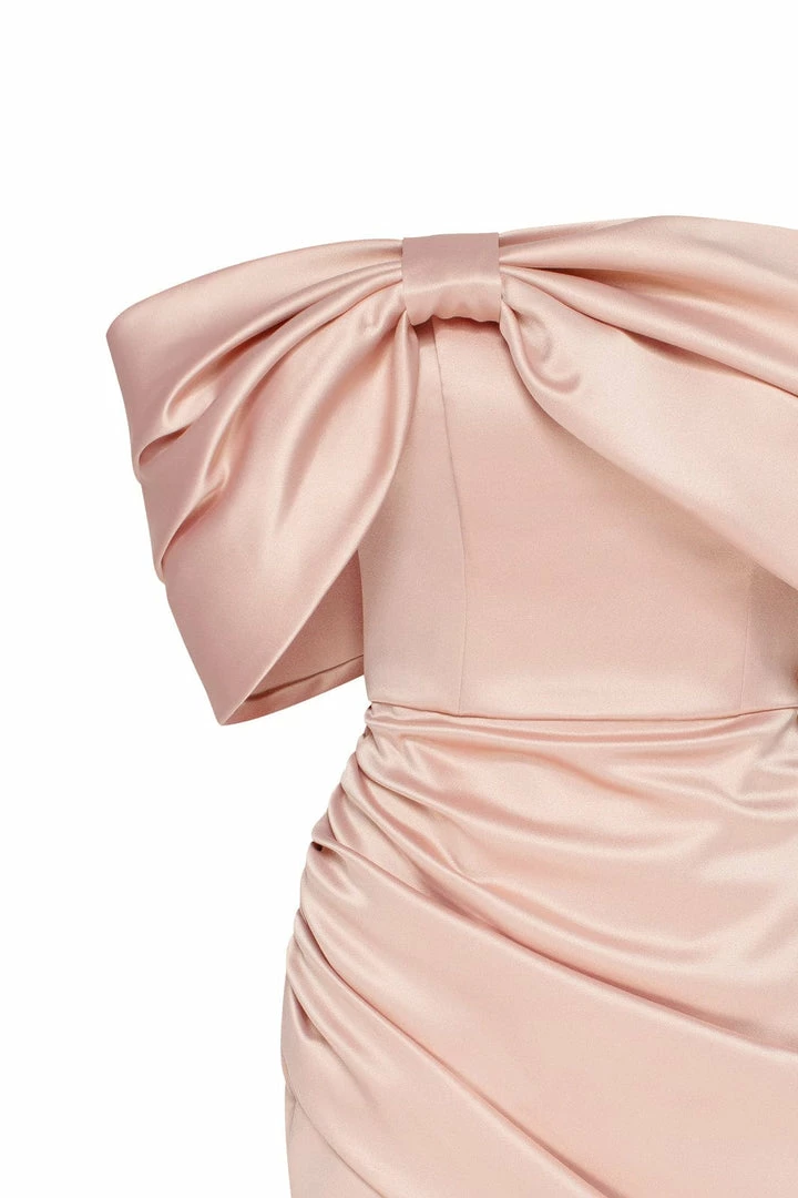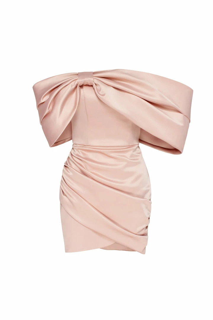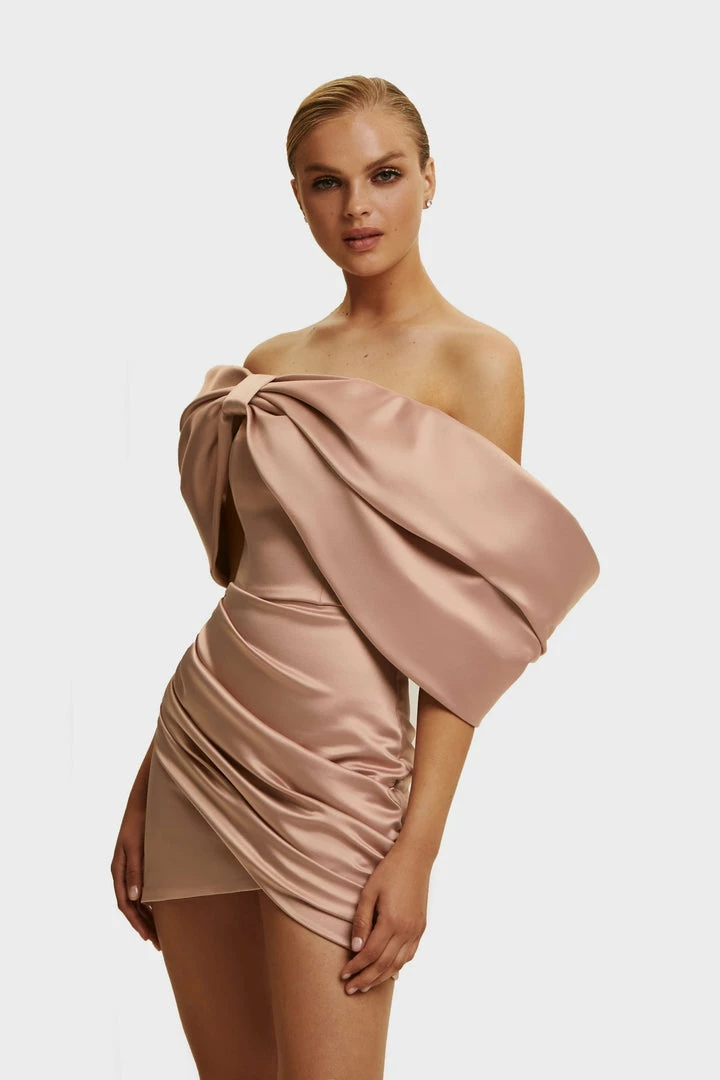 The bodice is designed with a gorgeous structured and ruched bow on the bust which flows onto the arms creating an off-the-shoulder three-quarter sleeve from elbow to middle of the arm. Wear it for the most gorgeous mini dress look ever.