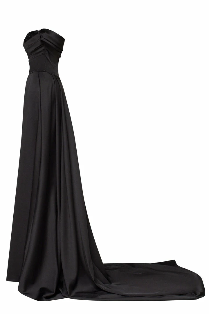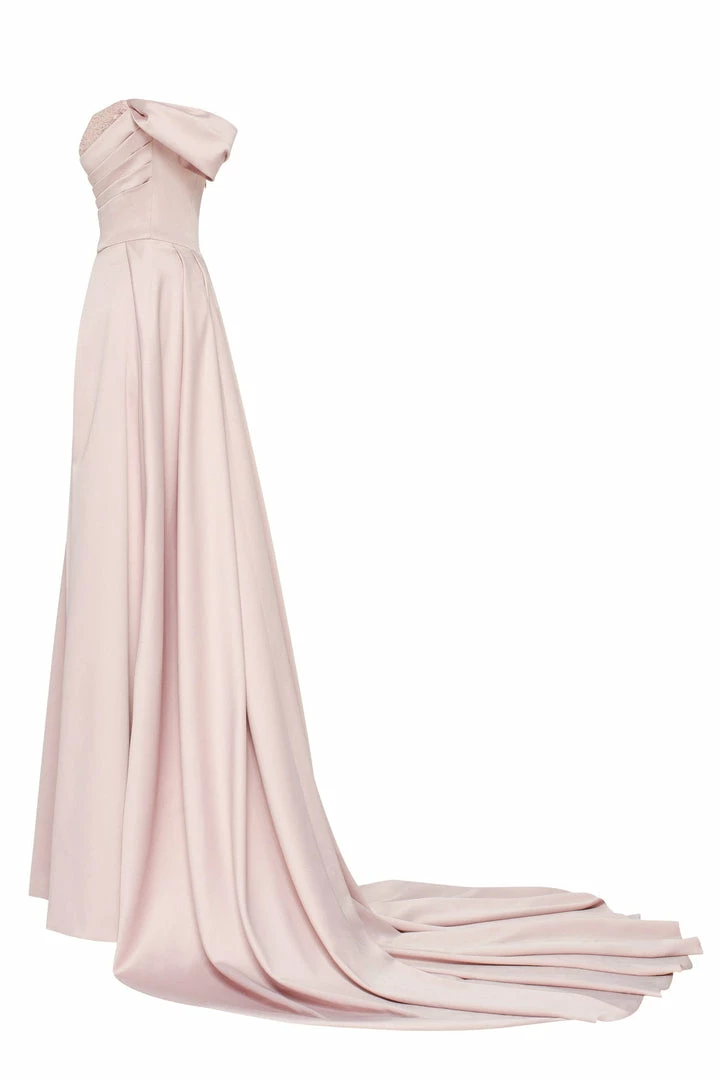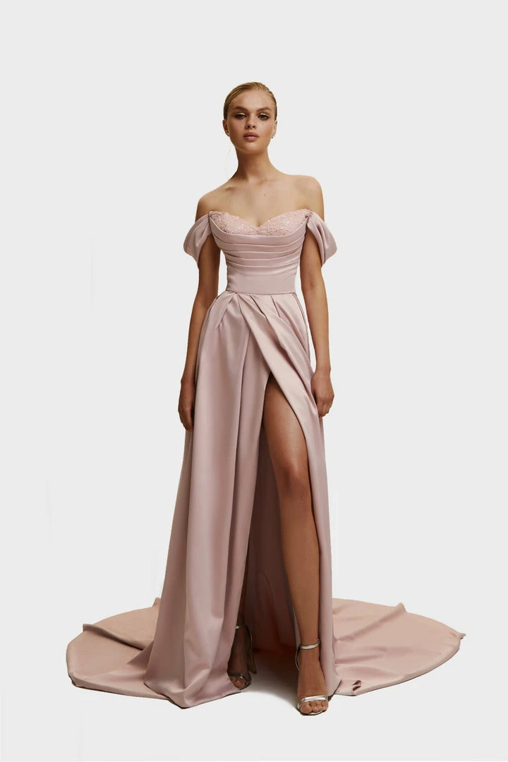 Such a romantic evening shirred dress! This amazing Milla evening princess gown dress features a heart-shaped neckline and ruched drop-shoulder sleeves. The bodice is sparkling beaded on top and ruched all over. The dress is designed from atlas and is fit and flare style. The back of the dress has a zip closure. The bottom of the evening dress is designed long maxi floor length with a short train on the back and wrapped asymmetrical design on the top of the skirt with a hidden thigh slit. This Milla evening dress is the epitome of grace and elegance.