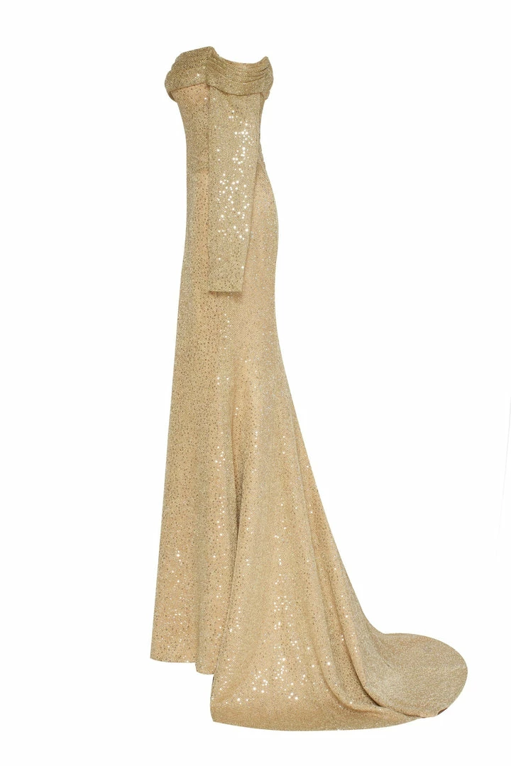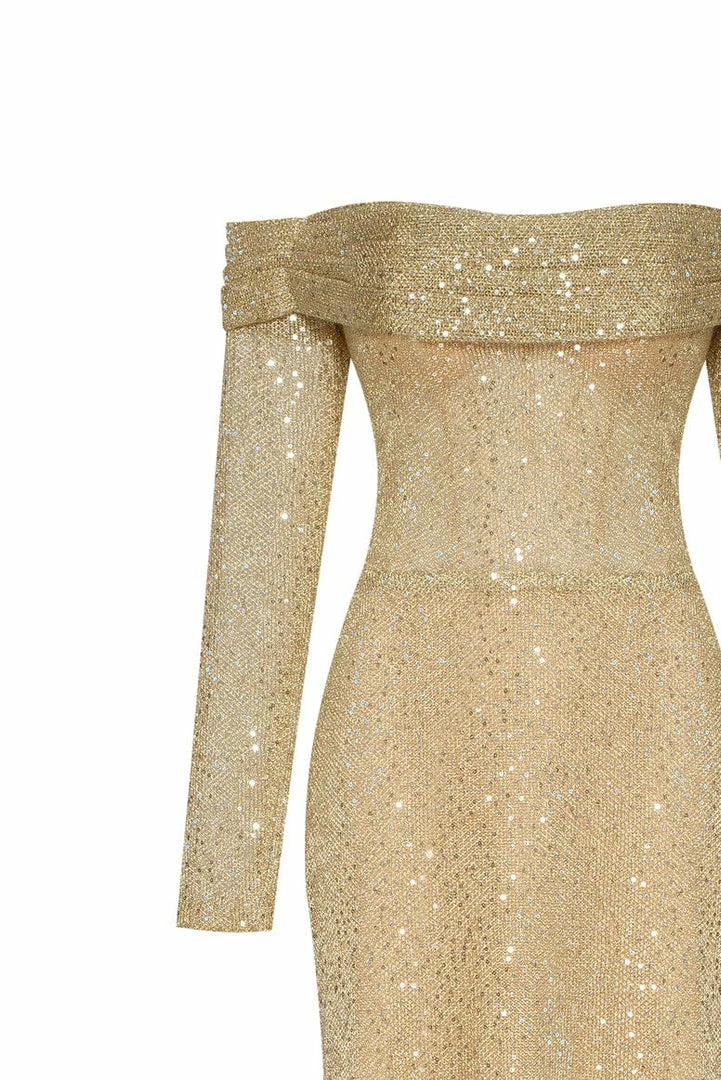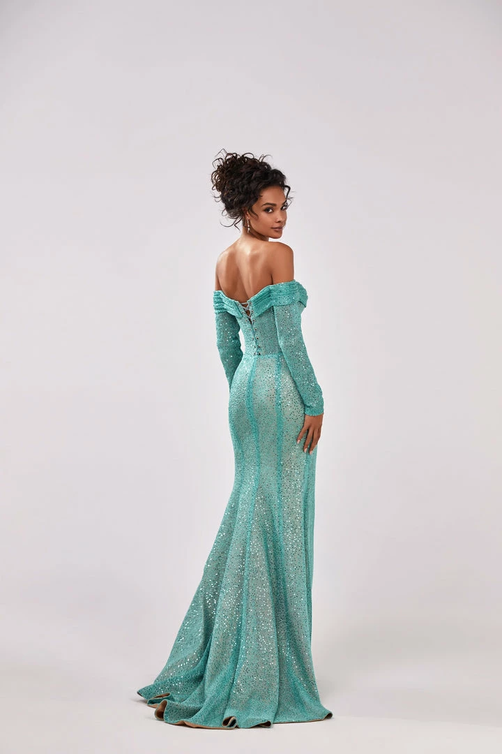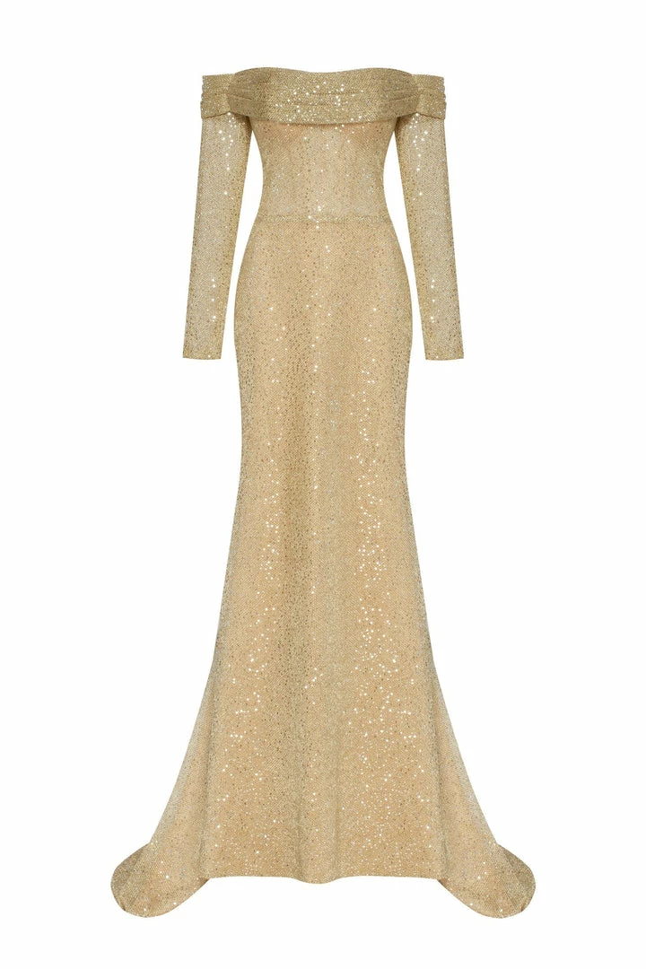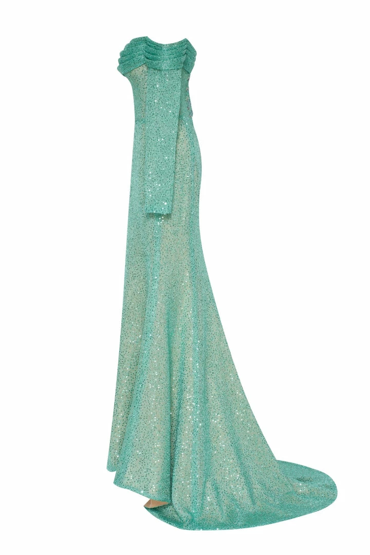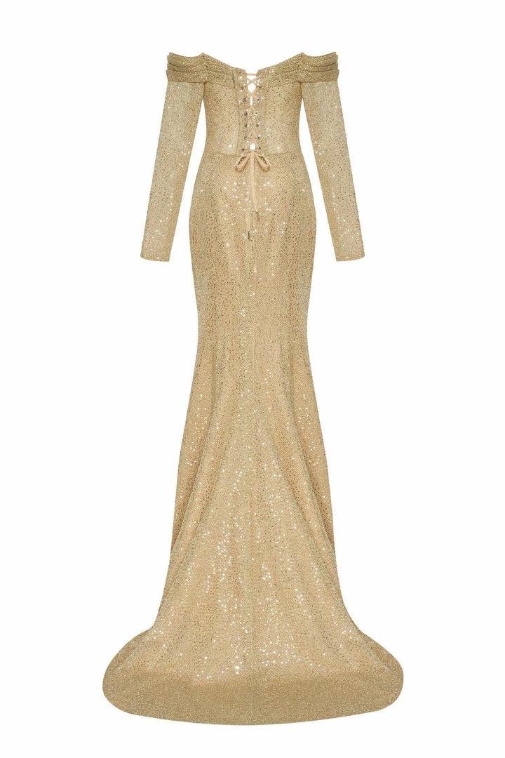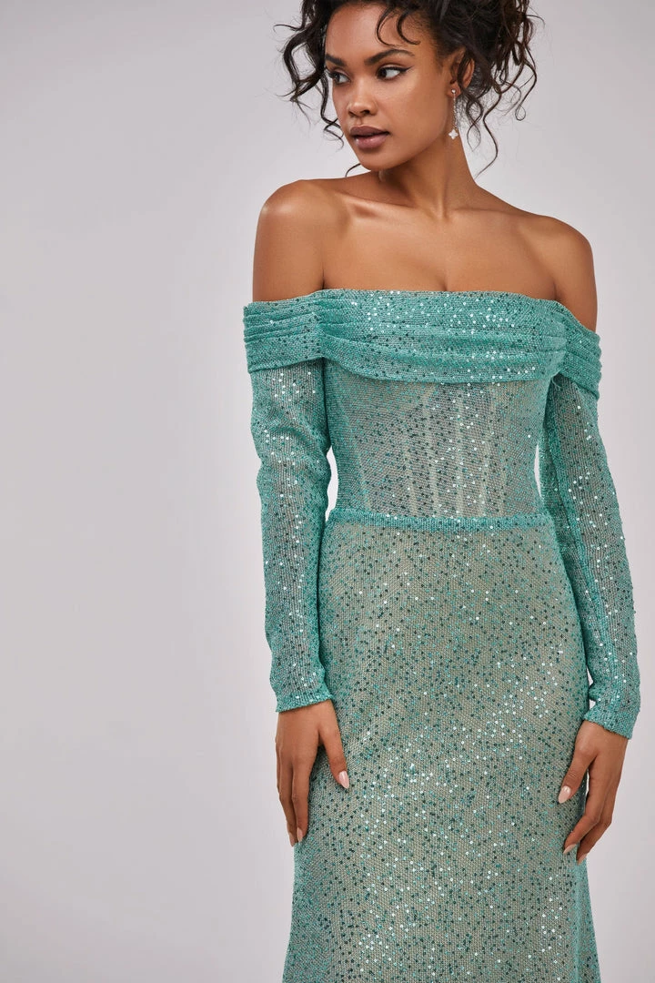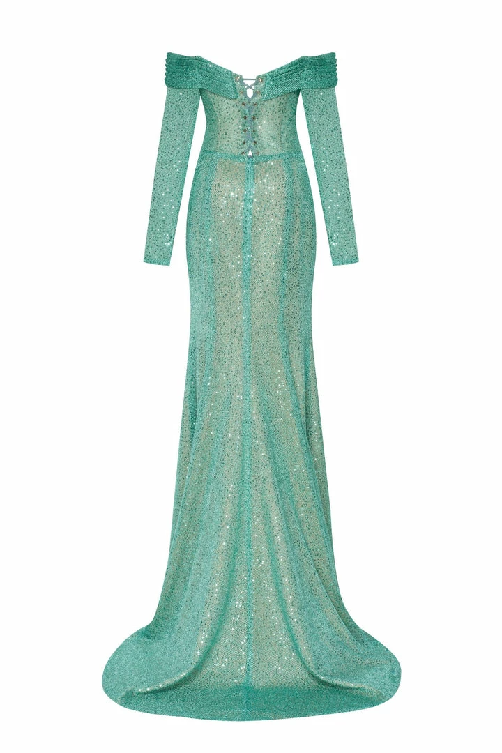 Long-sleeved sparkling evening dress with feminine off-the-shoulder neckline. The bodice has build-in corset with a laced-up back which makes it really fitted and elegant. The lovely fitted silhouette is designed to emphasize elegance of your figure. The dress goes in mint green and golden colours.