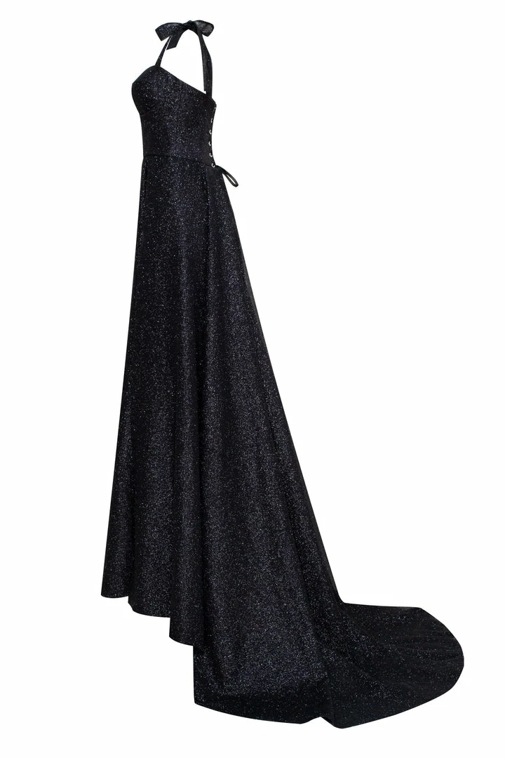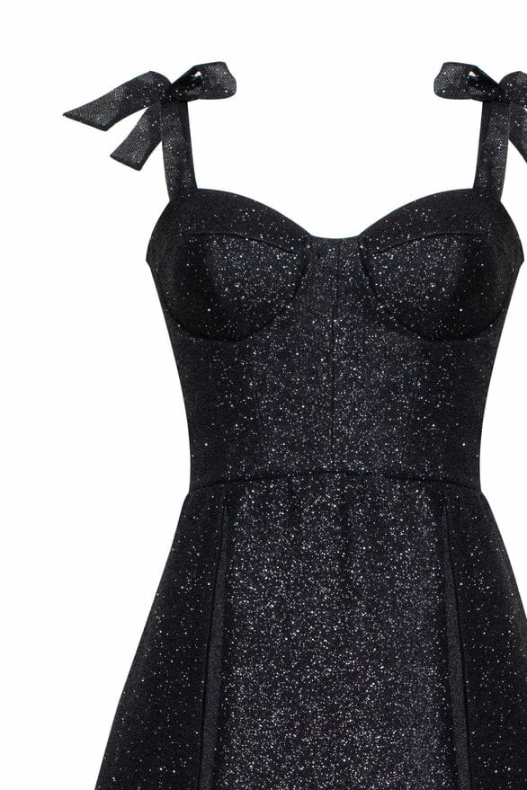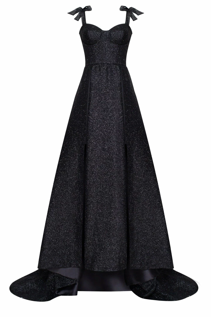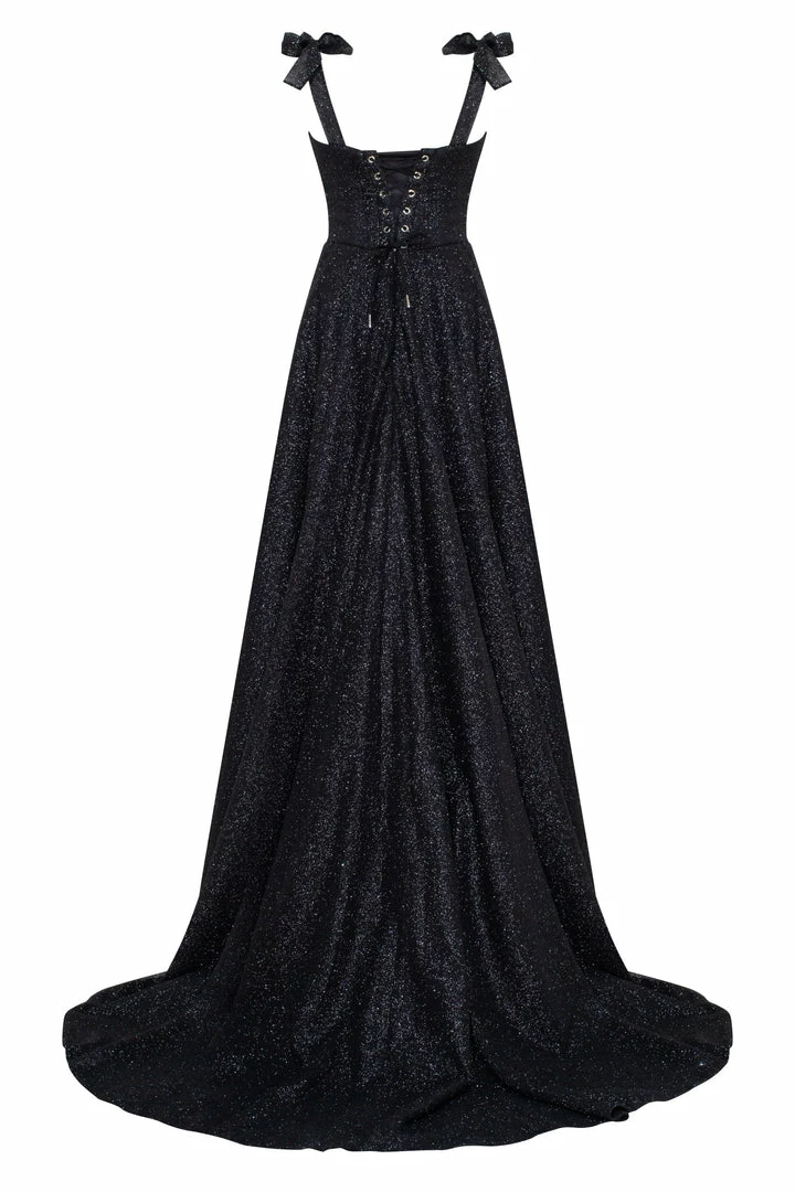 Gorgeous black tie evening gown in black. Designed from high-quality shimmering fabric. Features floor maxi length with ball gown skirt. The bodice features a heart-shaped neckline with delicate bow straps. The back of the dress is deep in a corset style.
