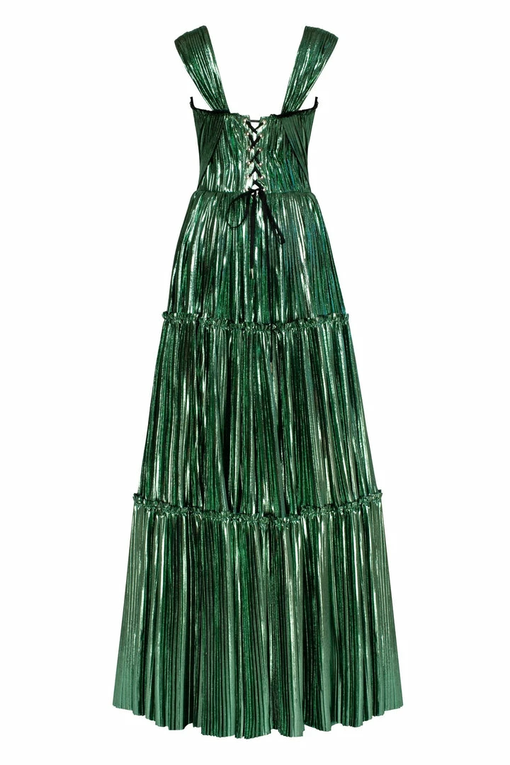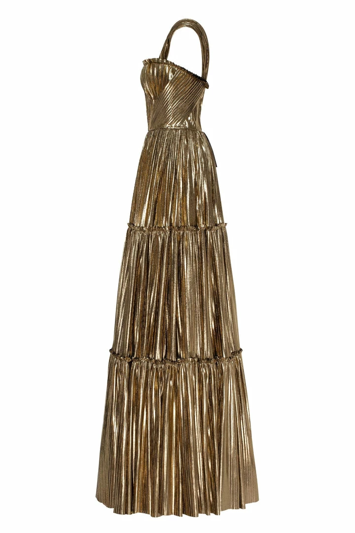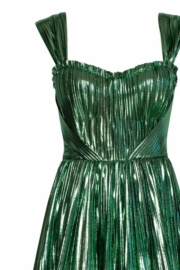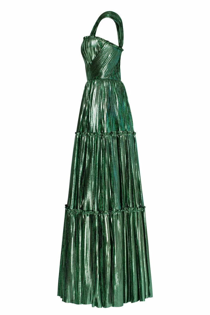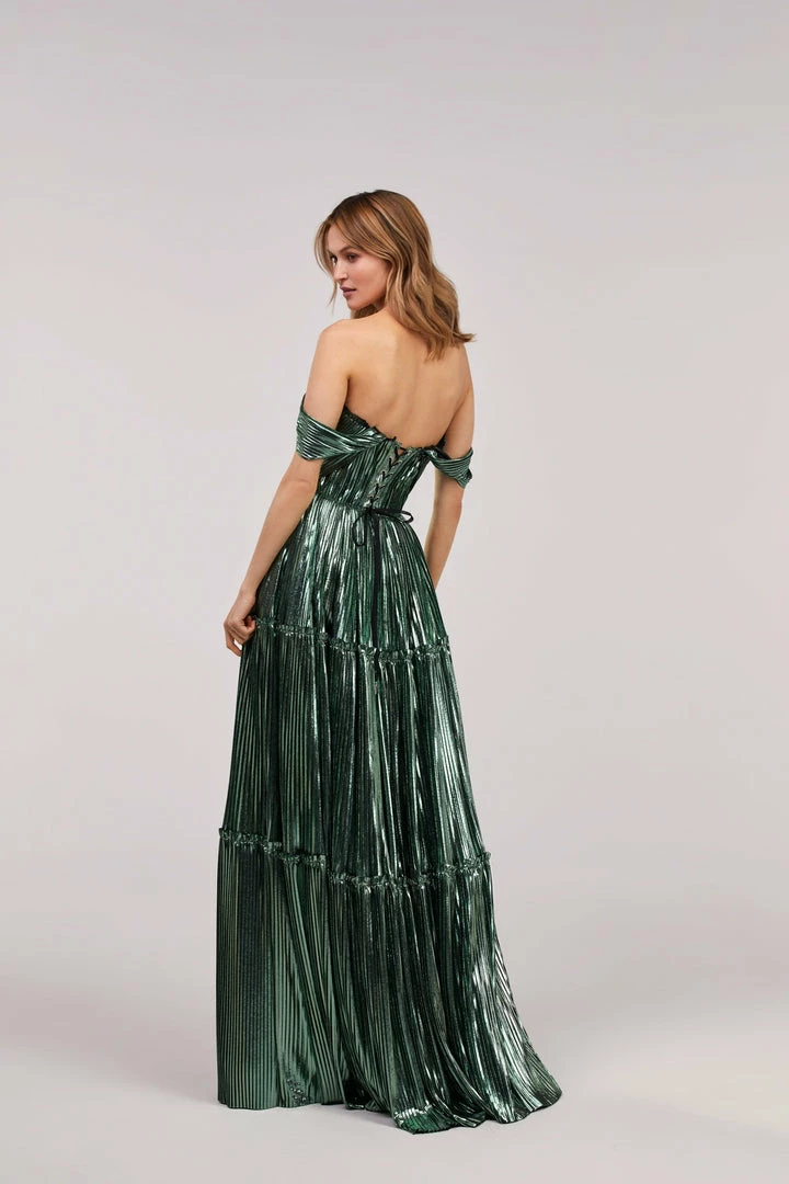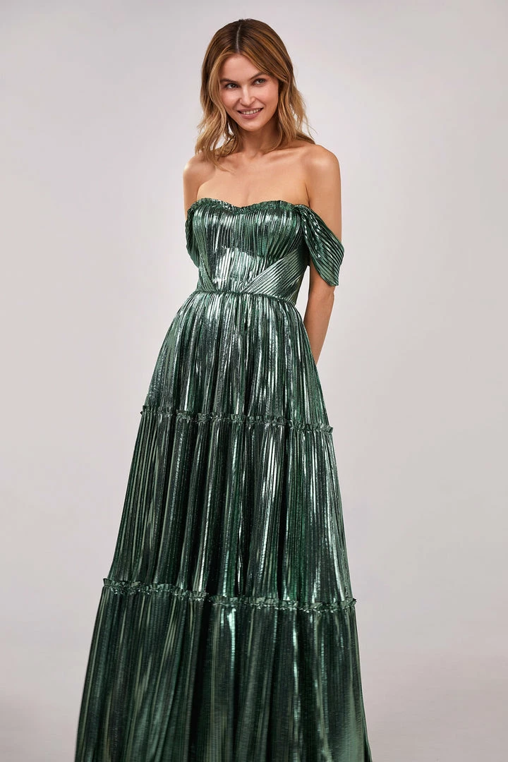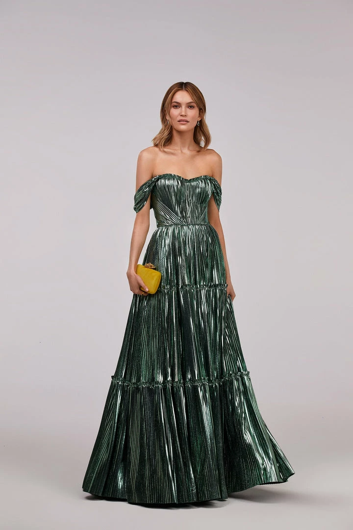 Gorgeous long dress made from pleats fabric. Designed with ‘queen Anne’ neckline type, could be worn both as off-shoulder and shoulder sleeves as well. Decorated with interesting fabric assembly at the waistline. The gown goes in two metallic colors: chrome green and golden.
