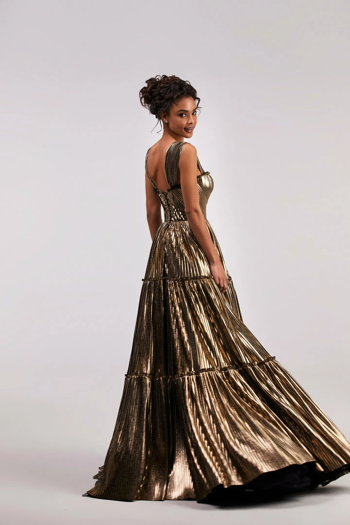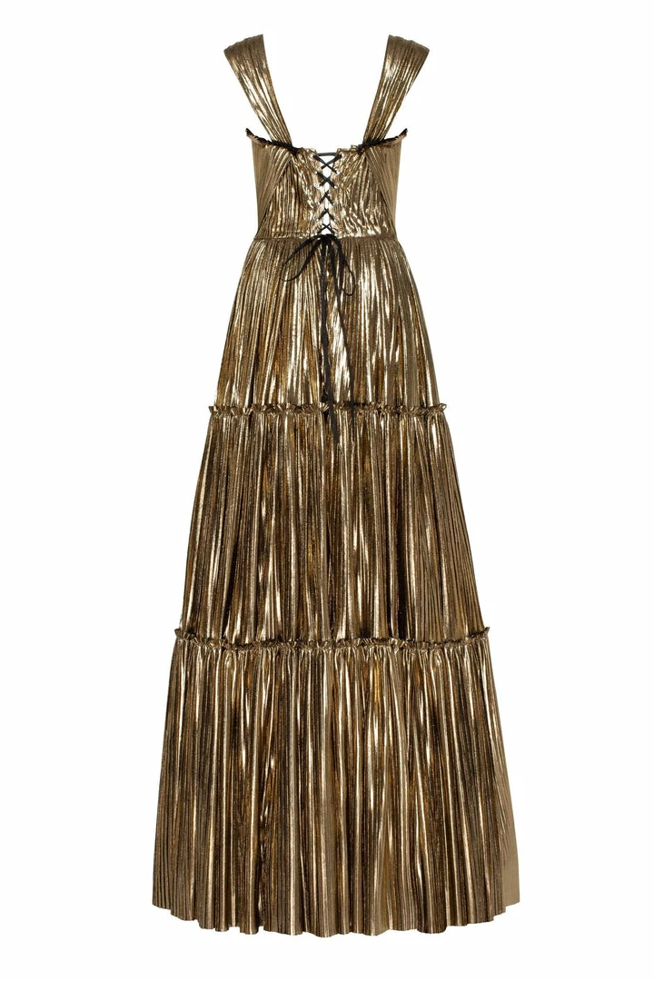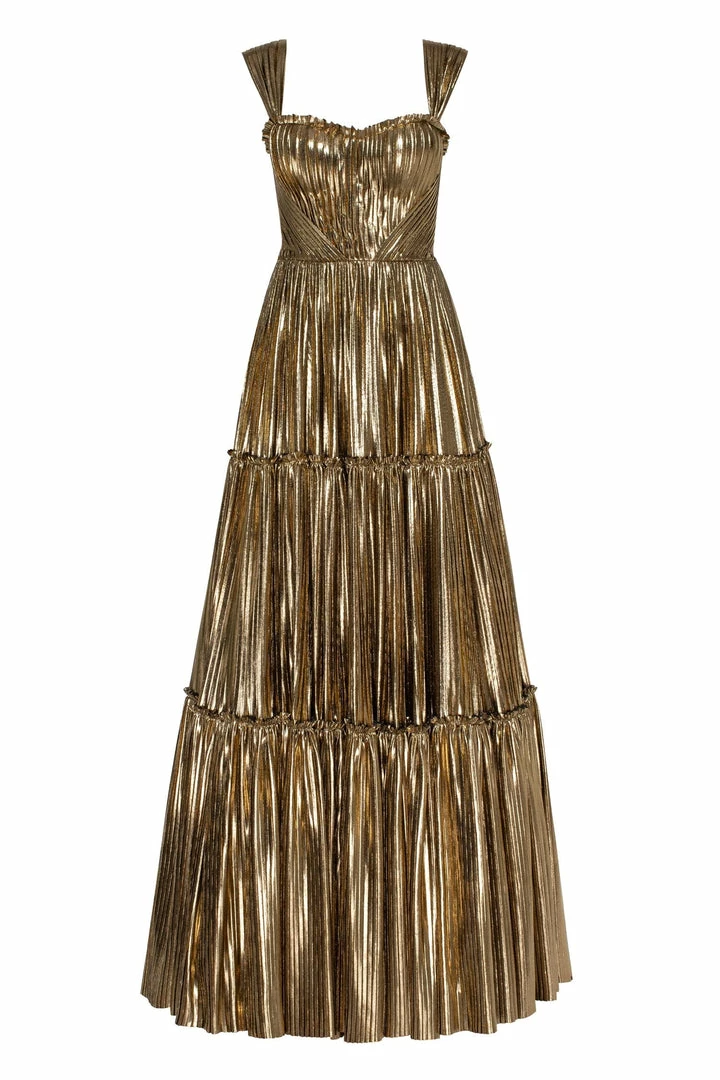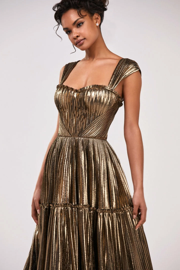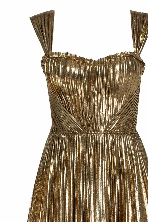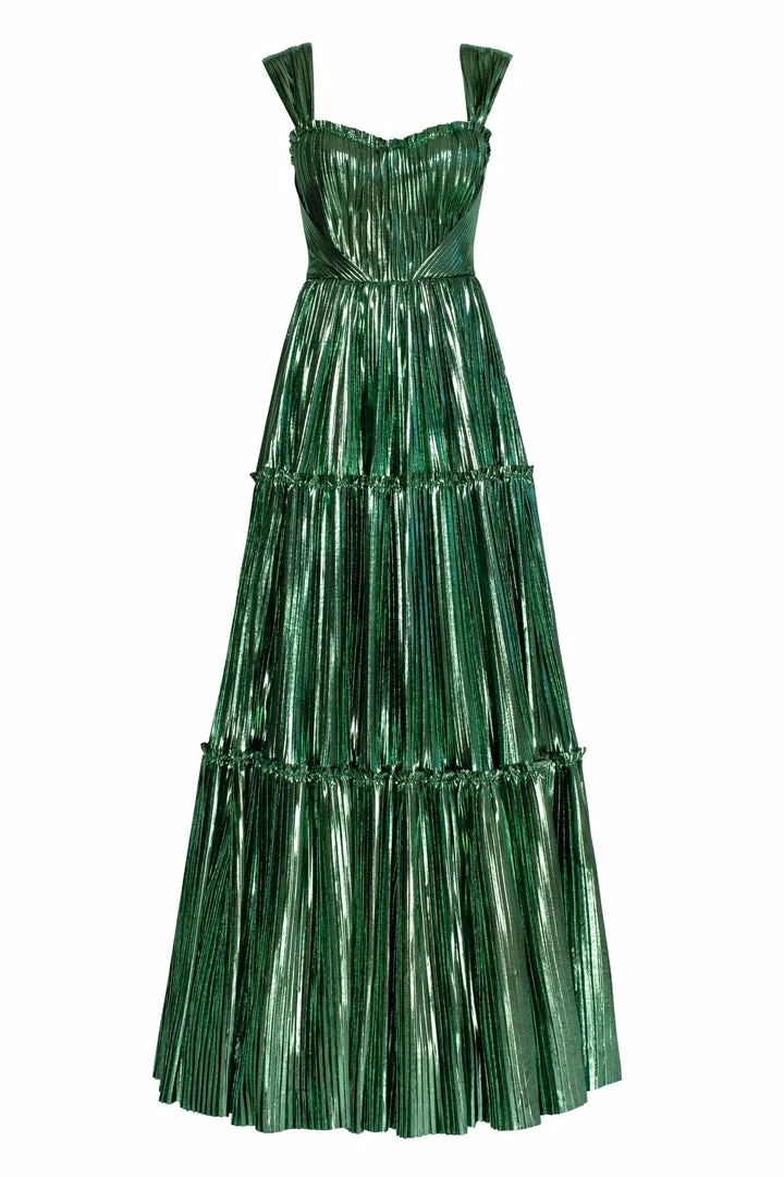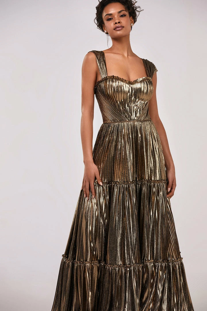 Gorgeous long dress made from pleats fabric. Designed with ‘queen Anne’ neckline type, could be worn both as off-shoulder and shoulder sleeves as well. Decorated with interesting fabric assembly at the waistline. The gown goes in two metallic colors: chrome green and golden.