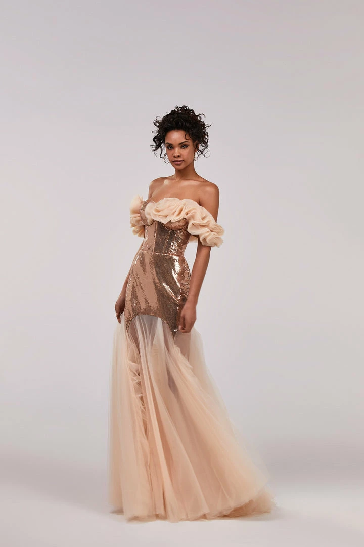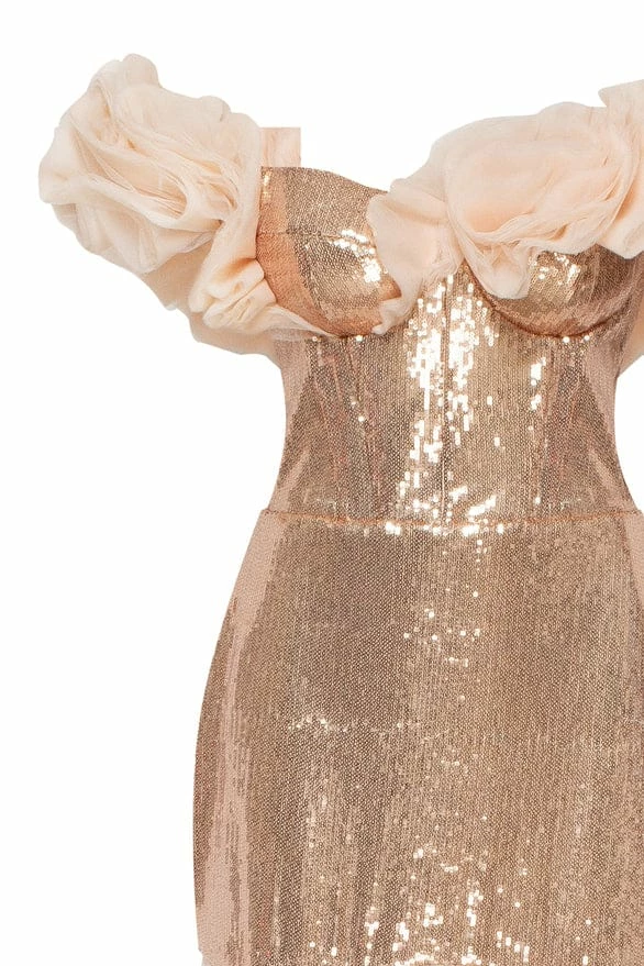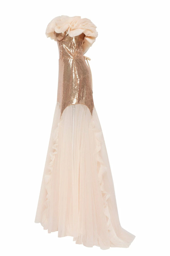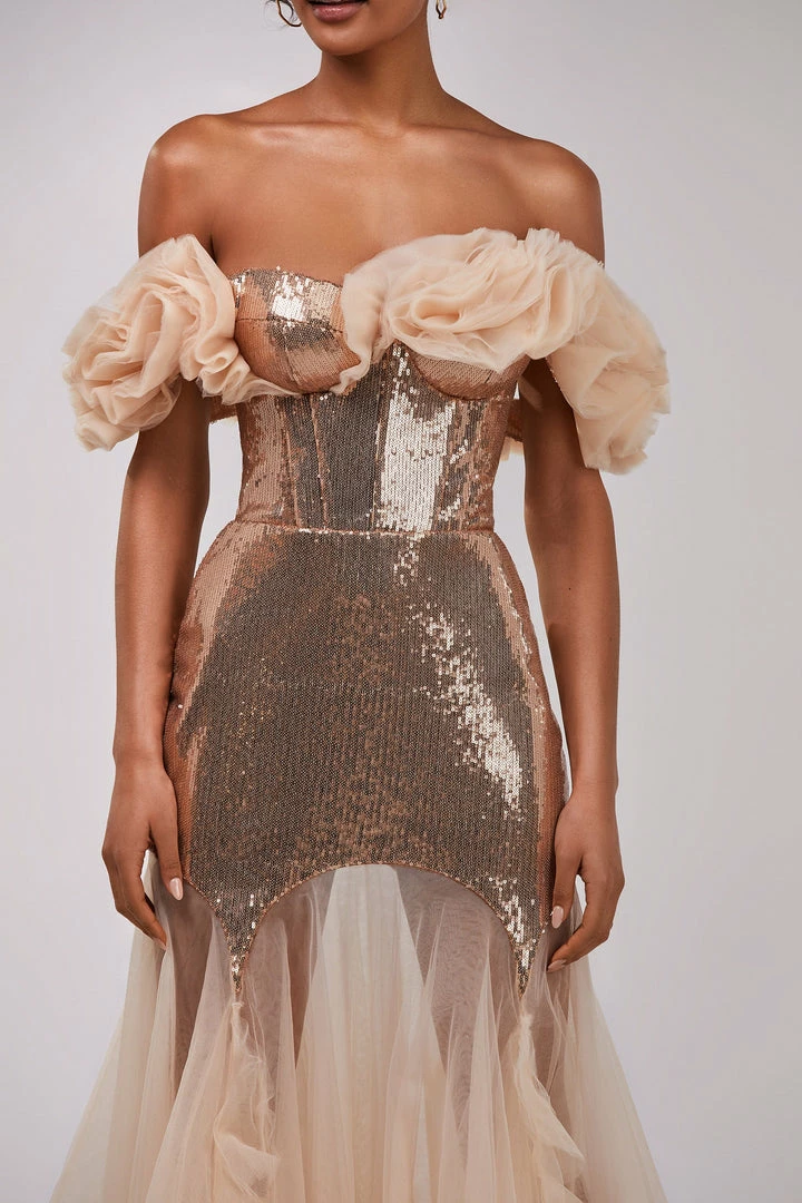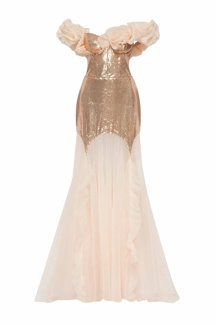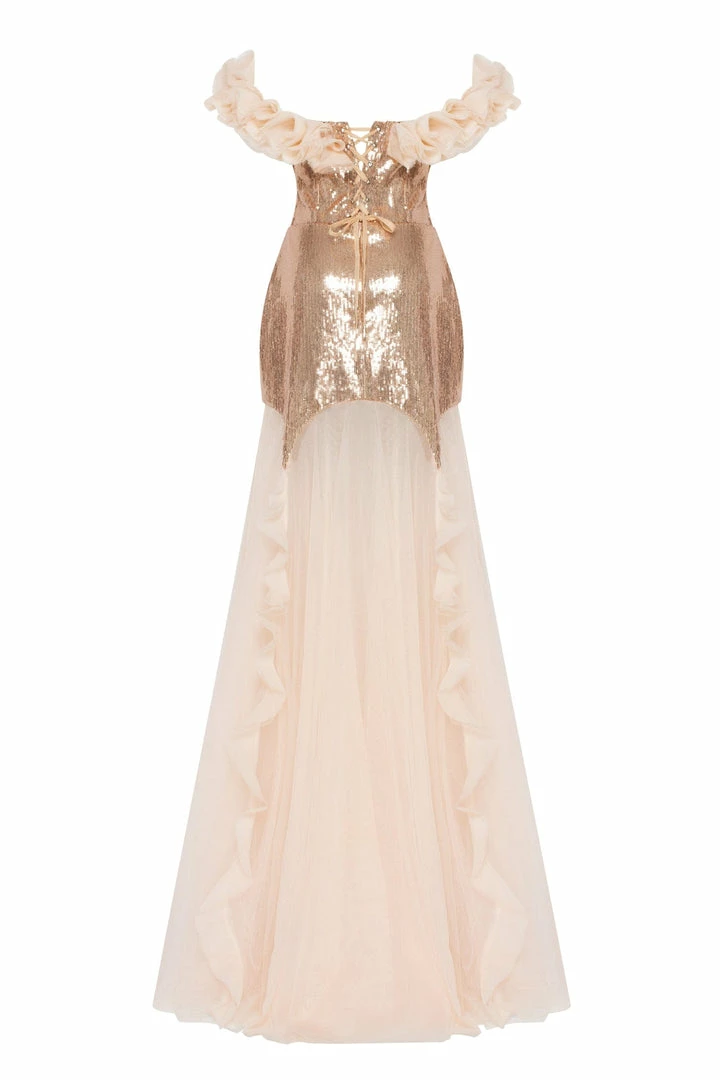 A dress that will make you shine! Designed from sparkling golden sequin fabric and tender high-quality tulle. The mini sequin part will make you shine while the maxi long tulle skirt will make you look lightweight. The bodice features elegant off-the-shoulder sleeves made from draped tulle and lace-up closure. The dress is designed to fit the body. Choose this evening dress to be in the spotlight at a special event.