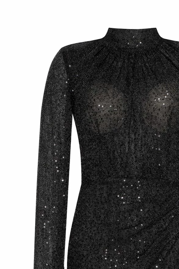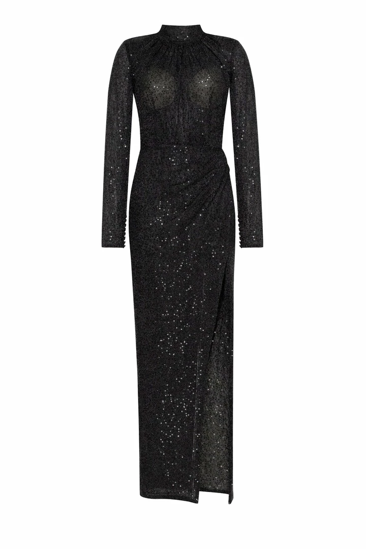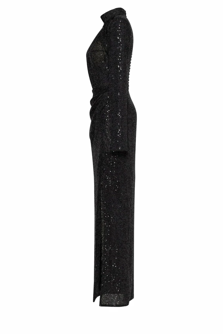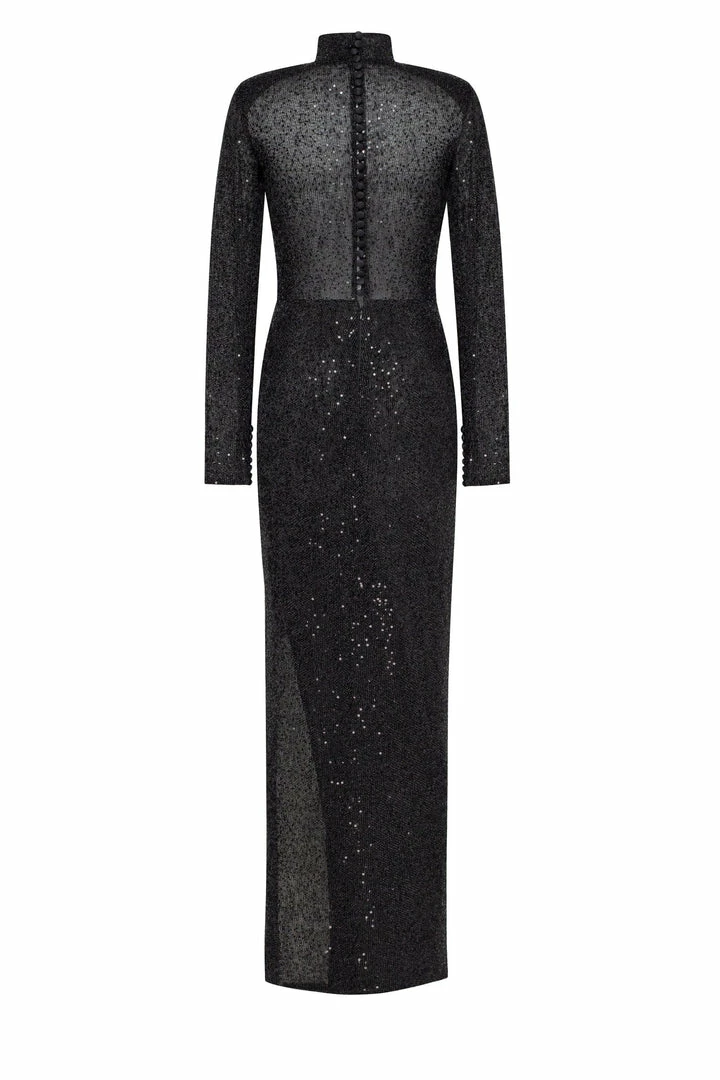 Long evening dress with long sleeves and high neck. Designed from high-quality sparkling fabric. Features illusion under the neckline, button back, and bottom buttons on the sleeves. Modest and elegant model.