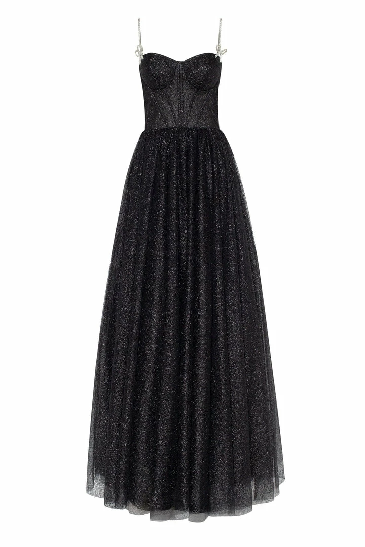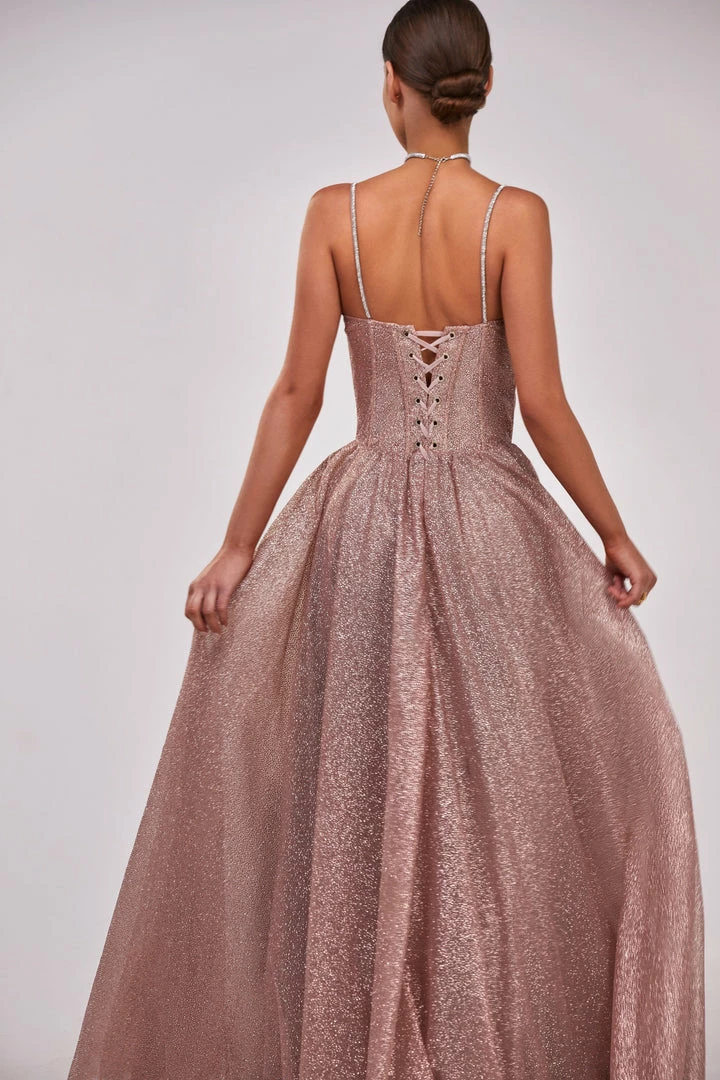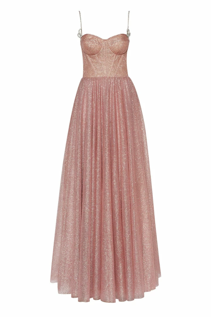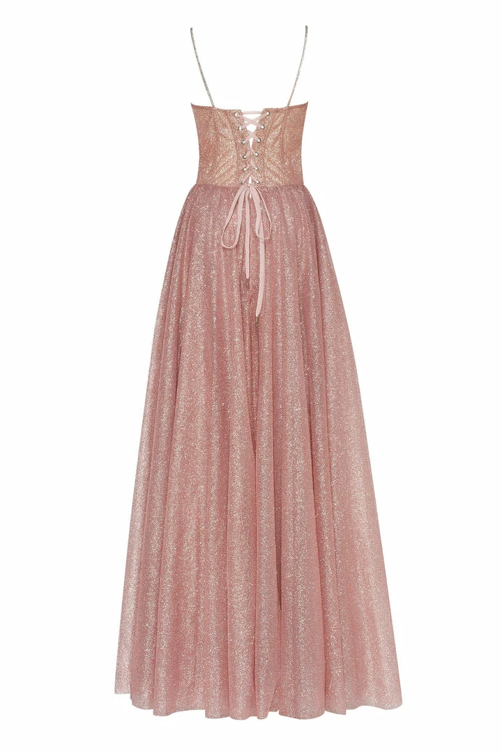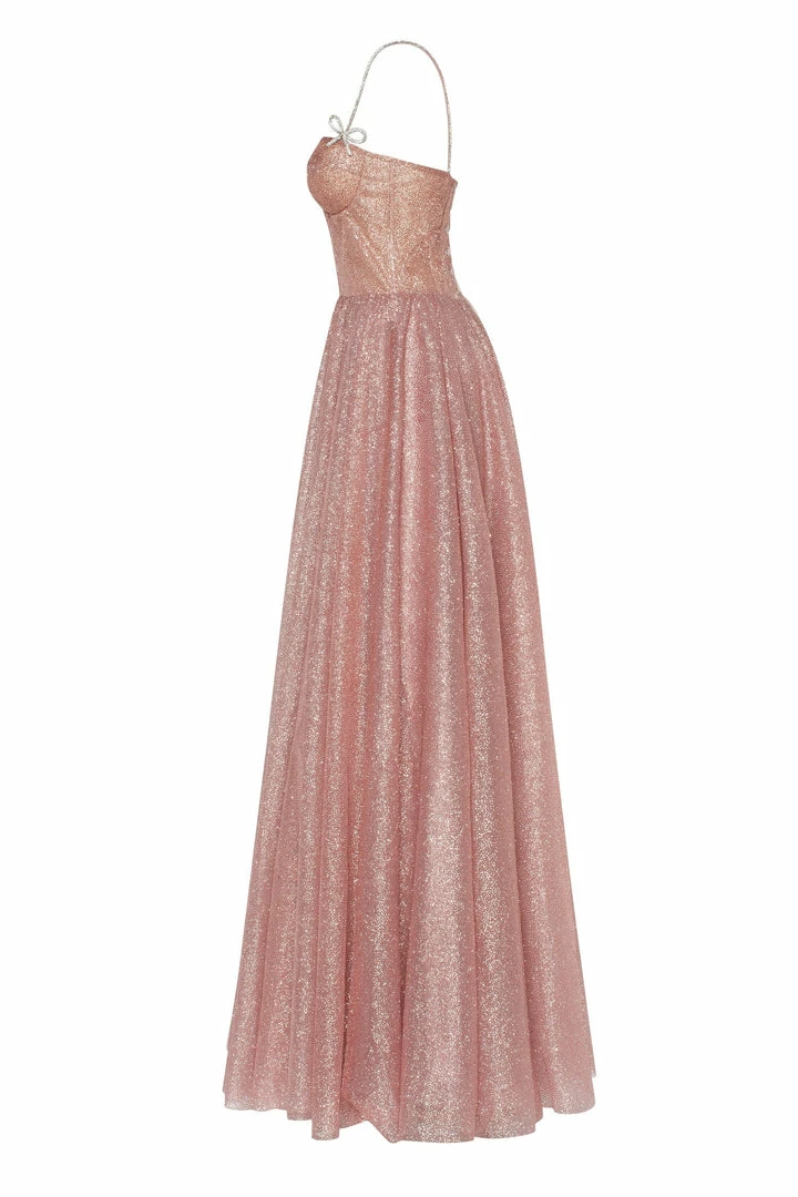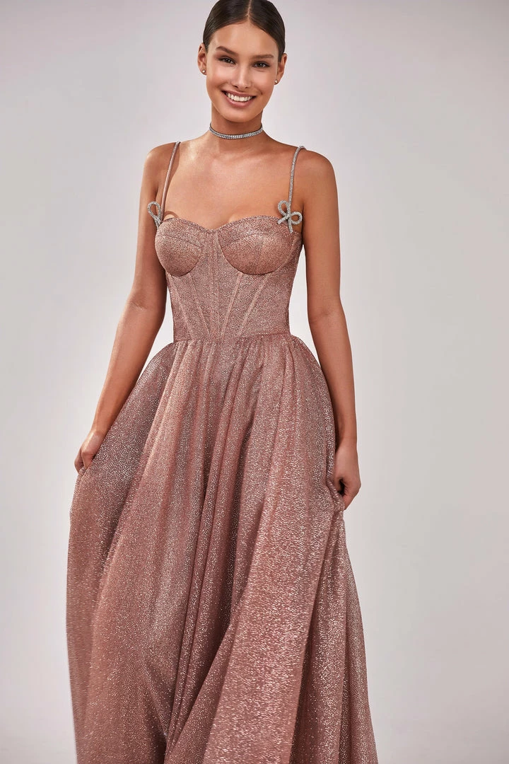 This Milla evening maxi gown is simple and still very chic, designed both for teens and adult girls and women. Made from high-quality glitter, the dress could be the sparklest dress in the world. Features bodice with corset and lacing up, decorated with small rhinestones and a bow spaghetti straps, and heart-shaped neckline. Available in two colors: black and misty rose.