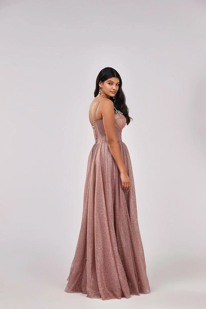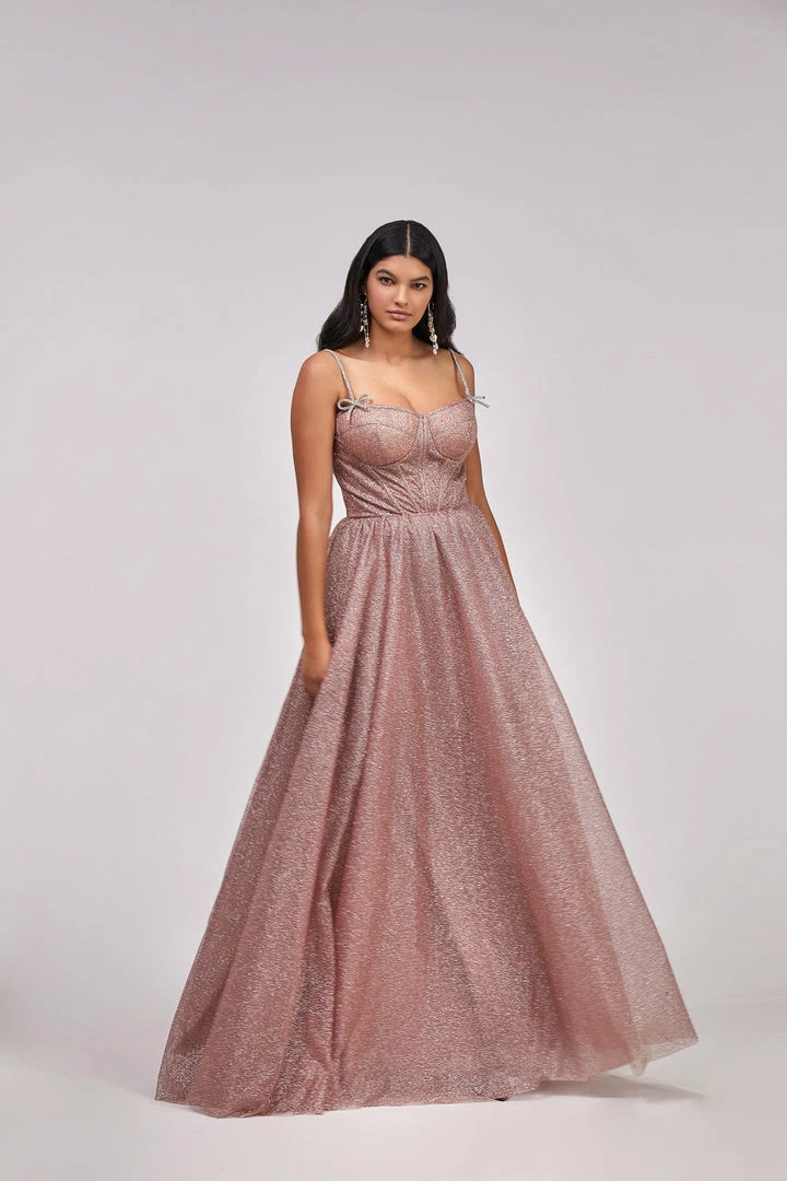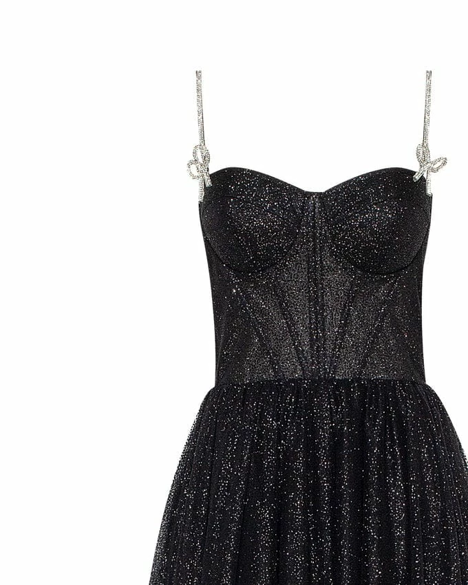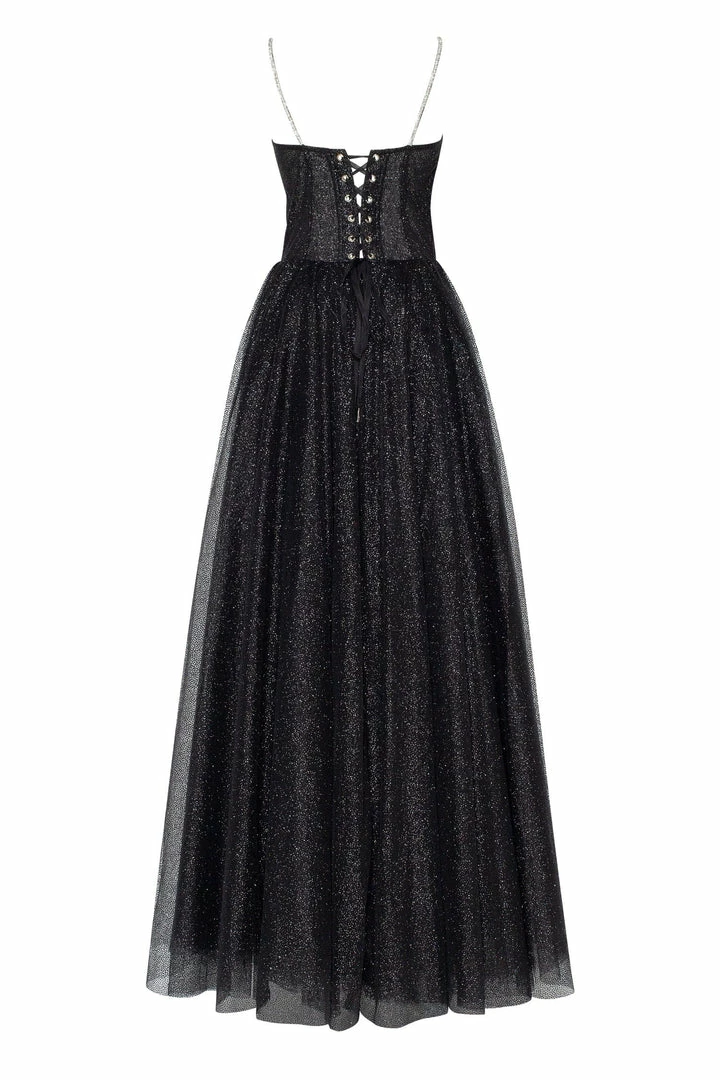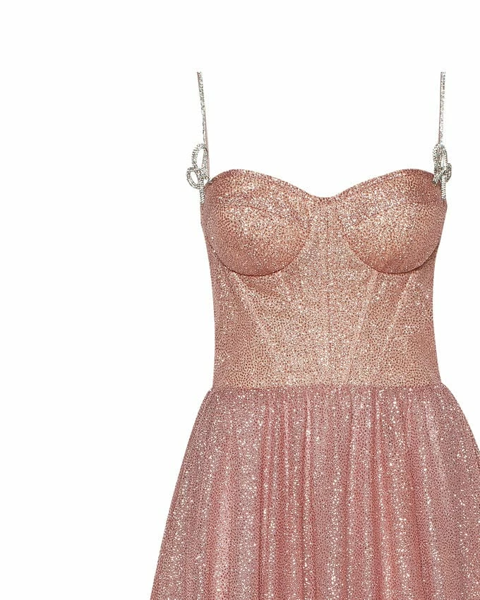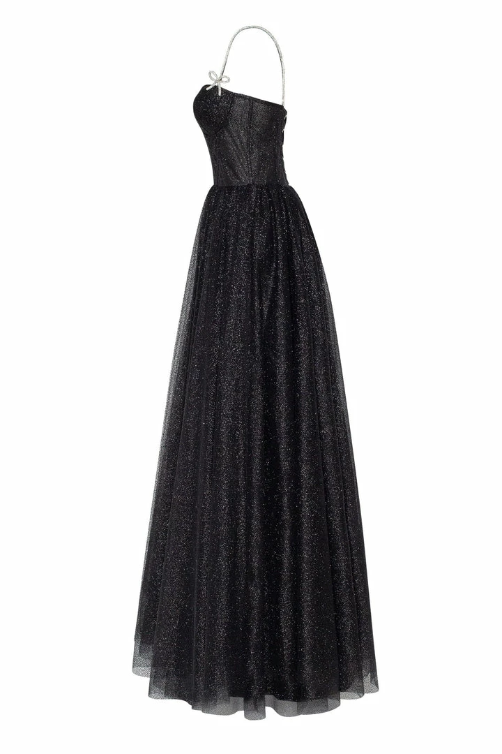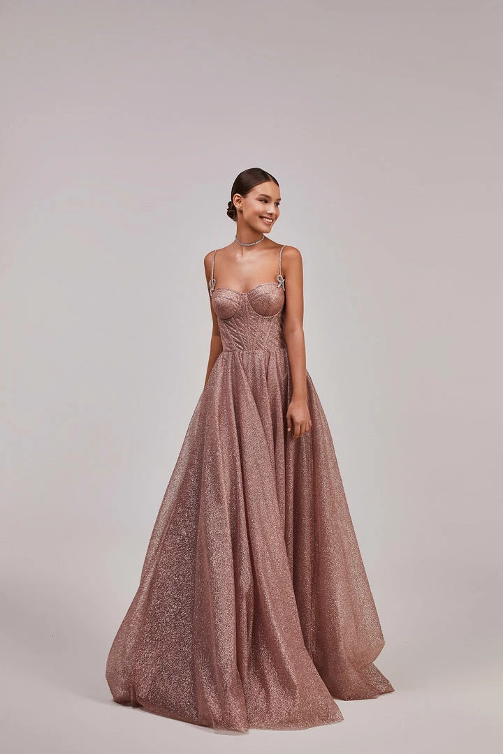 This Milla evening maxi gown is simple and still very chic, designed both for teens and adult girls and women. Made from high-quality glitter, the dress could be the sparklest dress in the world. Features bodice with corset and lacing up, decorated with small rhinestones and a bow spaghetti straps, and heart-shaped neckline. Available in two colors: black and misty rose.