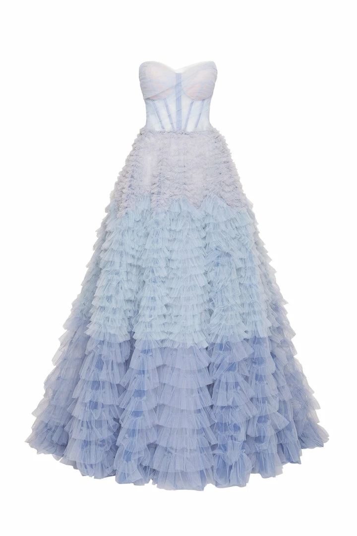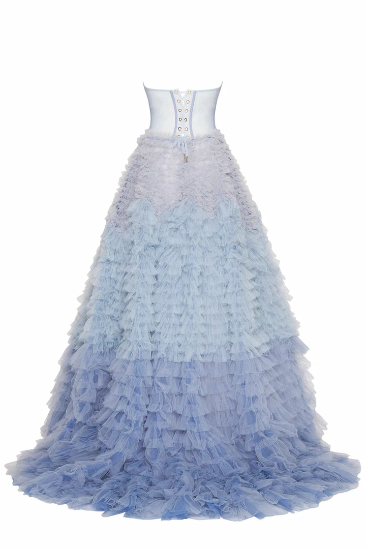 Strapless frill-layered evening tulle sky blue dress. Features a semi-transparent corset with built-in cups, frill-layered maxi skirt, and the train.
