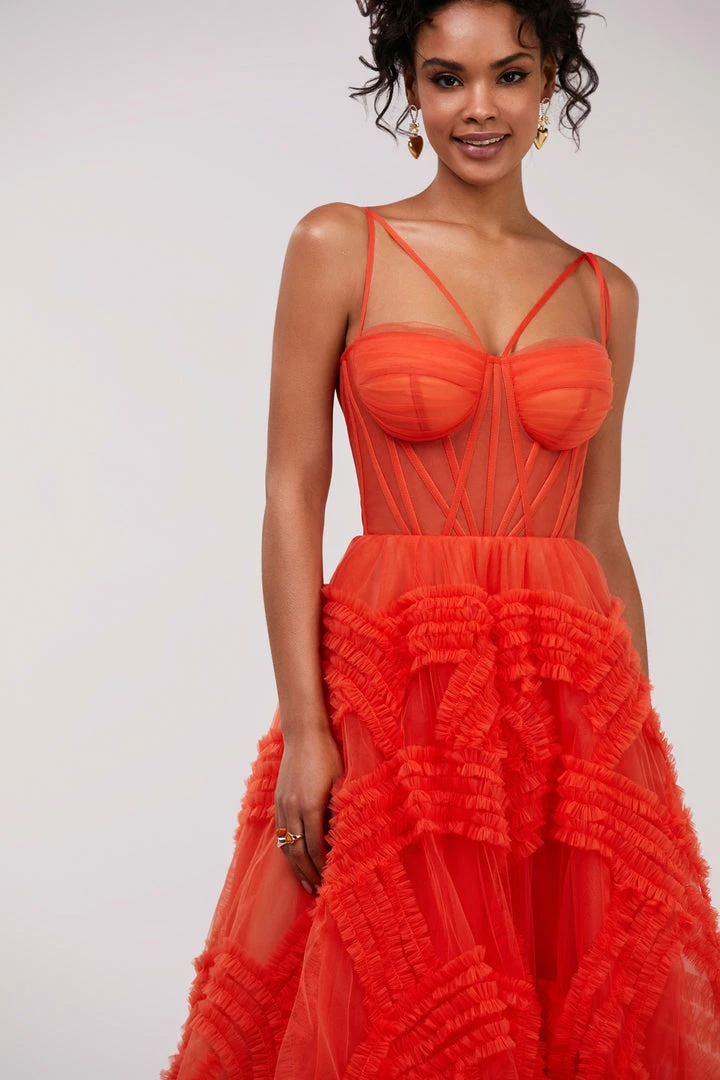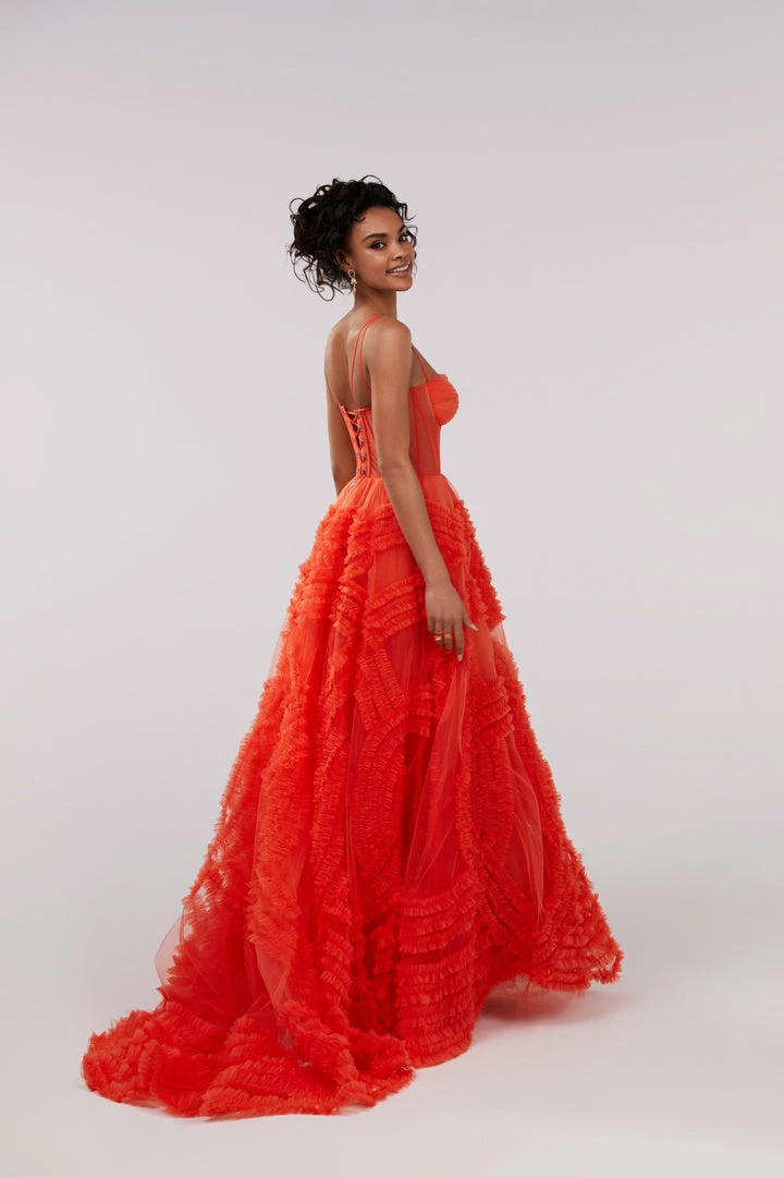 Girlish ruffled evening tulle prom dress with a semi-transparent corset bodice and a full tulle maxi skirt. Designed in geometric ornament style, it gives a vibe of friskiness and lightness, and at the same time the feel of lush. Features a train and double straps. Amazing bright tangerine color will have you feeling young, brave, and confident. Gown is a perfect look for any kind of occasion.