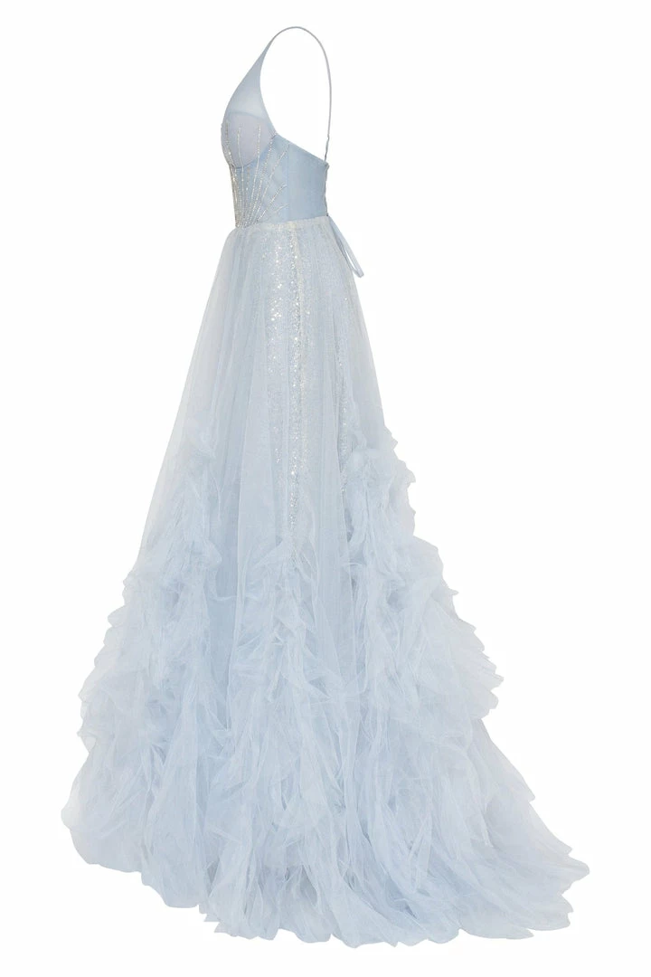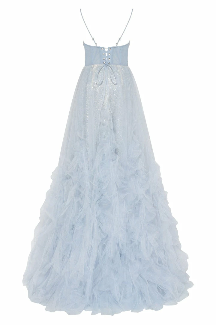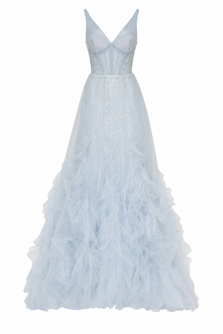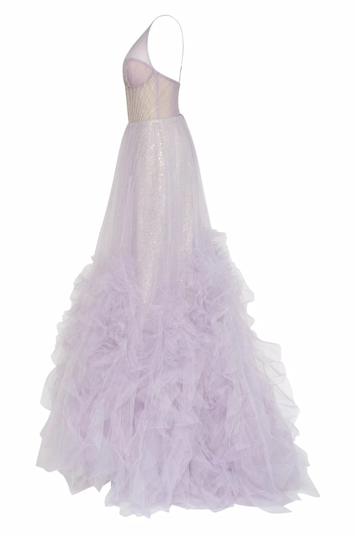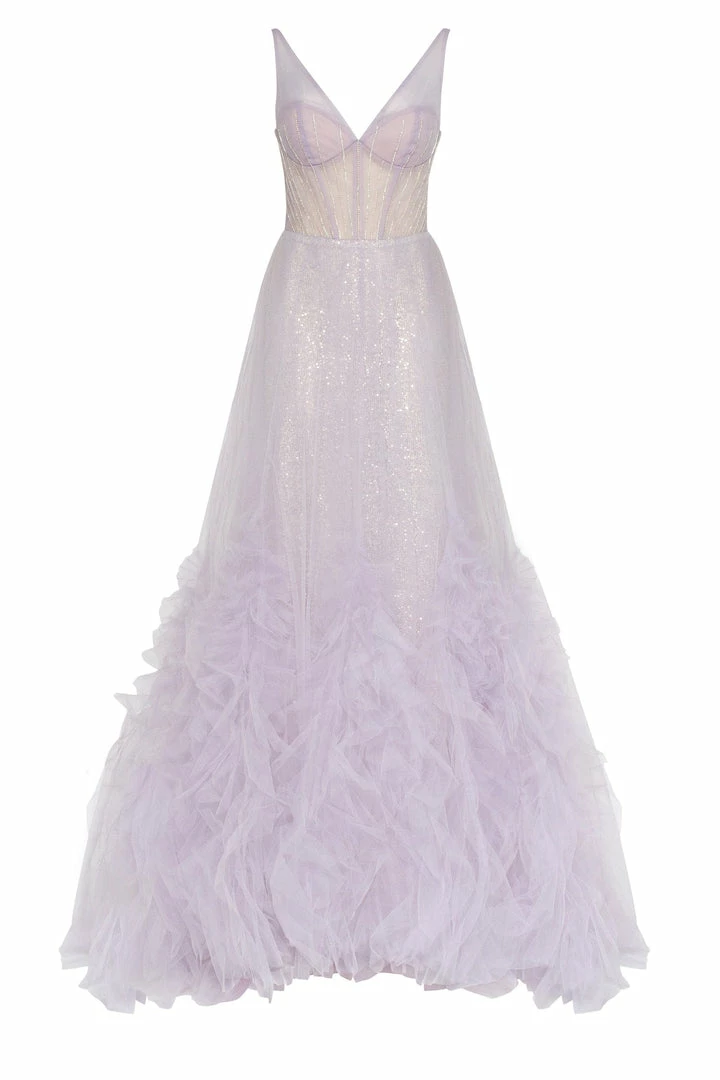 This evening tulle prom dress features tender tulle straps which make the gown look even more romanticand elegant. The bodice of the evening dress is designed like a corset with inserted bra and sparkling hand-made embroidery. Evening gown goes in maxi floor-length with a ruffled tulle on the skirt. With the help of a corset, you can make your dress loosely fitting or tight-fitting on a demand The evening dress gown from Milla goes in two colors: lavender and light blue.