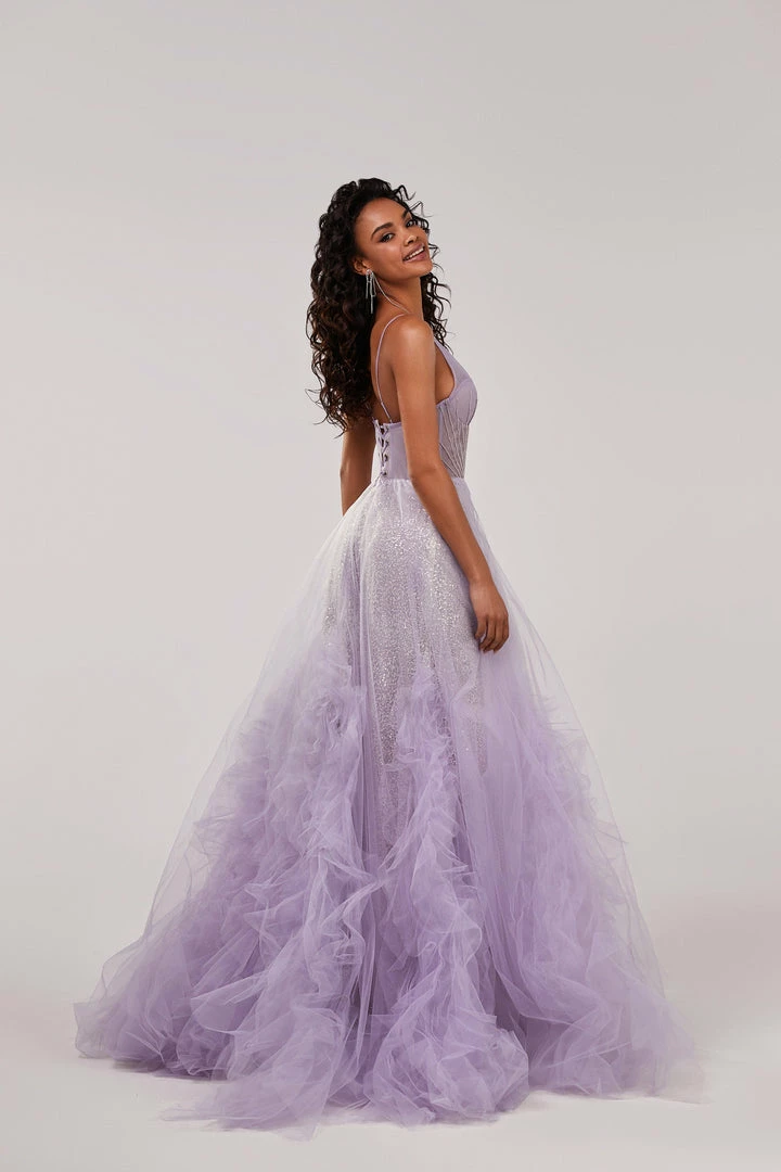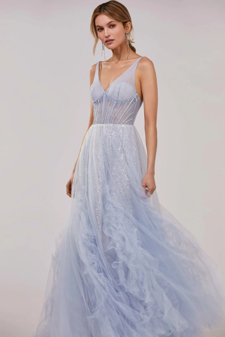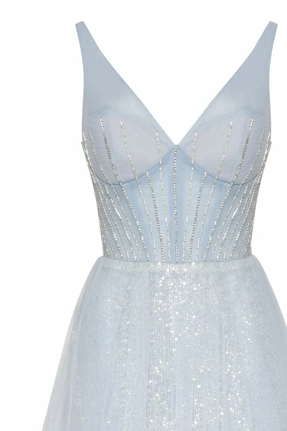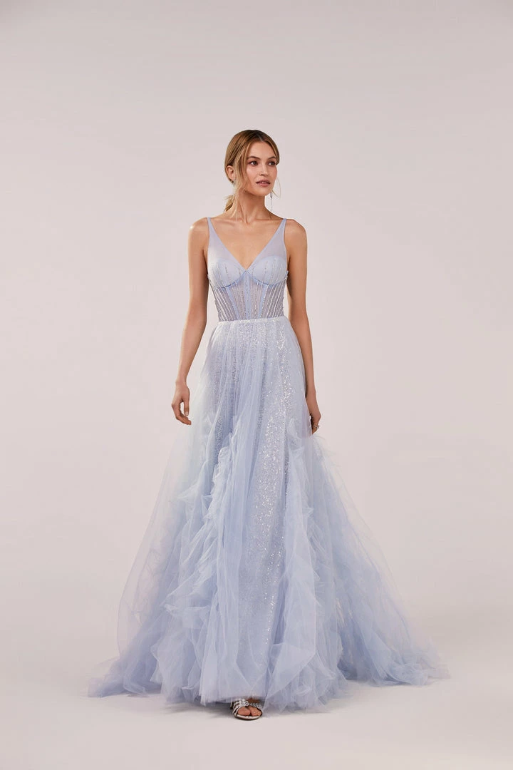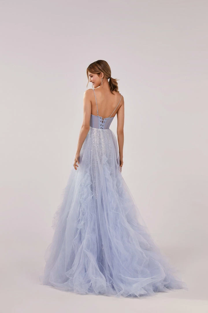 This evening tulle prom dress features tender tulle straps which make the gown look even more romanticand elegant. The bodice of the evening dress is designed like a corset with inserted bra and sparkling hand-made embroidery. Evening gown goes in maxi floor-length with a ruffled tulle on the skirt. With the help of a corset, you can make your dress loosely fitting or tight-fitting on a demand The evening dress gown from Milla goes in two colors: lavender and light blue.