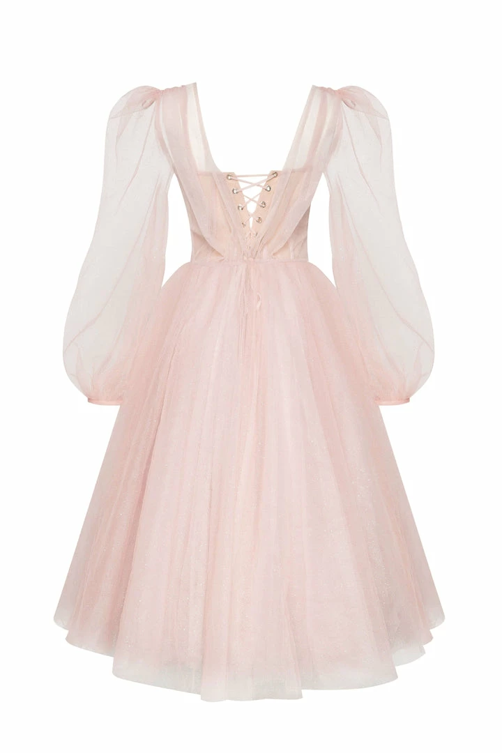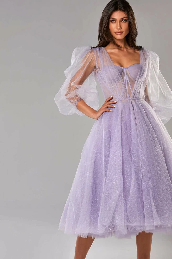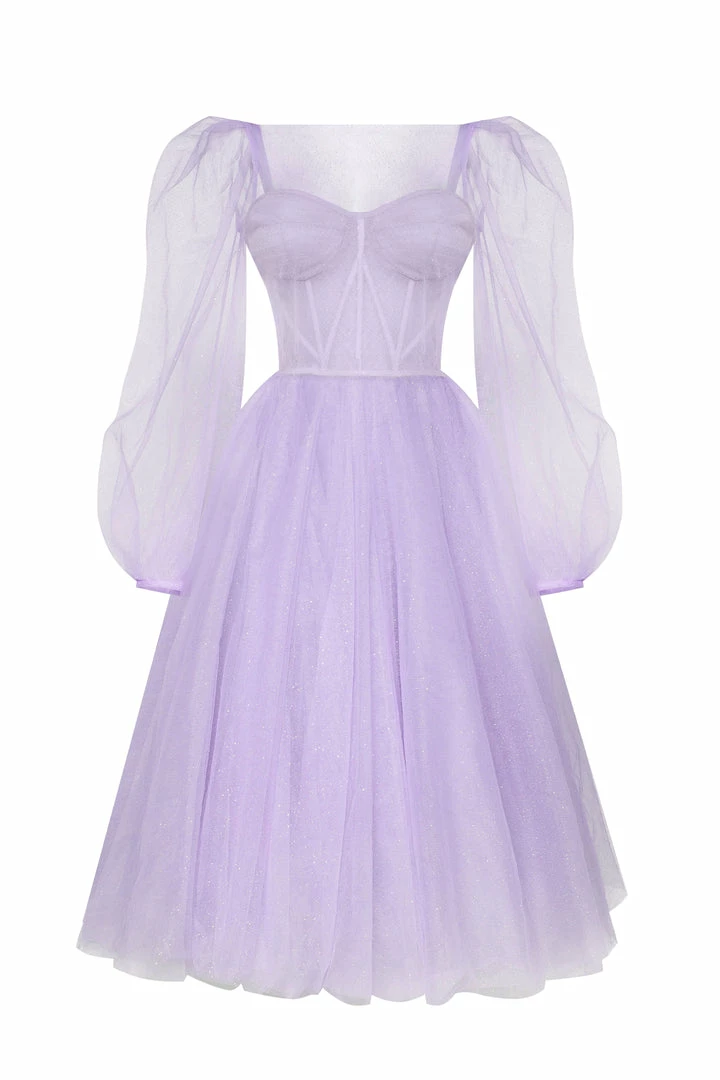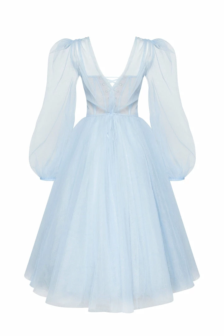 This stunning corset dress with a puffy skirt has build-in cups and bones. The back of this evening gown is designed with lacing, which covers by a detachable sheer long-sleeved cape. It can be ordered in three colors such as lavender, misty rose and light blue.