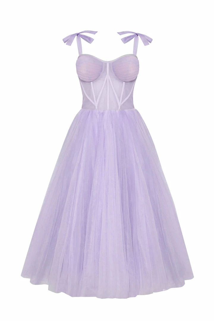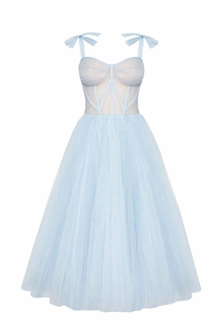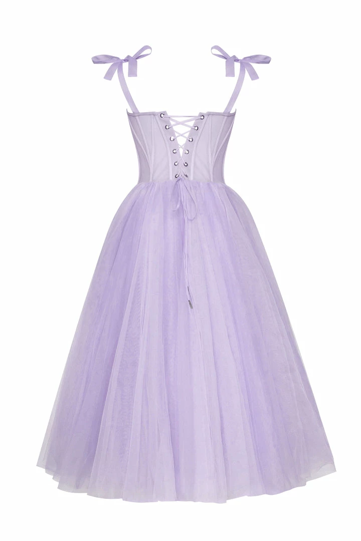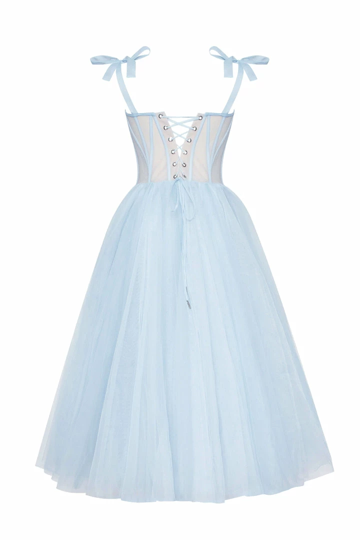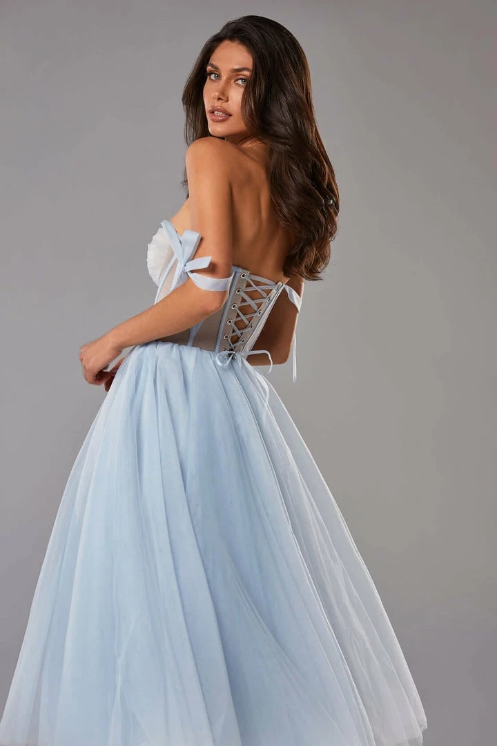 This stunning corset dress with a puffy skirt has build-in cups and bones. The back of this evening gown is designed with lacing, which covers by a detachable sheer long-sleeved cape. It can be ordered in three colors such as lavender, misty rose and light blue.