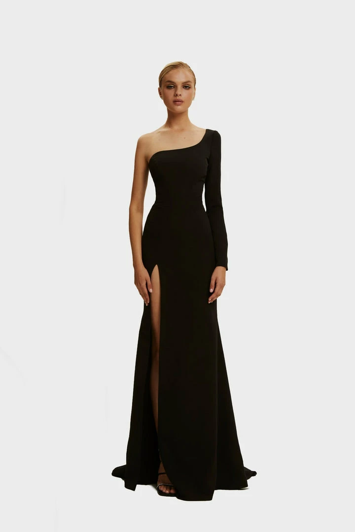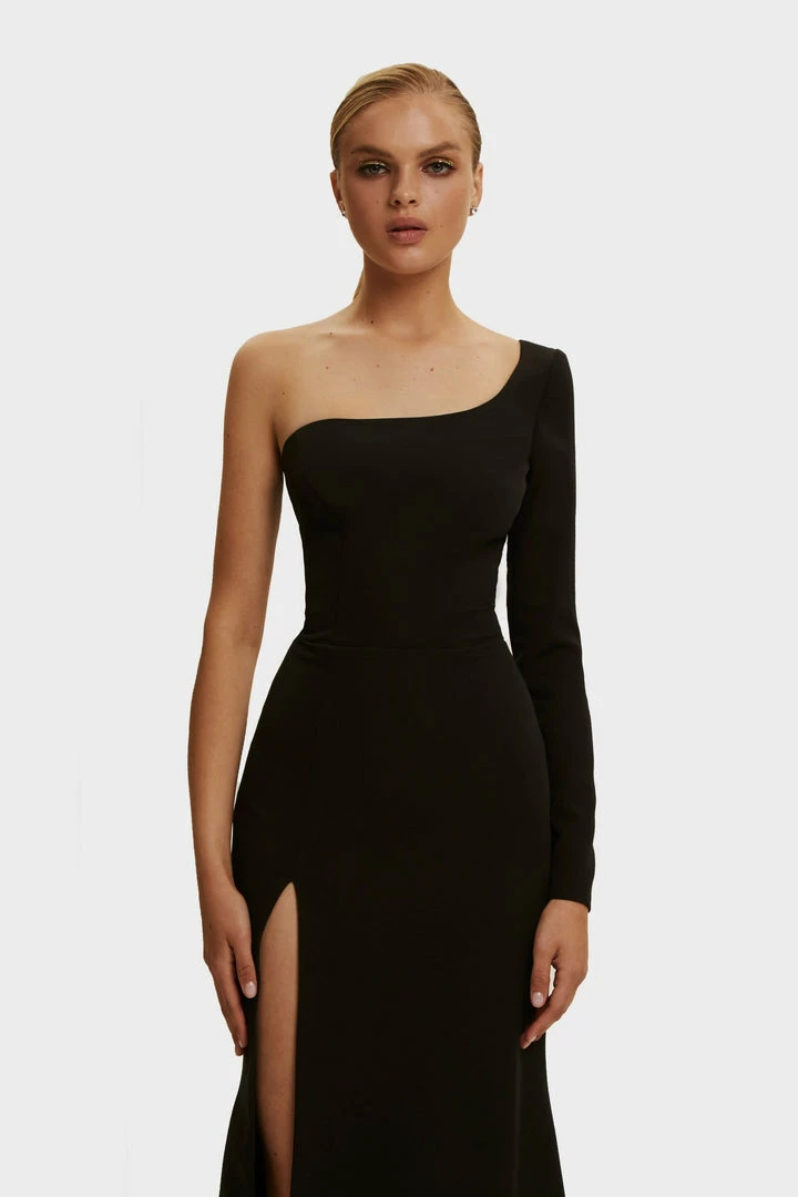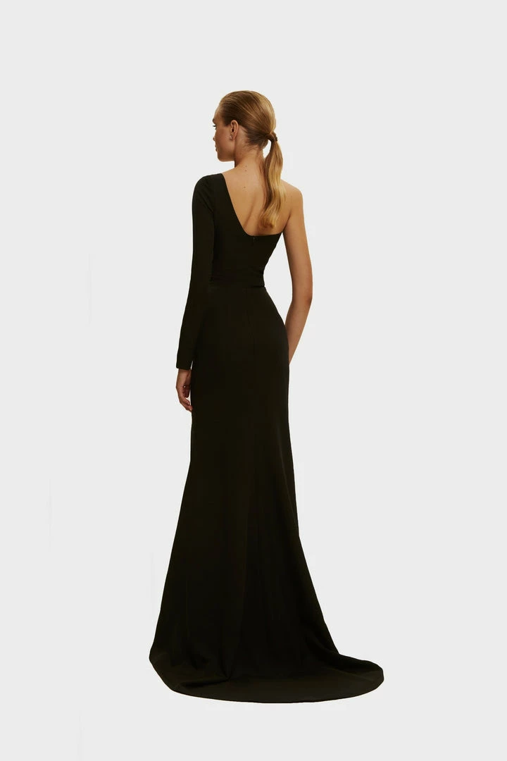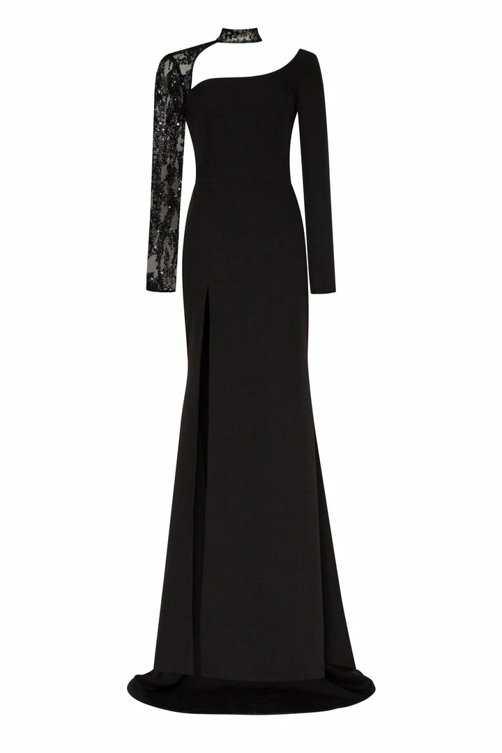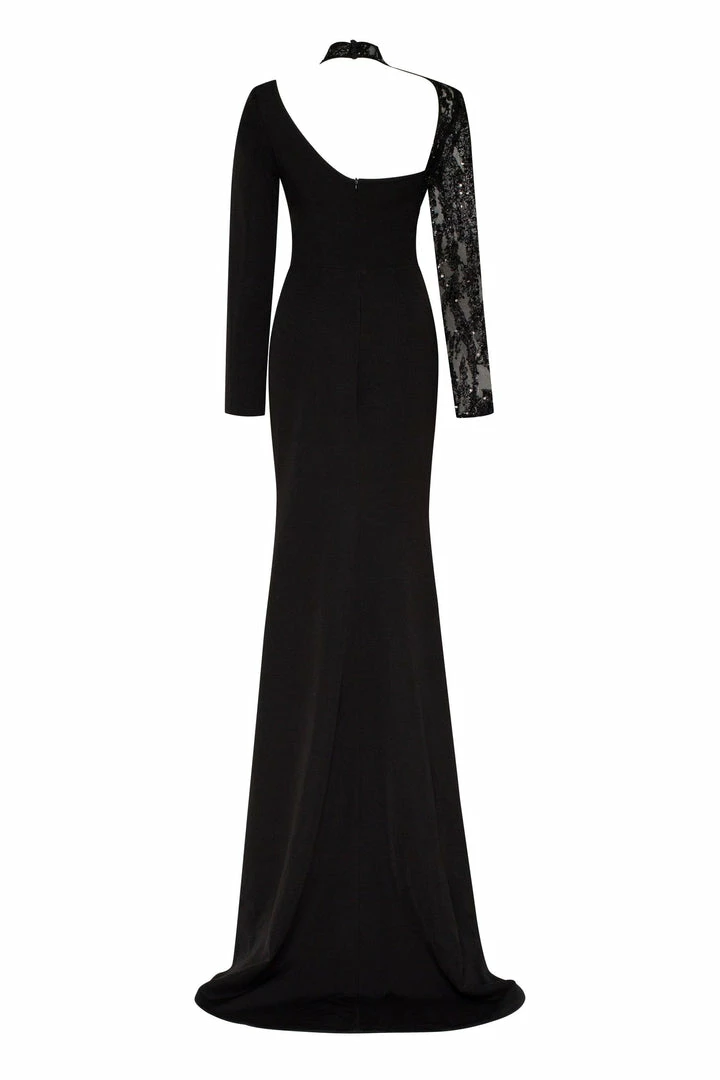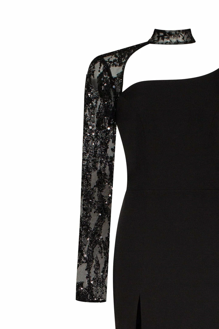 One-shoulder trumpet Milla evening mermaid dress from gabardine fabric. Designed with one long sequined sleeve. Goes in black color.