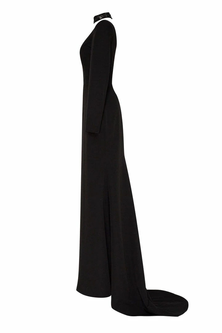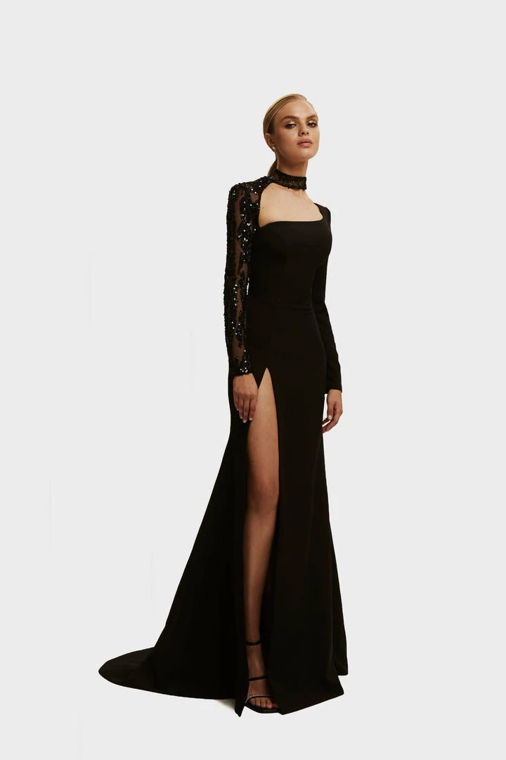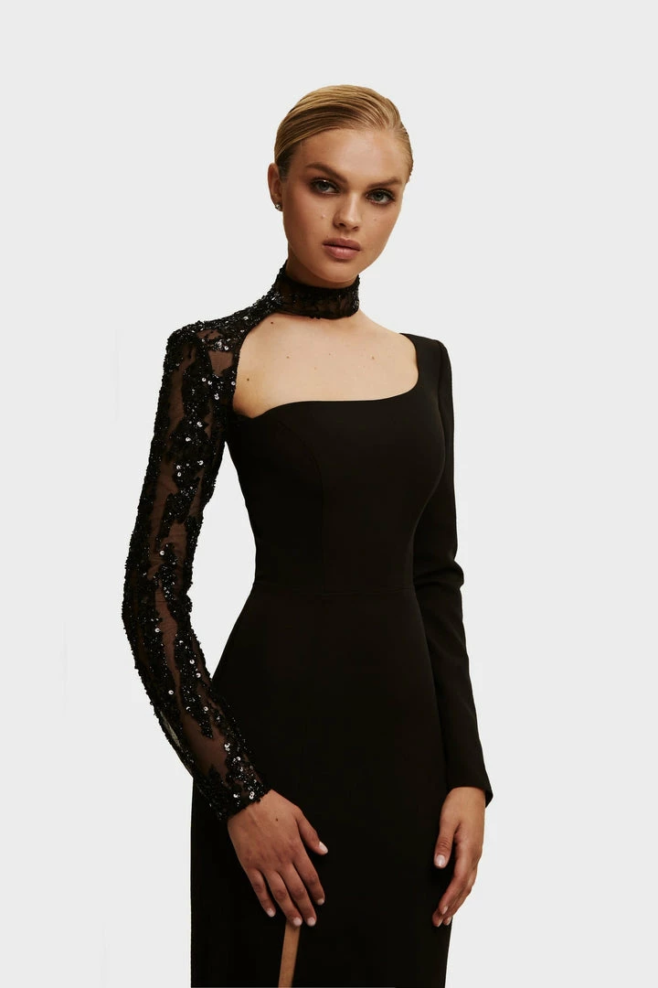 This amazing sexy evening high slit dress has a detachable second sequin sleeve with a high neck. Detachable long sleeve is embroidered hand-made and transparent and finishes in high-neck fabric necklace. This Milla side slit dress features a square neckline and a half-open square back. The perfect black evening gown for stylish girls.