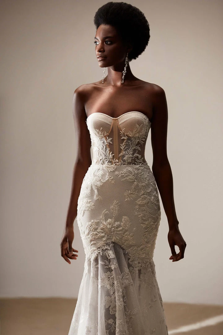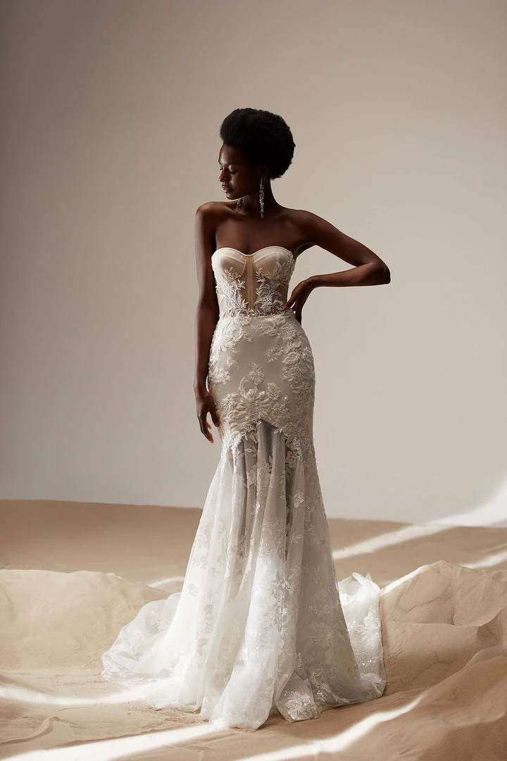 Mermaid wedding gown in nude ivory/total ivory. Features a semi-transparent corset bodice, open back, and a long semi-transparent tulle train. Ivory underskirt can also be made with a maxi length. Complemented with detachable off-the-shoulder accessory