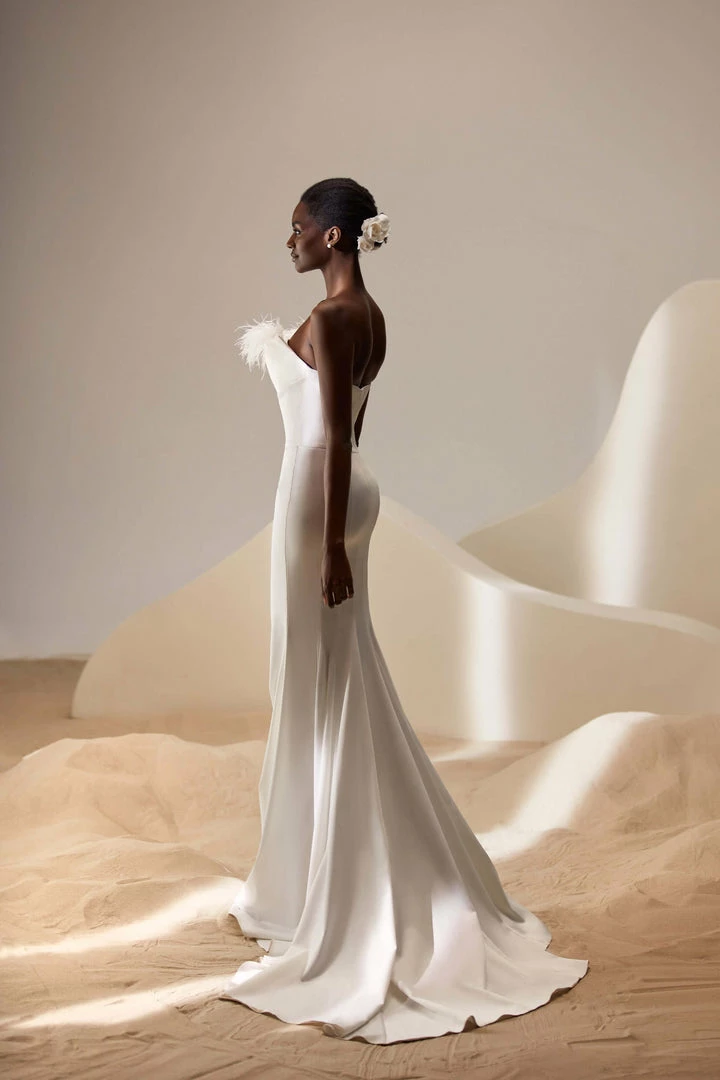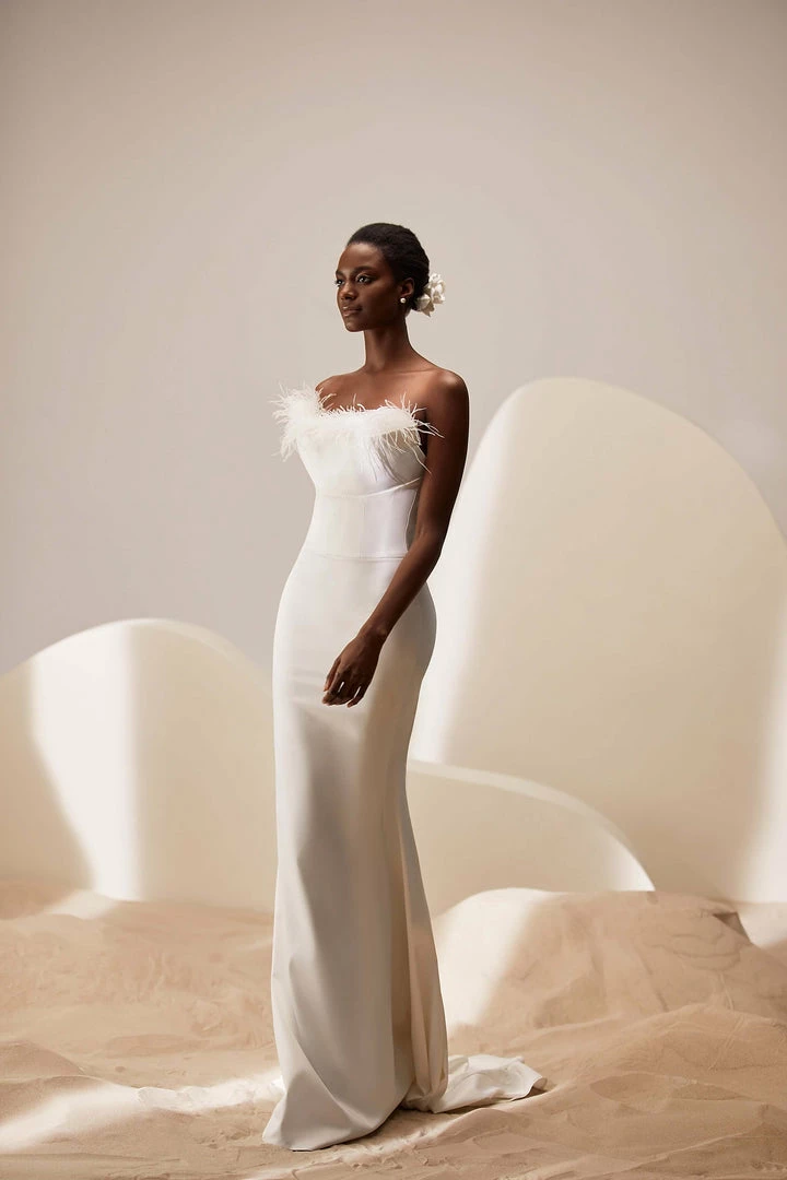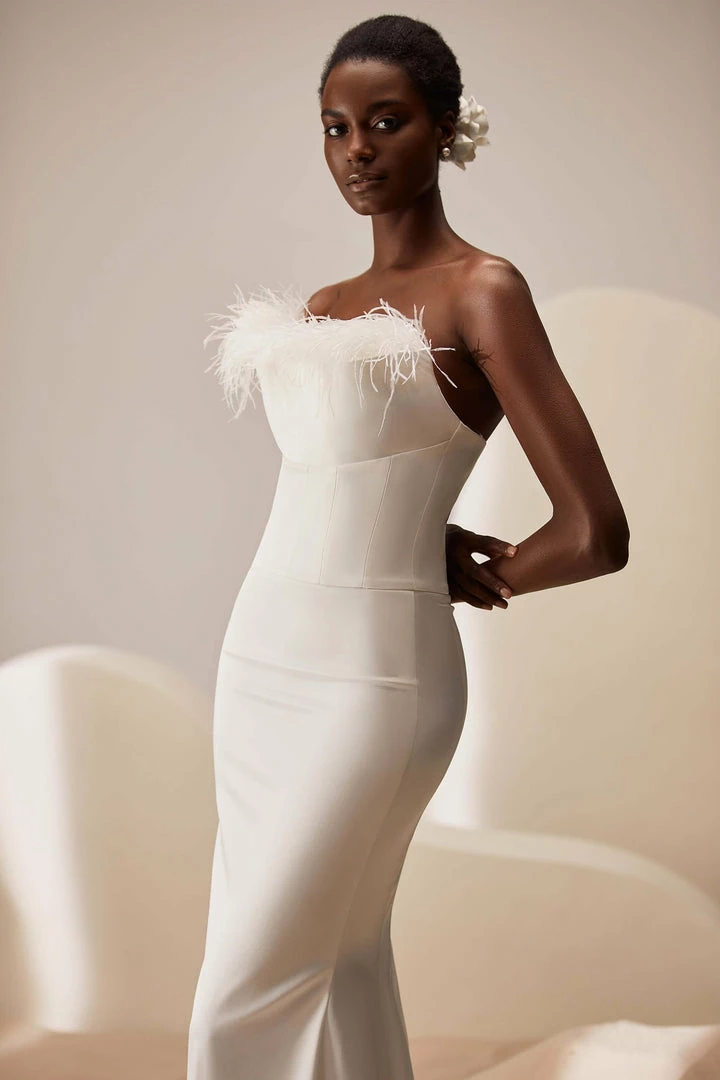 Strapless mermaid wedding gown in ivory with feathers on the corset and a short train.