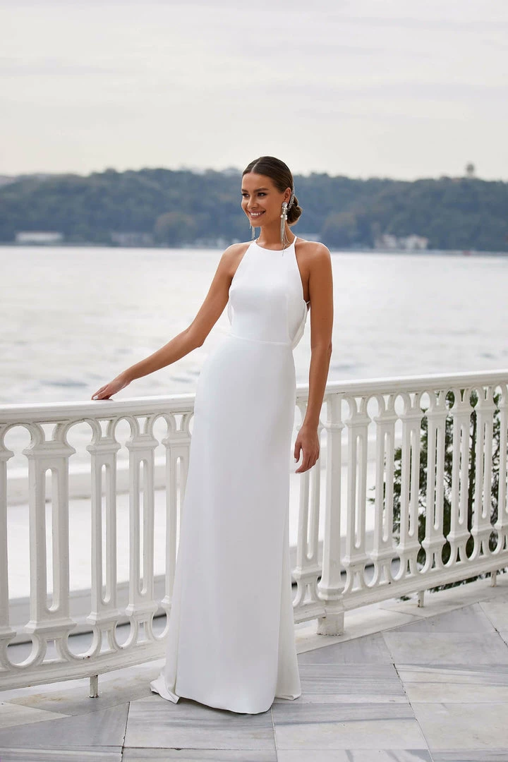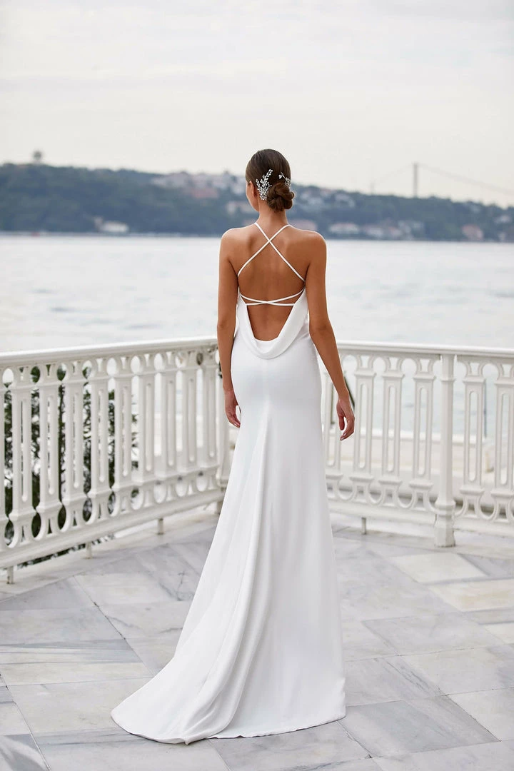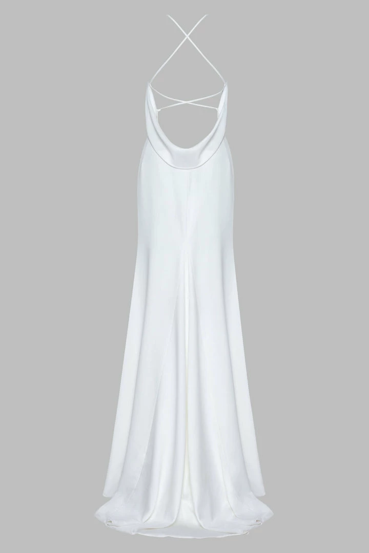 Tender sleeveless sheath wedding slip dress in white. Features a criss- cross open back and a delicate train.