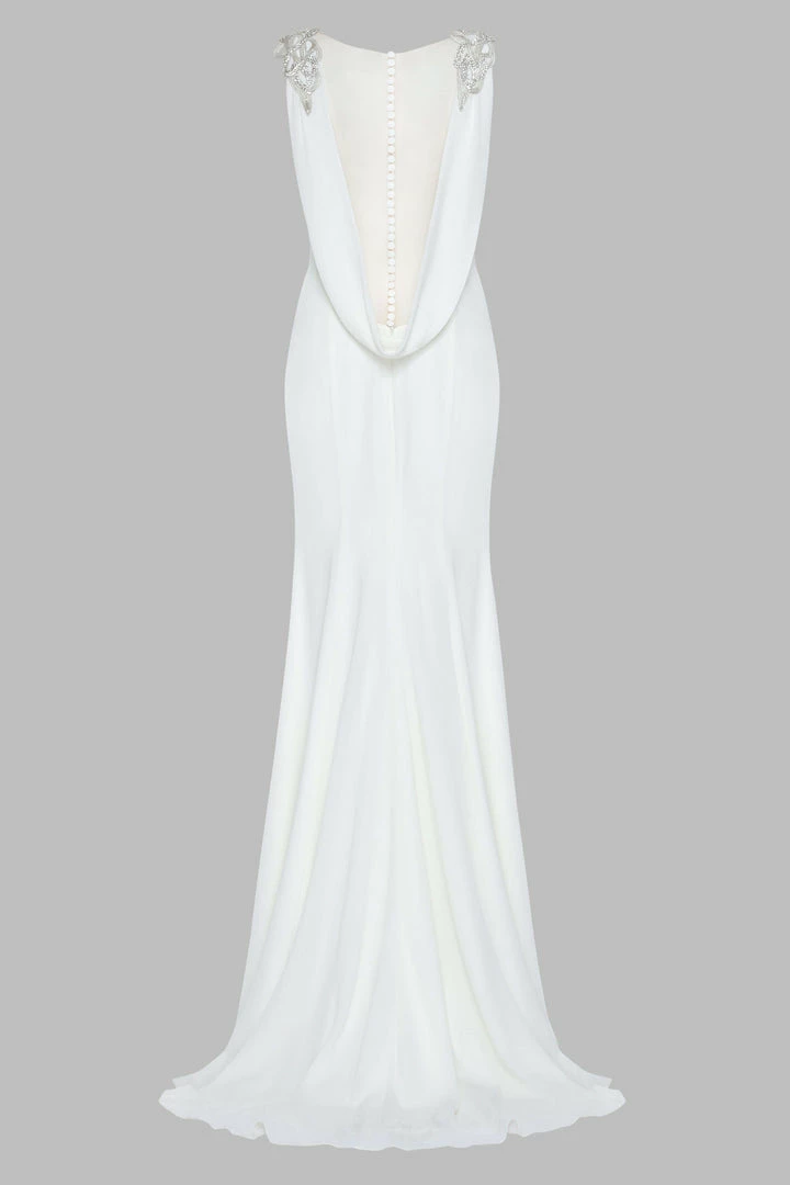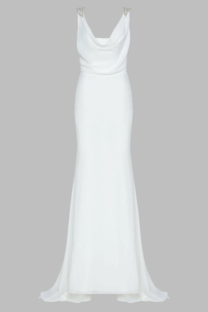 Feminine sleeveless wedding dress with a draped cowl neckline, bodycon silhouette, long train, and a draped cowl, button-up open back. Embellished with sparkling epaulettes.