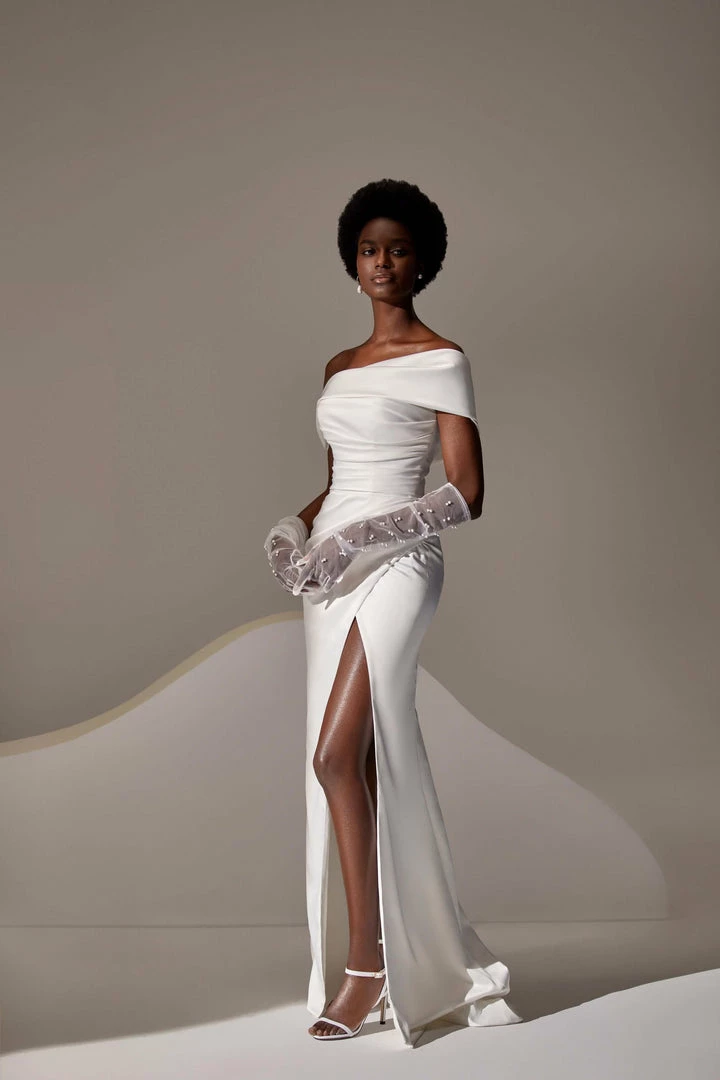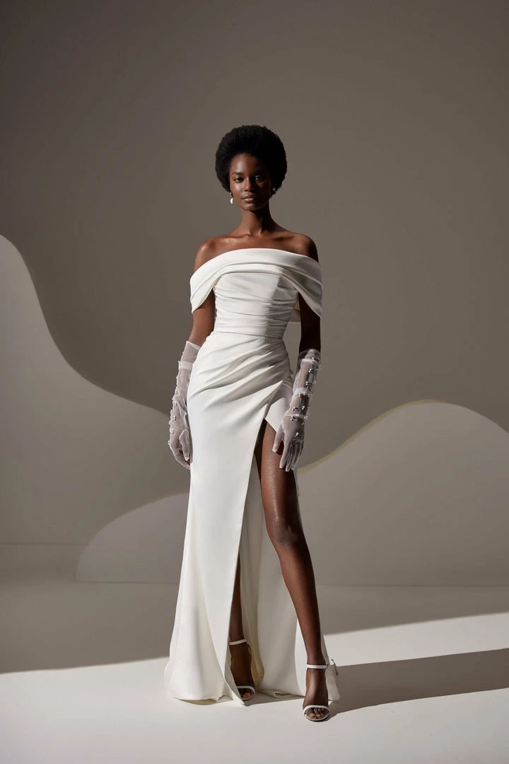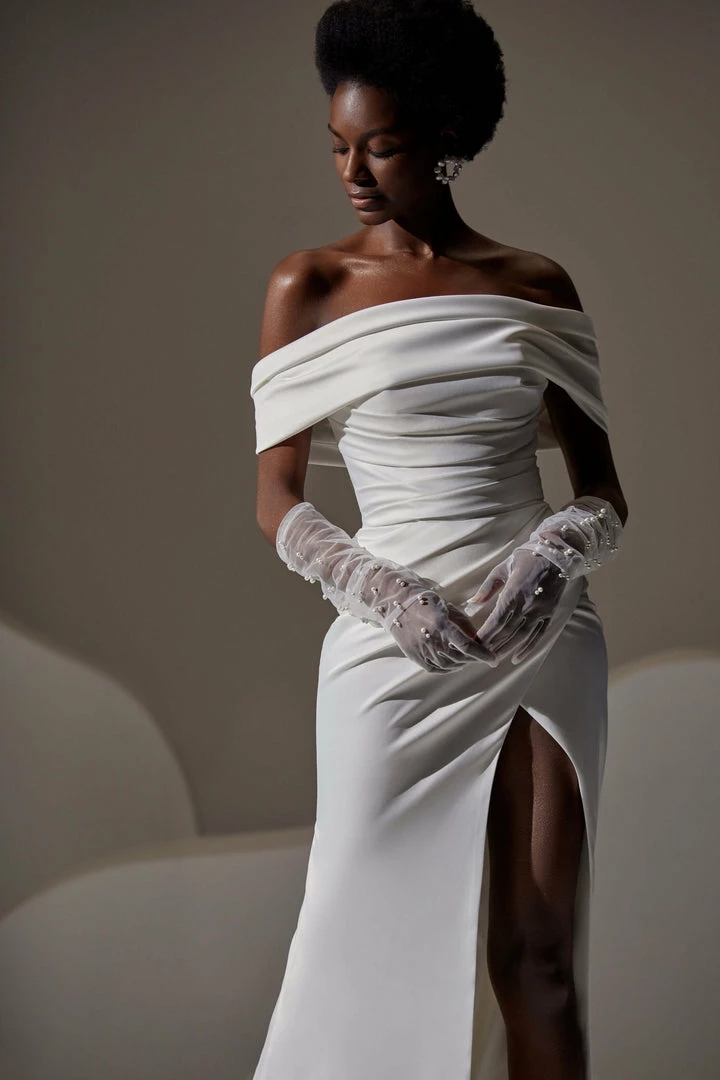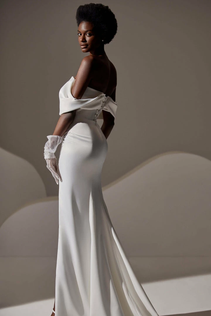 Mermaid off-the-shoulder wedding dress with ruched corset and a slit on the side.
