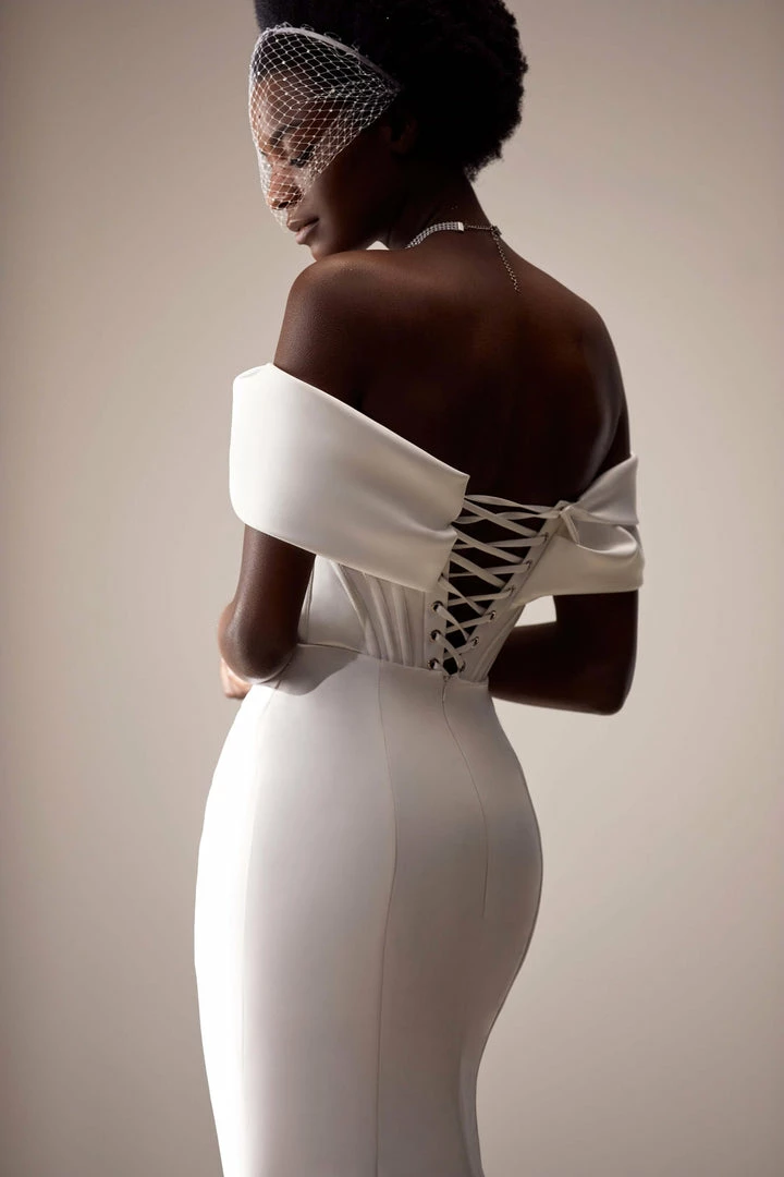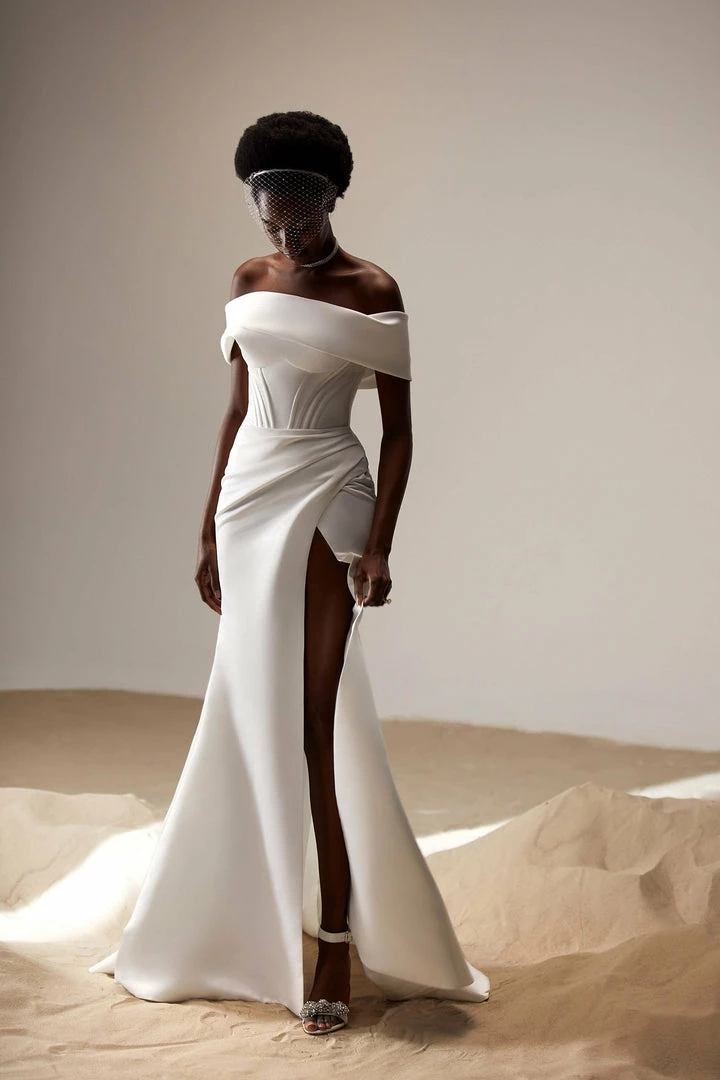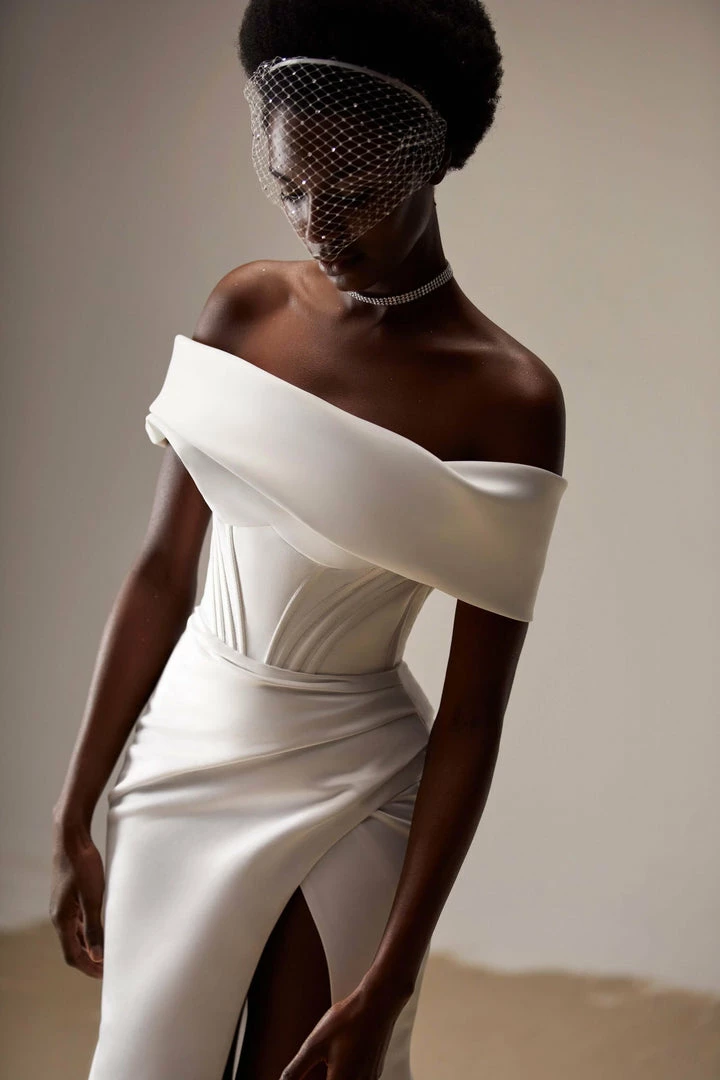 Satin mermaid wedding gown in ivory with an off-the-shoulder corset and a side slit.