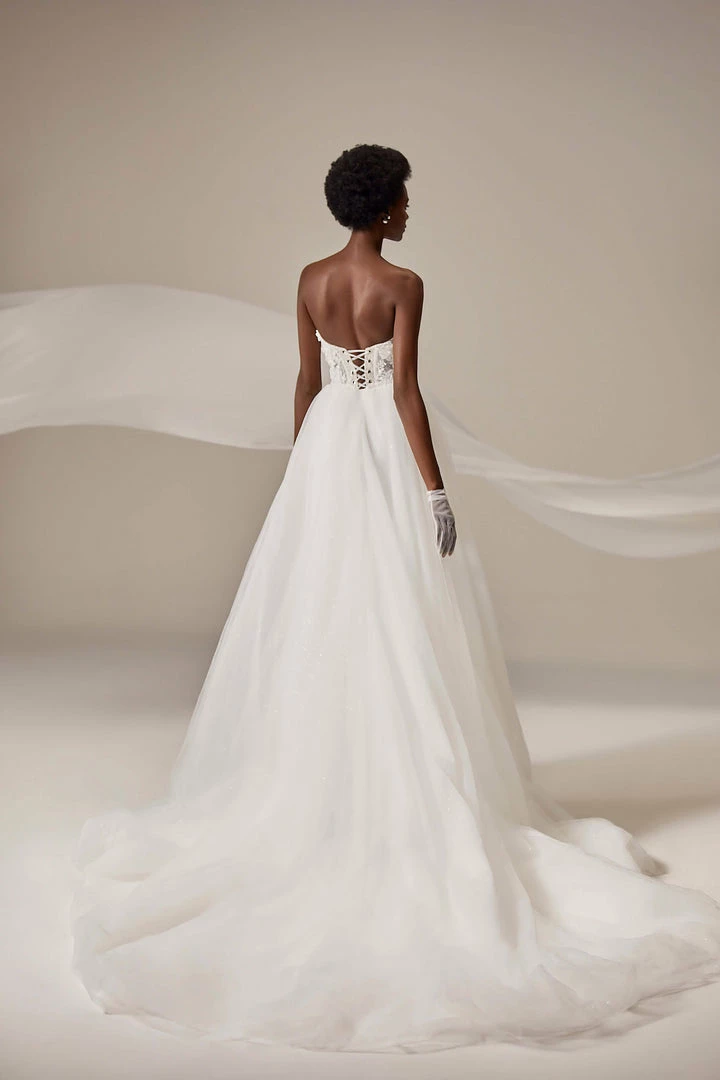 A-line tulle wedding dress with heart-shaped neckline, embroidered corset with detachable sleeves and maxi skirt. Originally comes with a slit, can be ordered without.