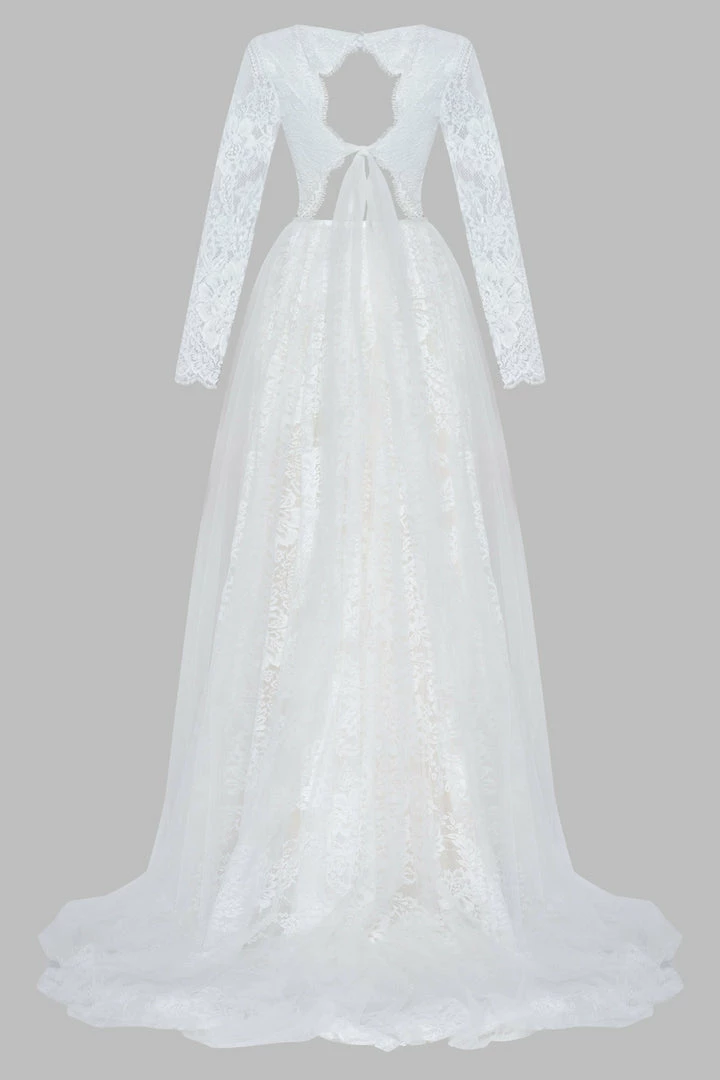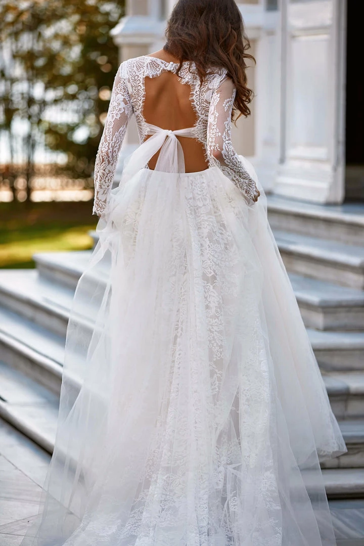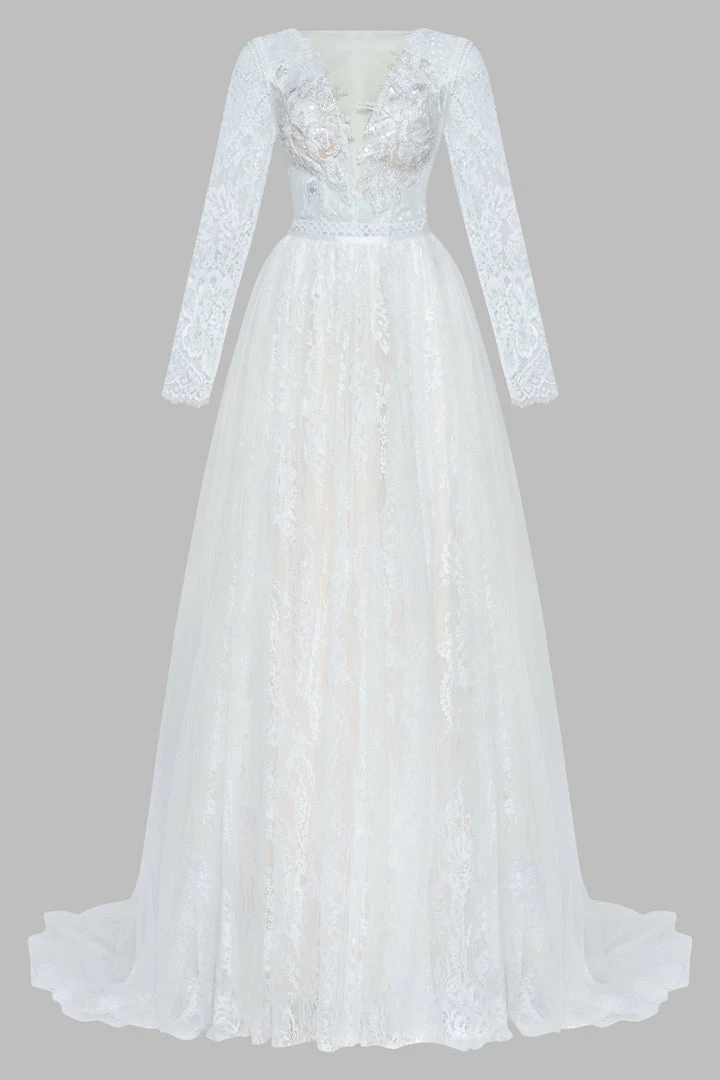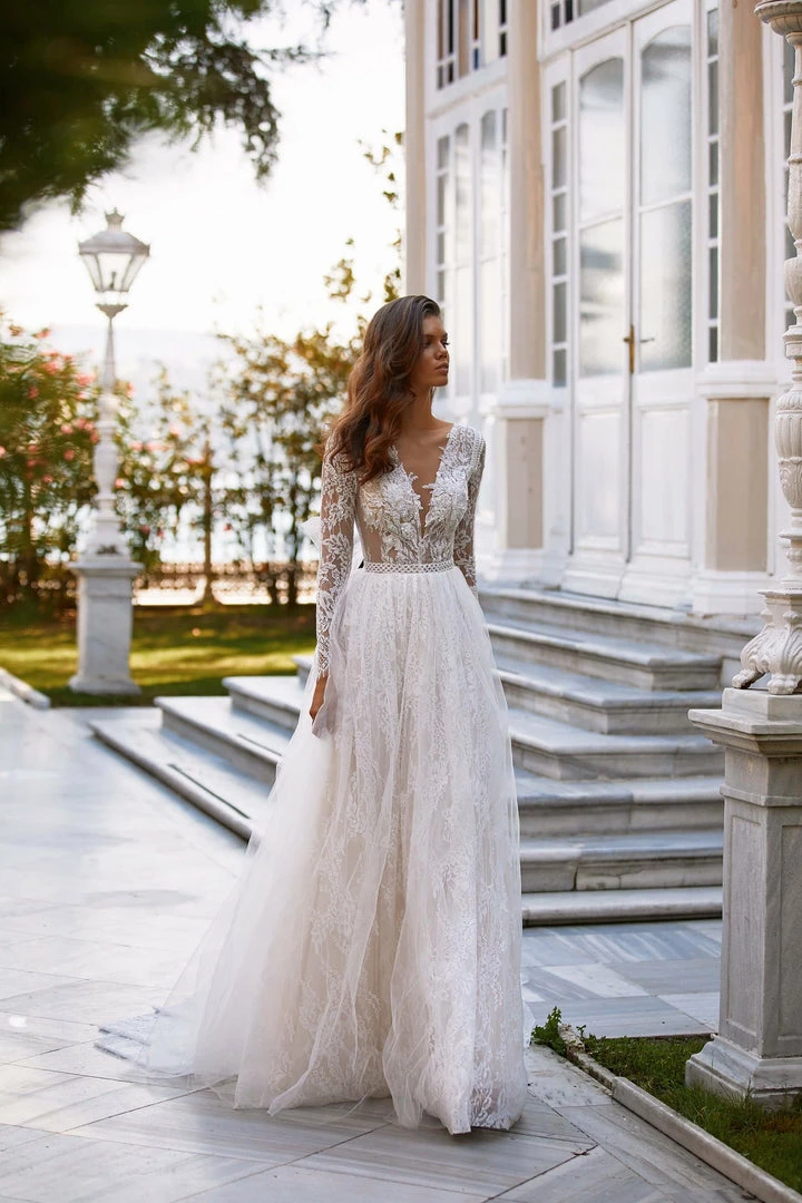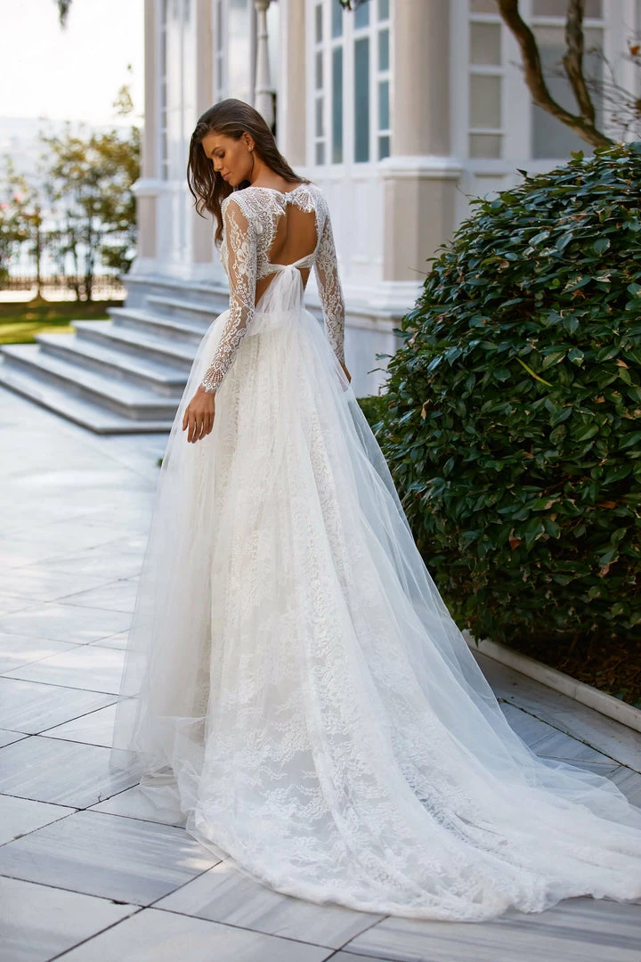 Delicate long-sleeved A-line wedding gown with a semi-transparent lace applique bodice, lace embroidered underskirt, and a sheer tulle overskirt. Features a plunging V-neckline, an open back with tie-up closure, and a long tulle train.