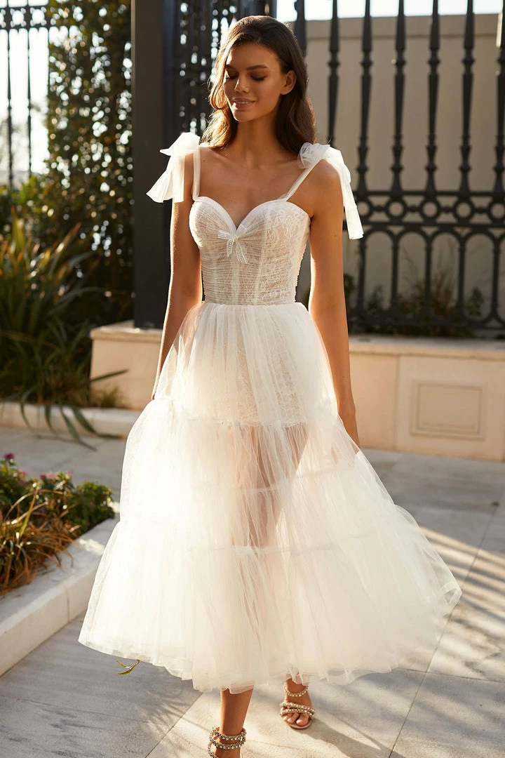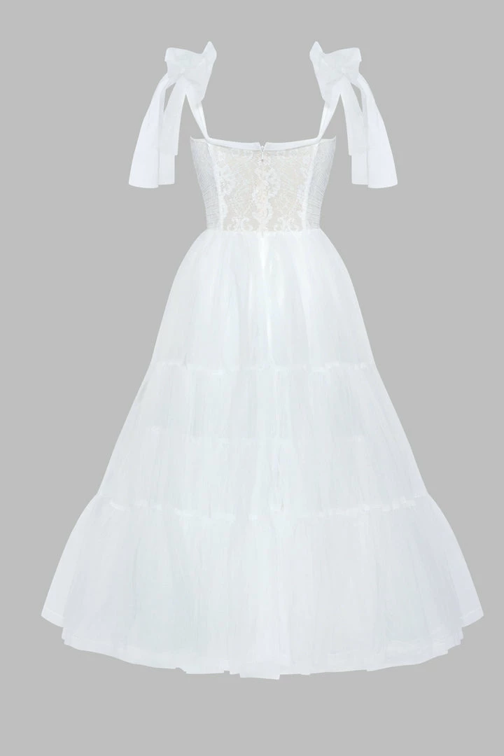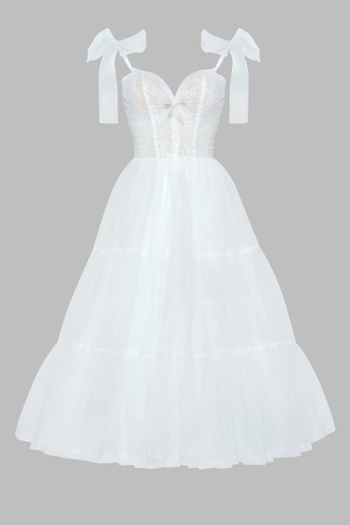 Chic heart-shaped neckline midi dress with a ruched, lace-applique bodice, tie-straps, semi-transparent tulle overlay skirt, and white lace underskirt.