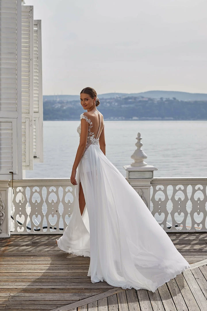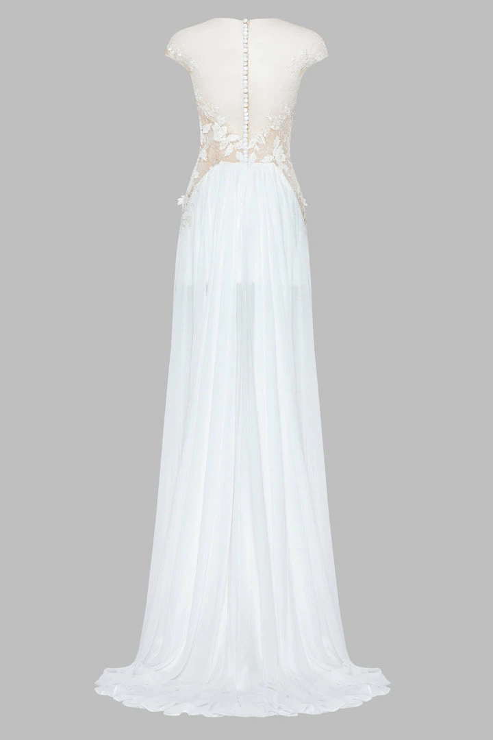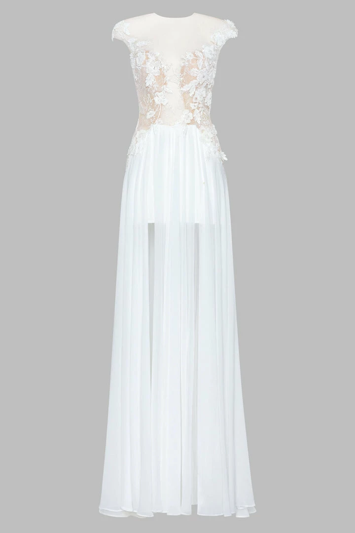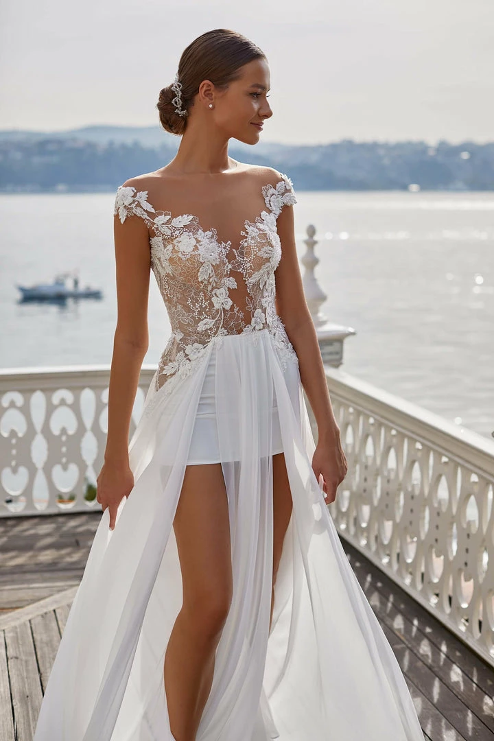 Extravagant mini/maxi wedding dress in white. Features a semi- transparent, lace applique bodice, open back, mini underskirt, and a sheer tulle maxi overskirt with front slits.
