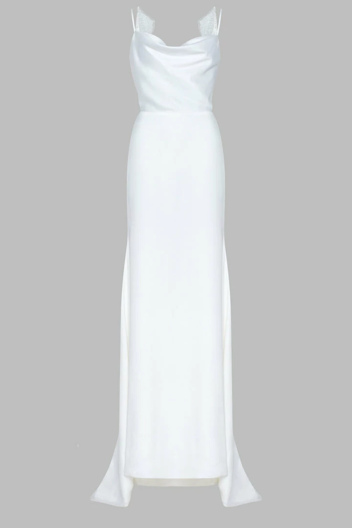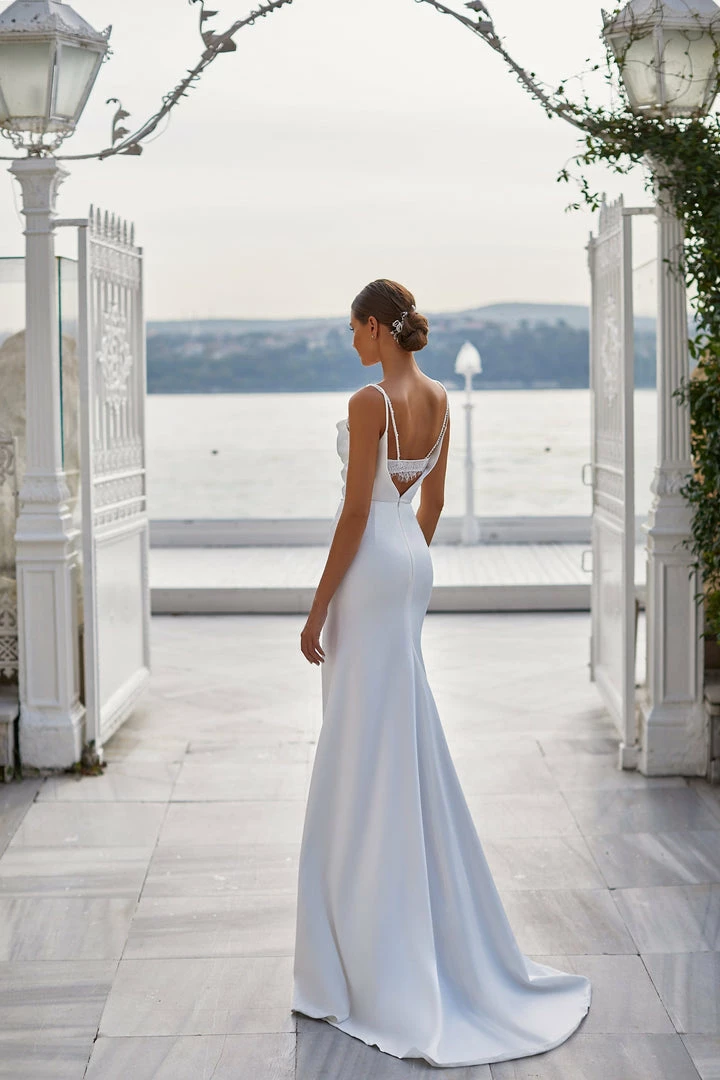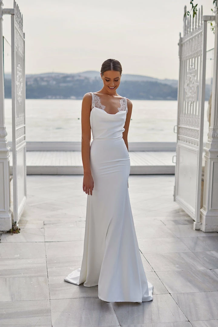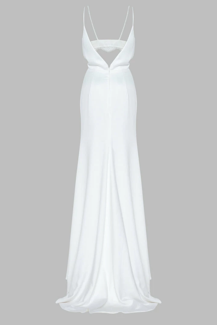 Delicate sheath spaghetti-straps wedding dress in white. Features a plunging neckline, lace detailing, open back, and a short cathedral train.