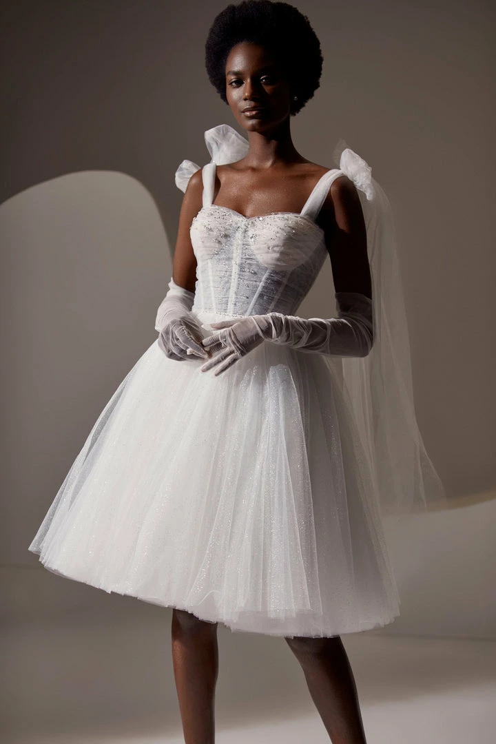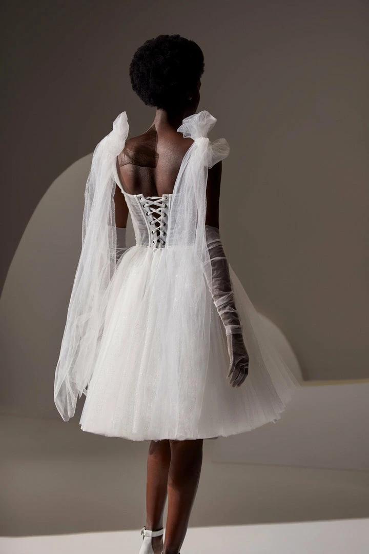 Mini wedding dress features a semi-transparent corset bodice, puffy skirt, and tulle bow-straps. Perfect as a second wedding dress or evening party dress.