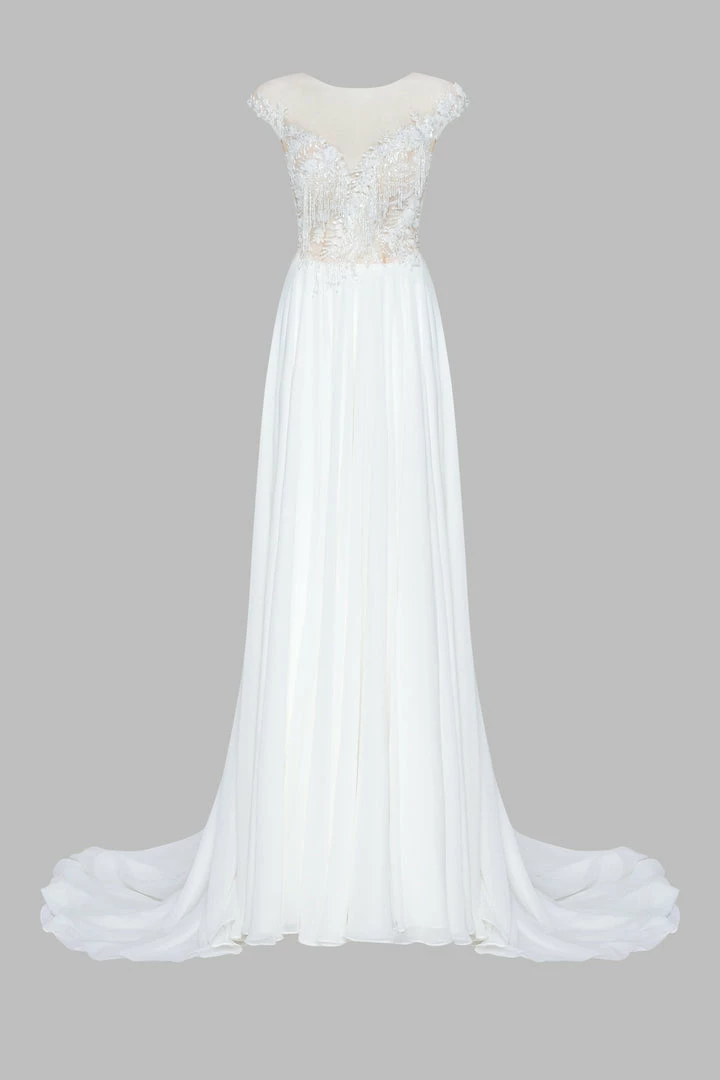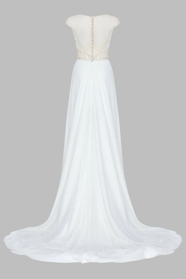 Delicate A-line wedding dress in white with an embroidered off-the- shoulder bodice, open button-up back, flared skirt with a front slit, and a long train.