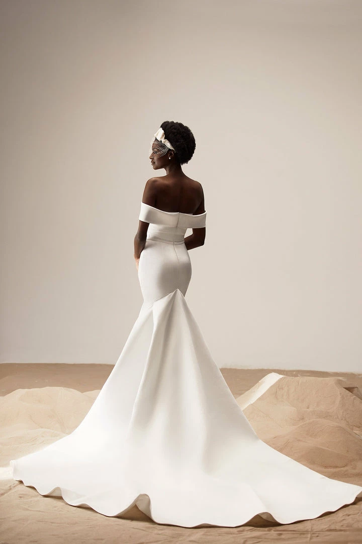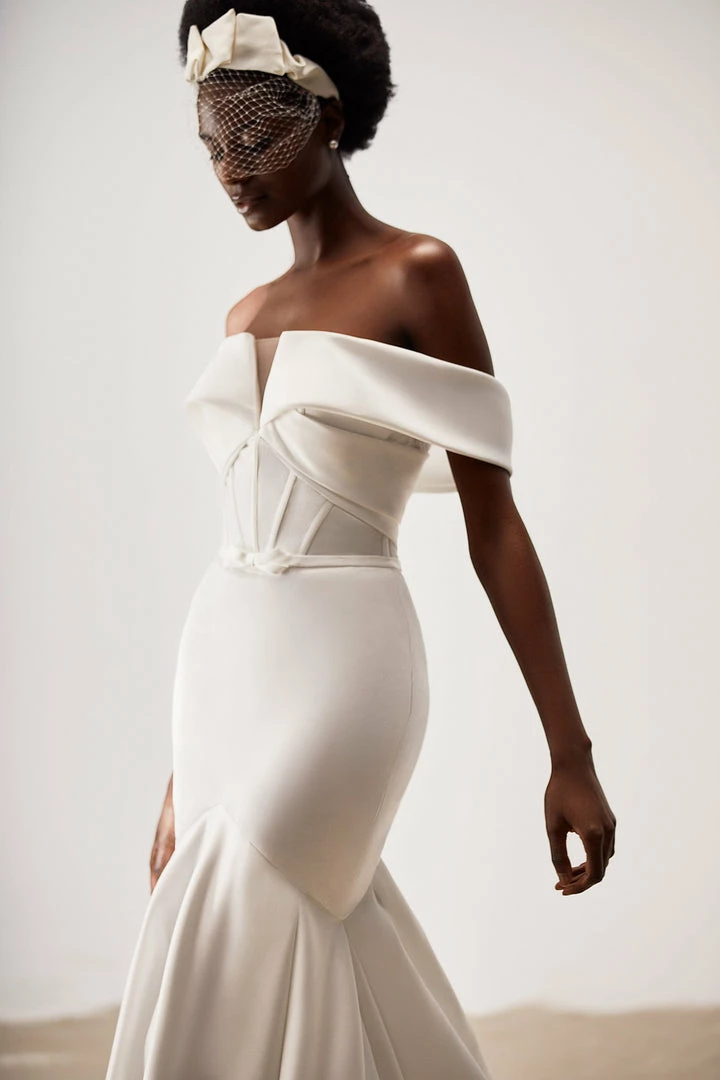 Mermaid wedding dress in satin with an off-the-shoulder corset and a long train.