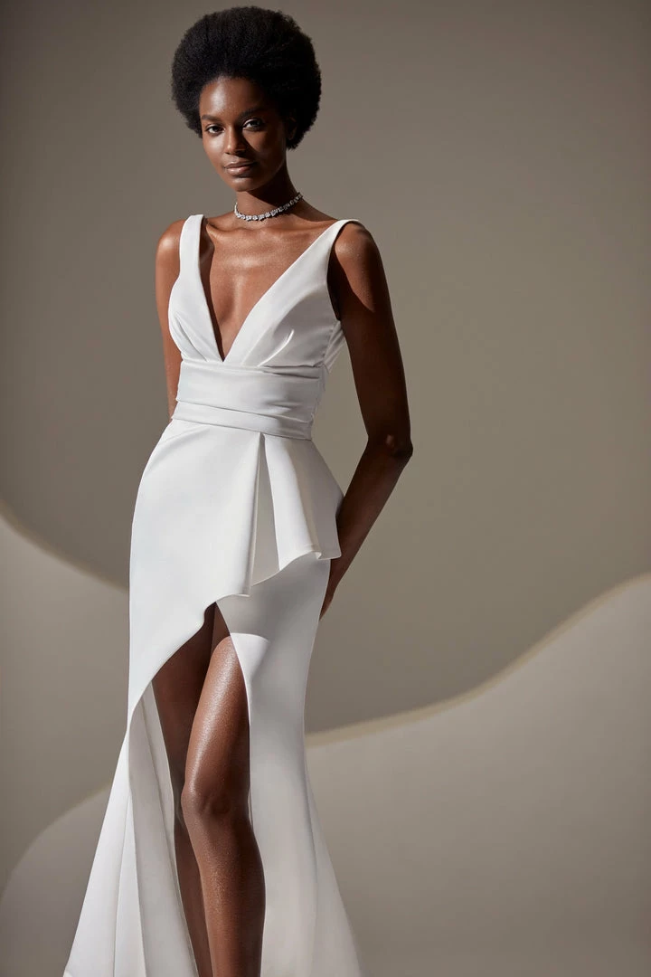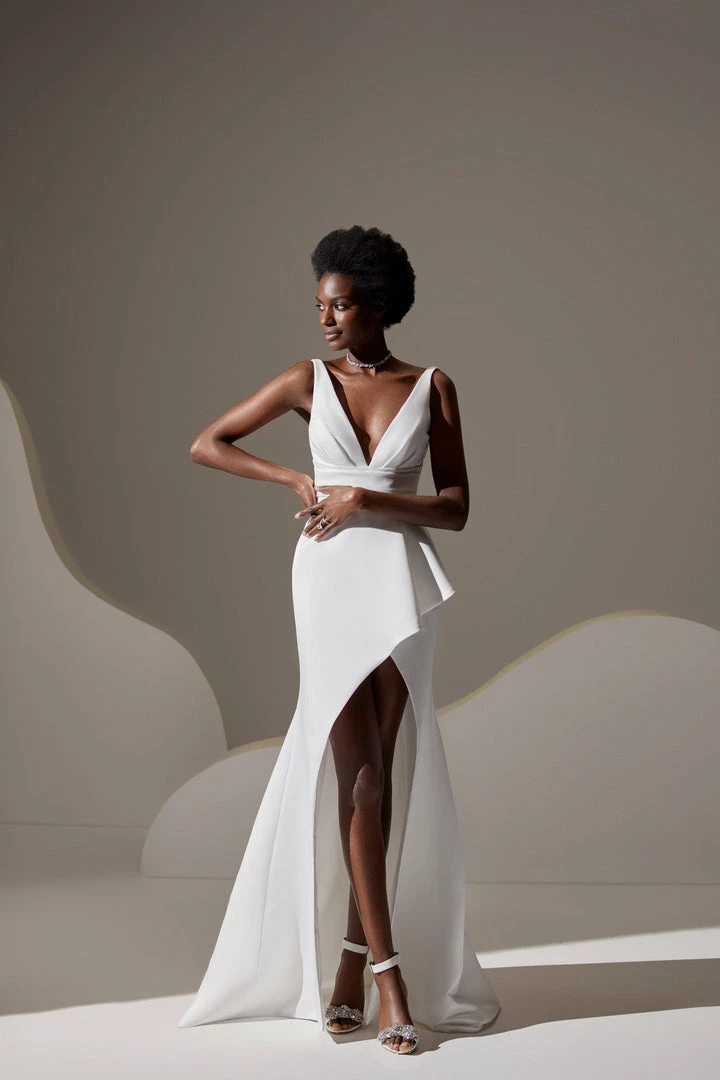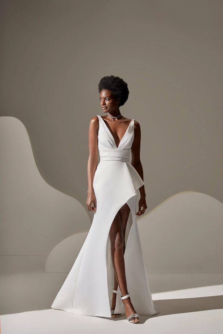 Mermaid wedding dress in satin with a ruched skirt and a slit.