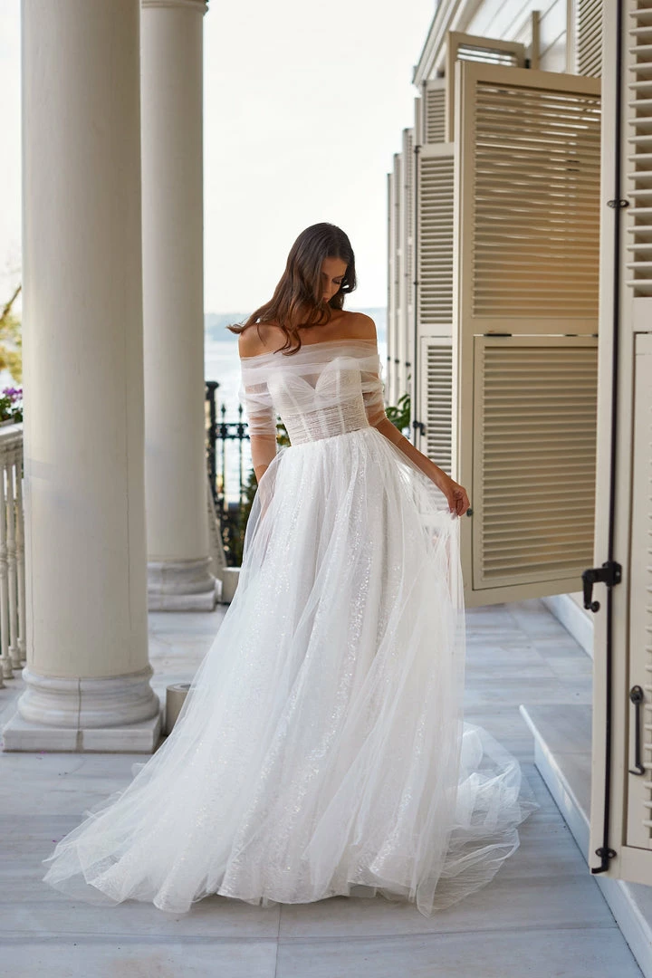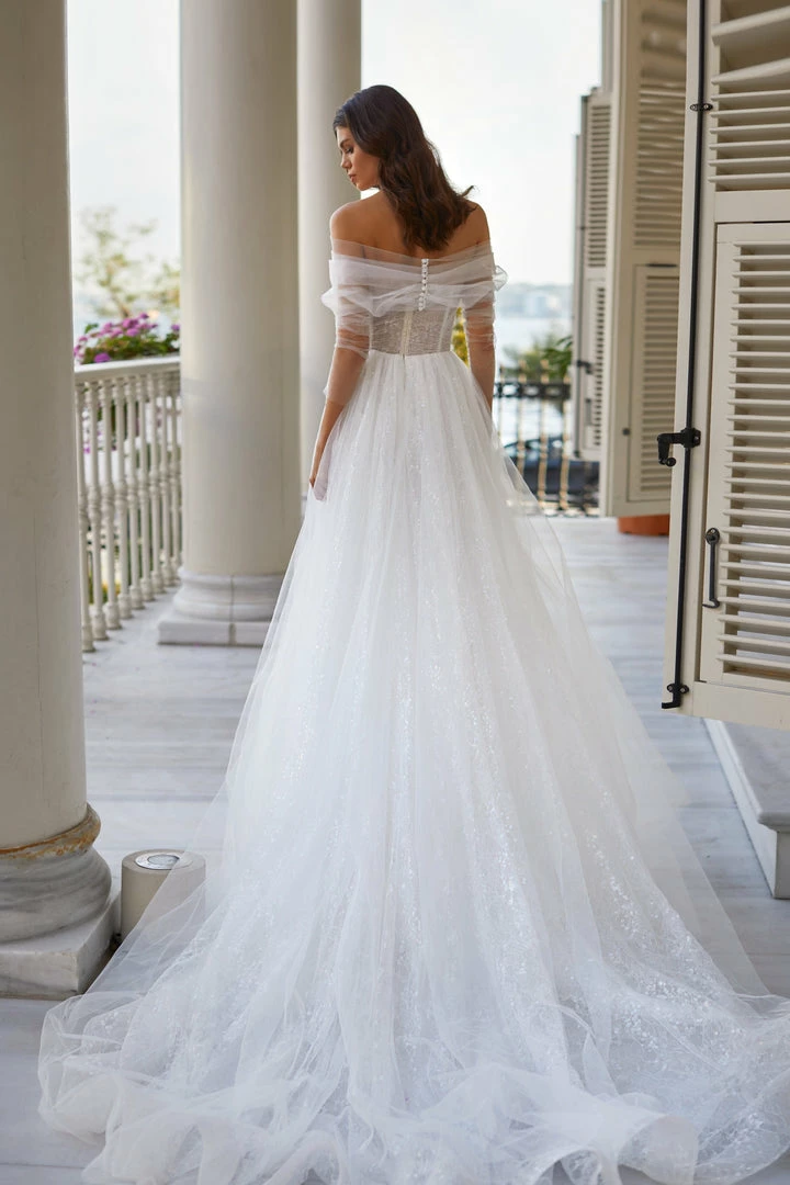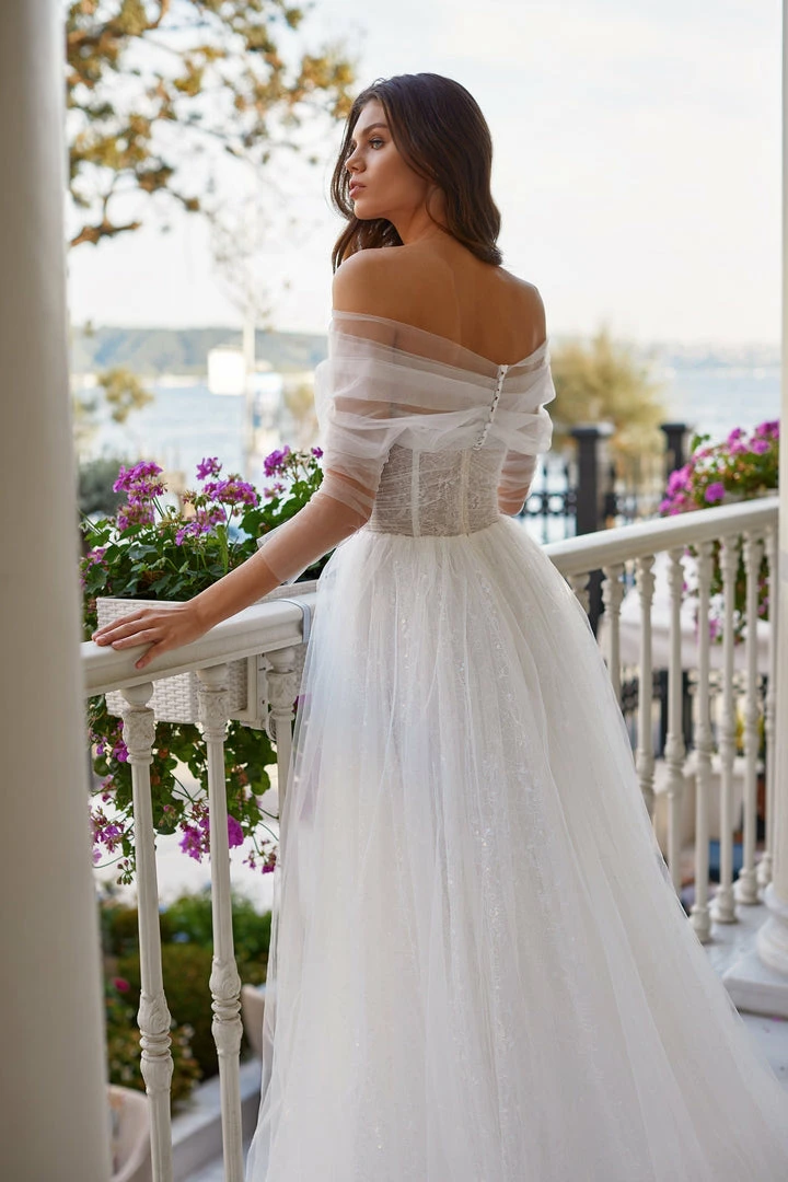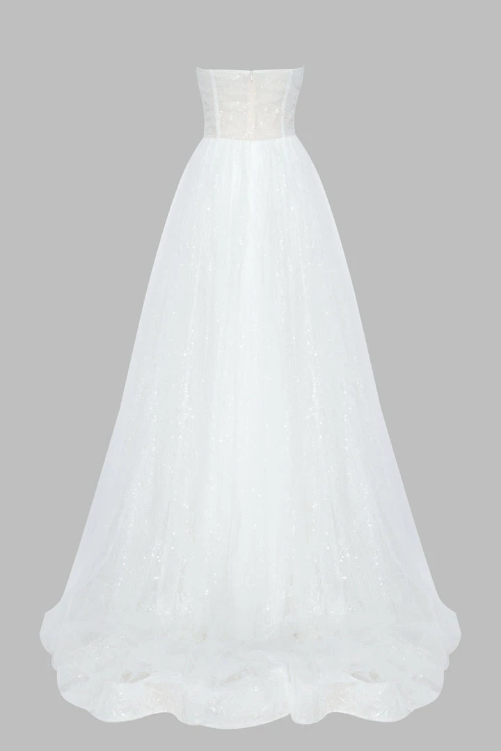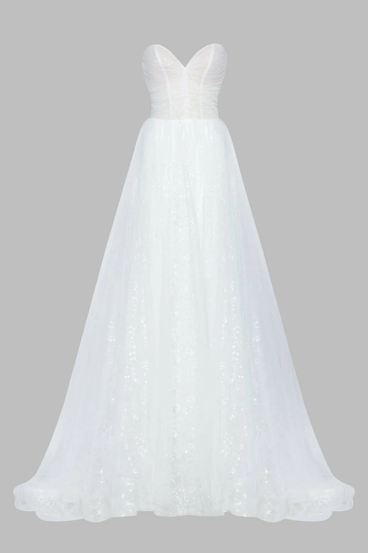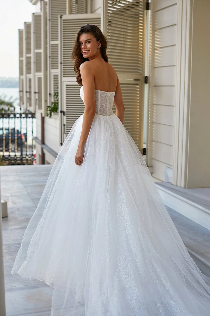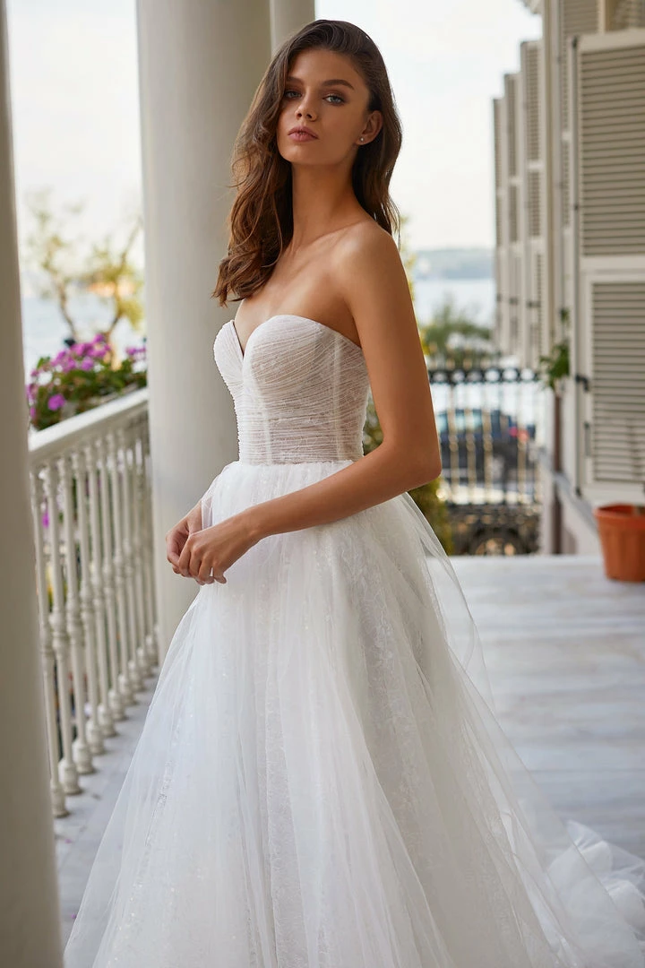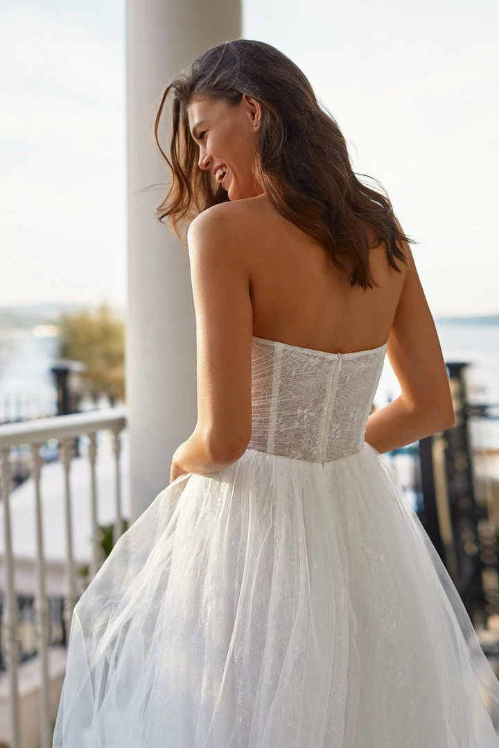Dreamy strapless lace & tulle wedding ball gown. Features a heart- shaped neckline, sheer tulle ruched bodice and tulle overlay skirt. Can be complemented with a detachable sheer tulle, ruched bolero.
