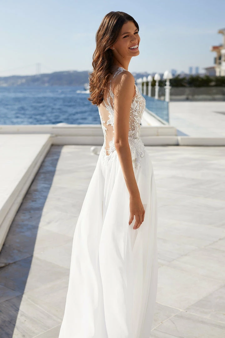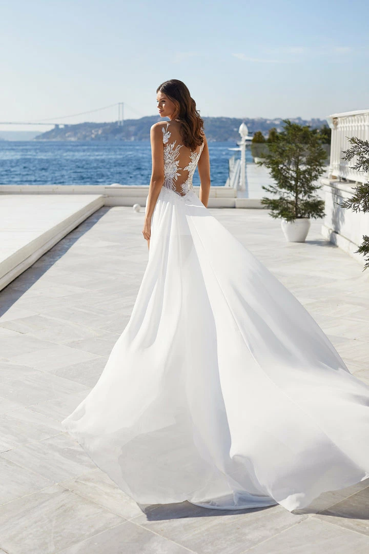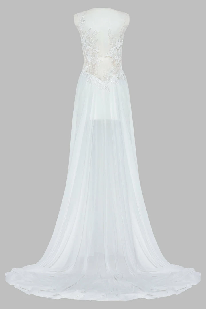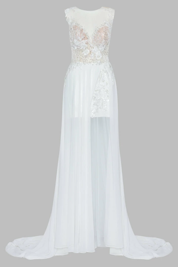Gorgeous mini / maxi wedding dress in white. Features a sparkly embellished bodice, lace-applique open back, white mini skirt, and a chiffon overlay maxi skirt with front slit.