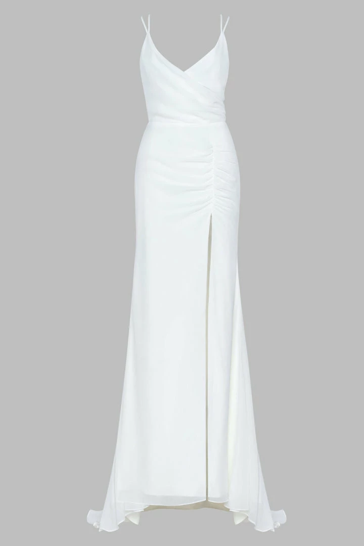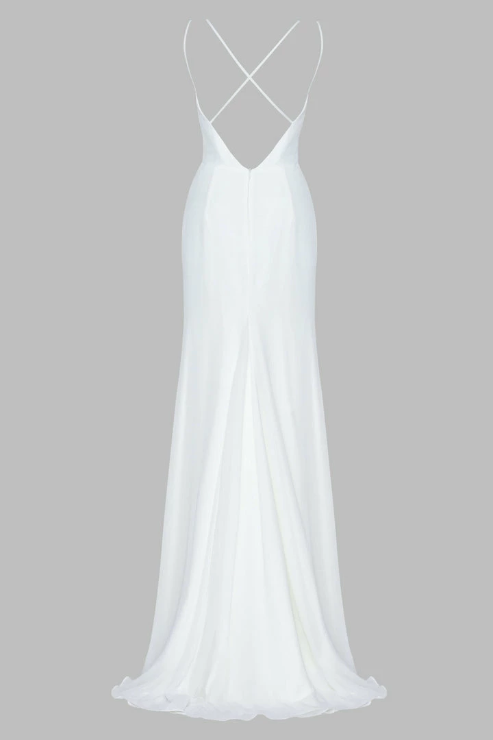Classy sheath spaghetti-straps wedding dress in white. Features a draped skirt with a thigh slit, criss-cross open back, and a delicate short train.