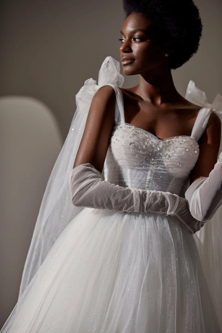 Opera length gloves made with ivory draped tulle fabric. Emphasize the elegance of the look, and symbolize purity and eternity of love.