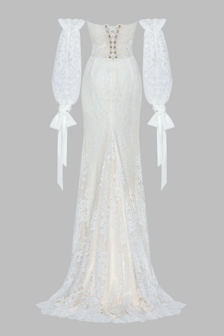 Gorgeous off-the-shoulder, long-sleeve wedding dress in white. Features lace appliques, semi-transparent puffy sleeves, a thigh slit, open back with a lace-up closure, and a delicate lace train.