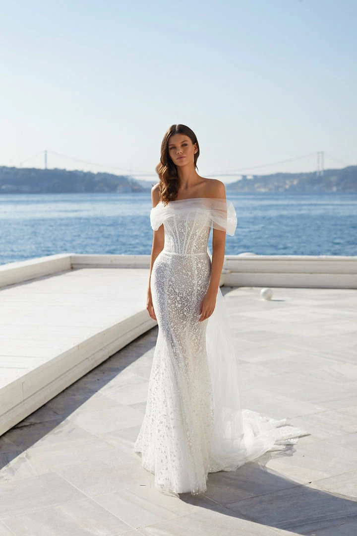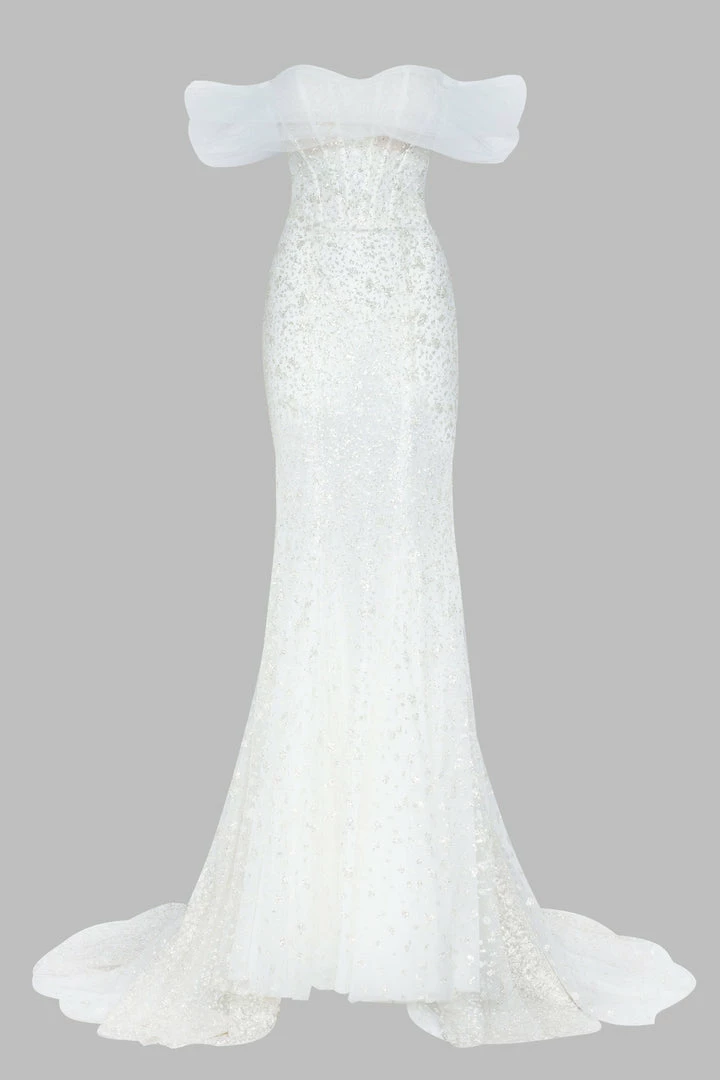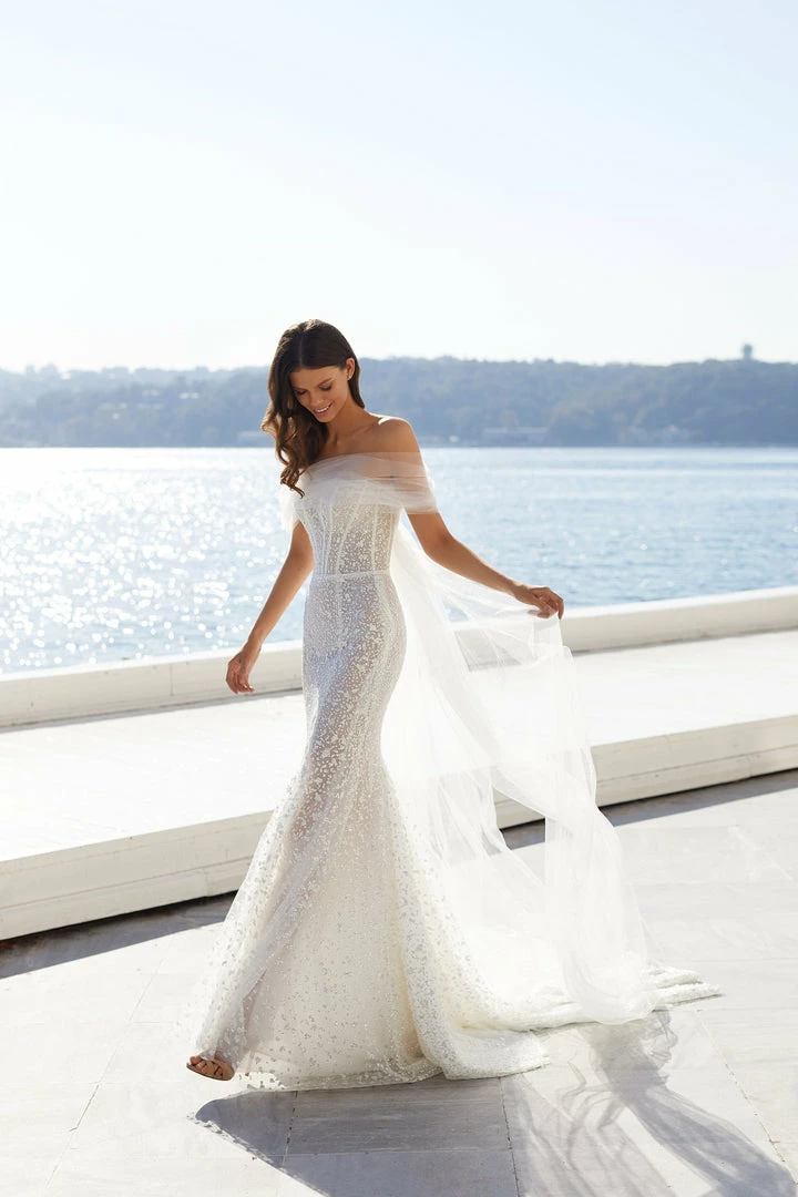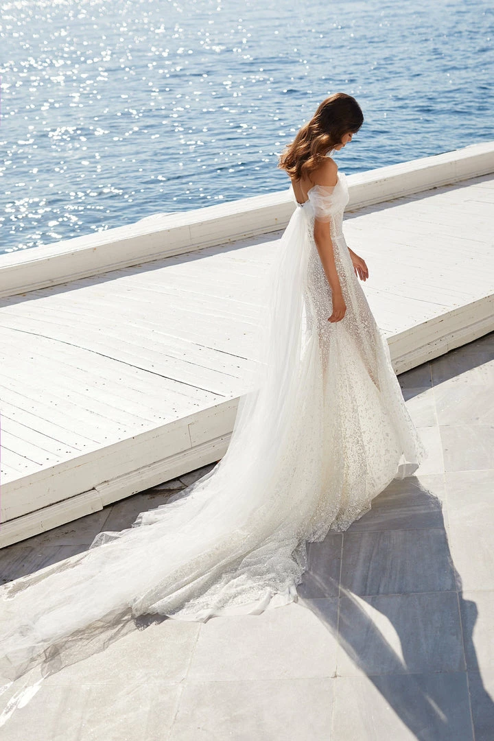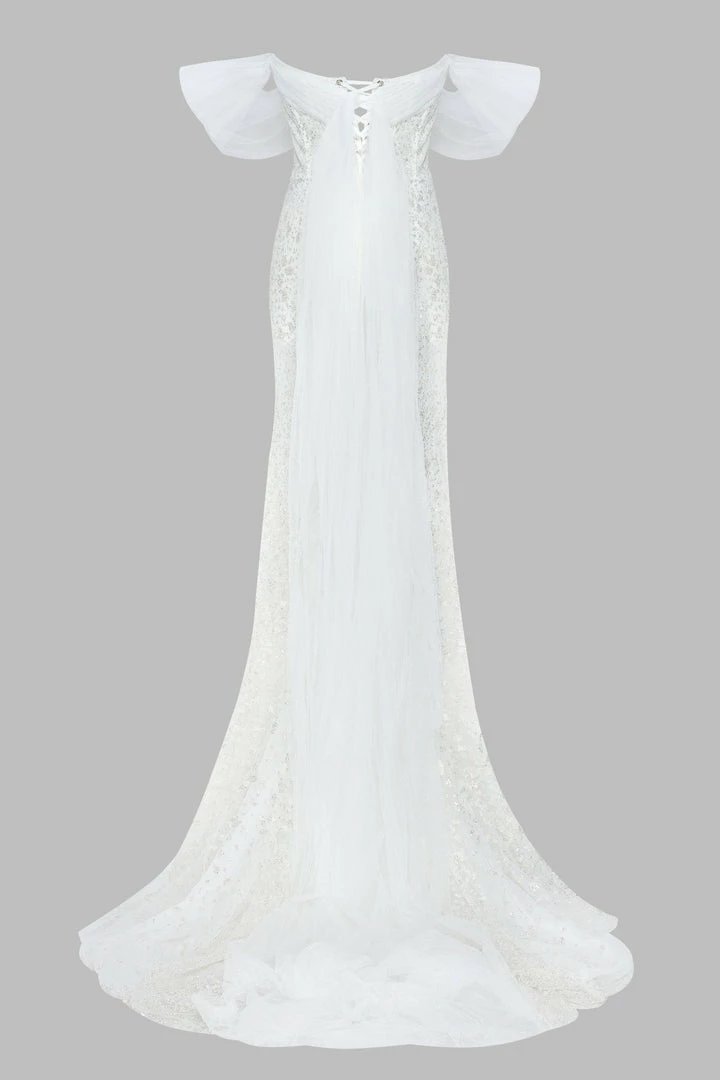 Gorgeous semi-transparent mermaid wedding dress. Features lace appliques, off-the-shoulder sheer tulle sleeves, tie-up back, and a delicate long tulle train.
