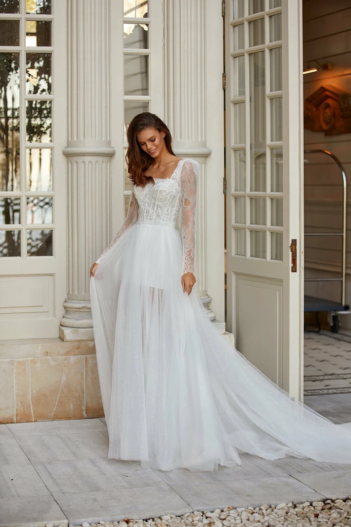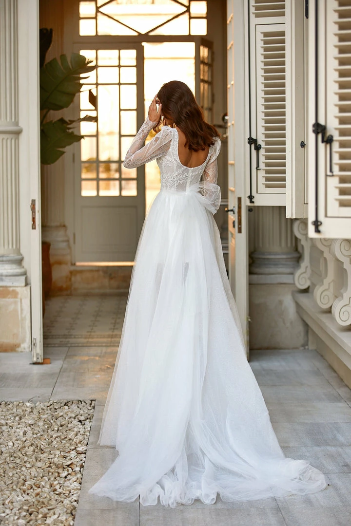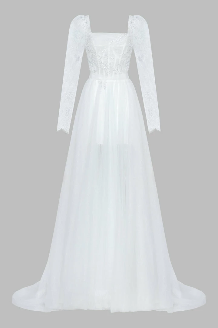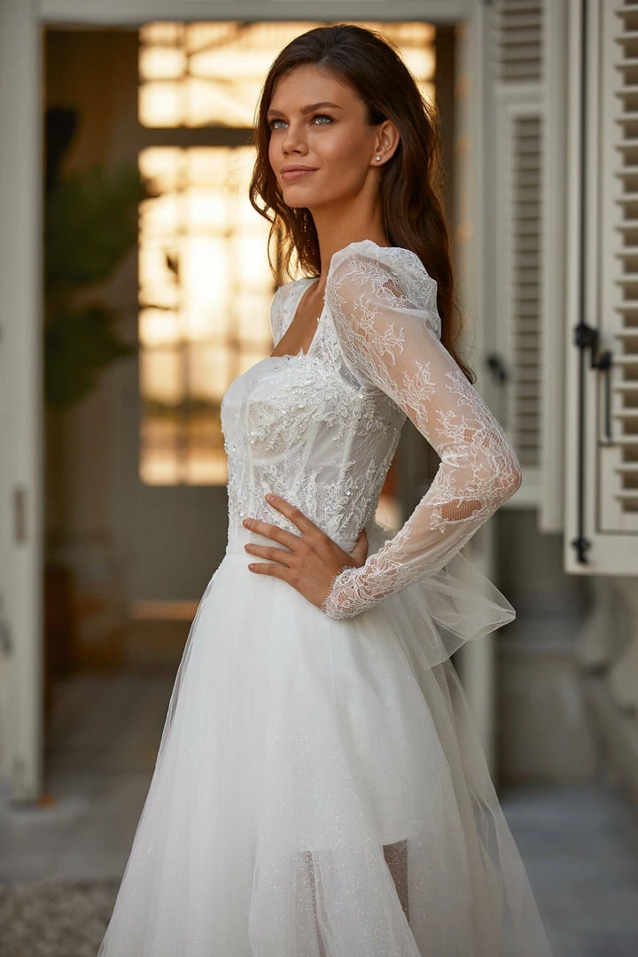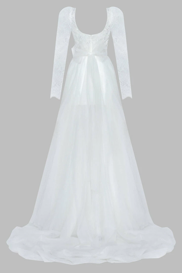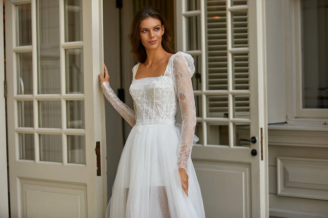 Tender mini/maxi lace & tulle wedding dress in white. Features a square neckline, sheer long sleeves, ruched lace-applique bodice, bow-back detailing, and a semi-transparent tulle overlay skirt.