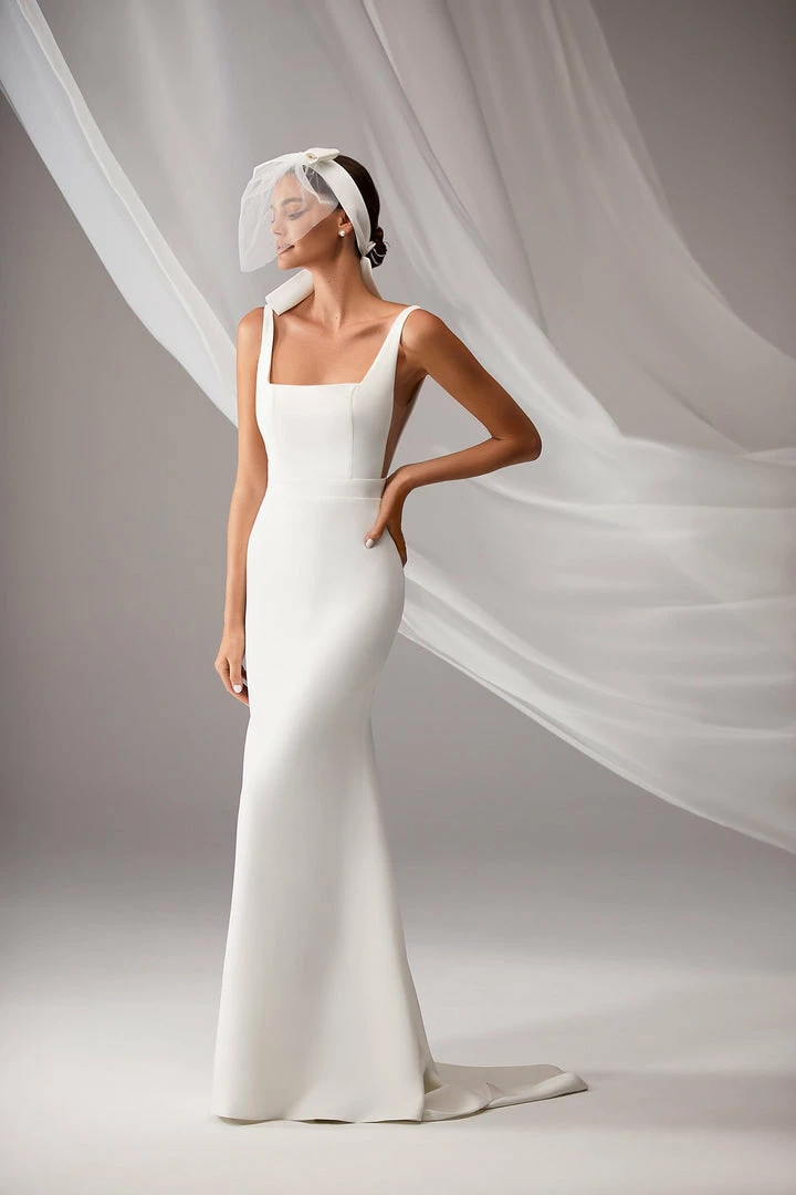 Delicate strapped wedding dress in ivory. Features a plunging neckline, open back and a short train.Â