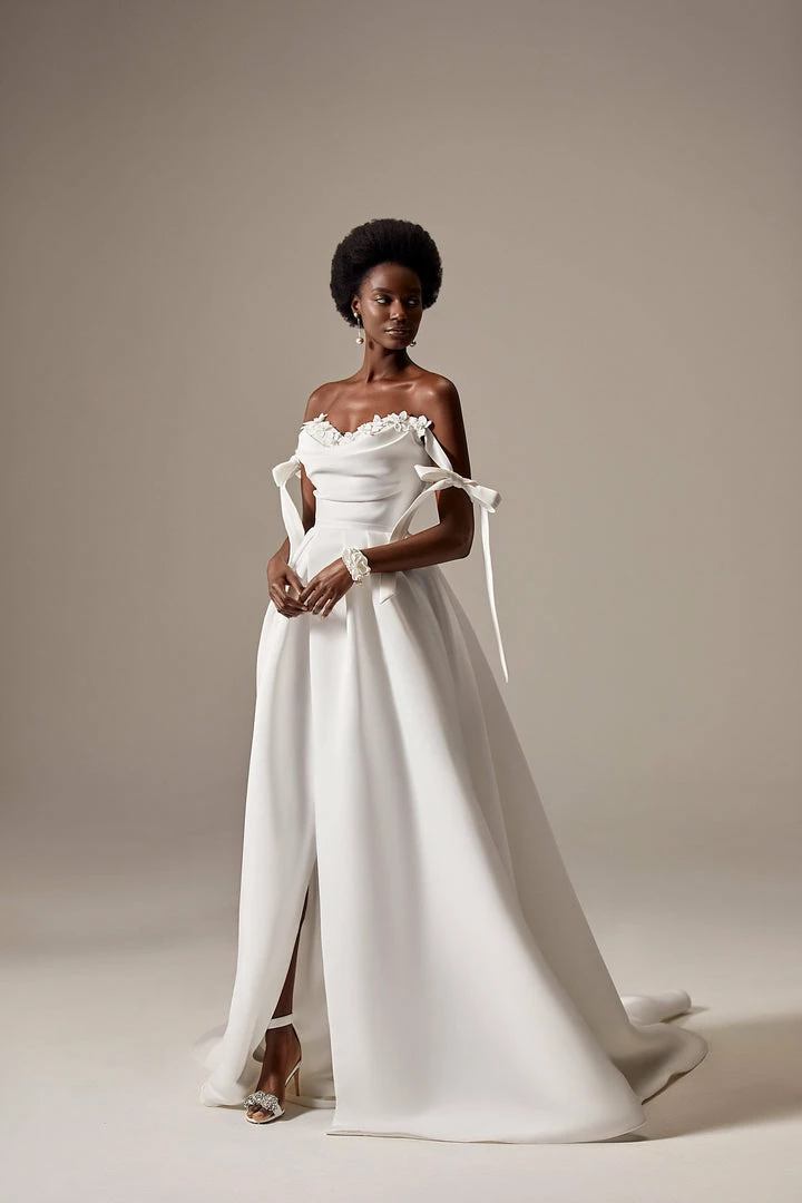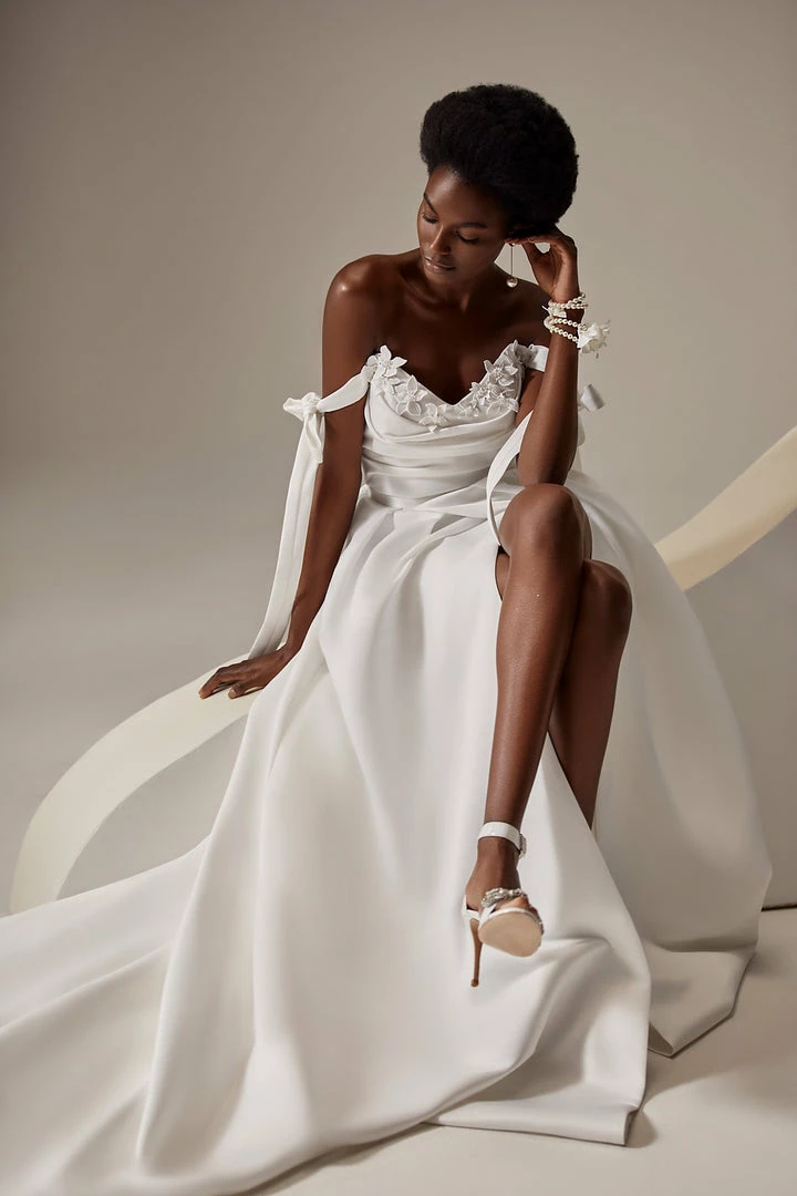 A-line wedding dress with a long train and a slit. The dress has straps and a sweetheart neckline decorated with 3D flowers. Also available without a slit and 3D flowers.