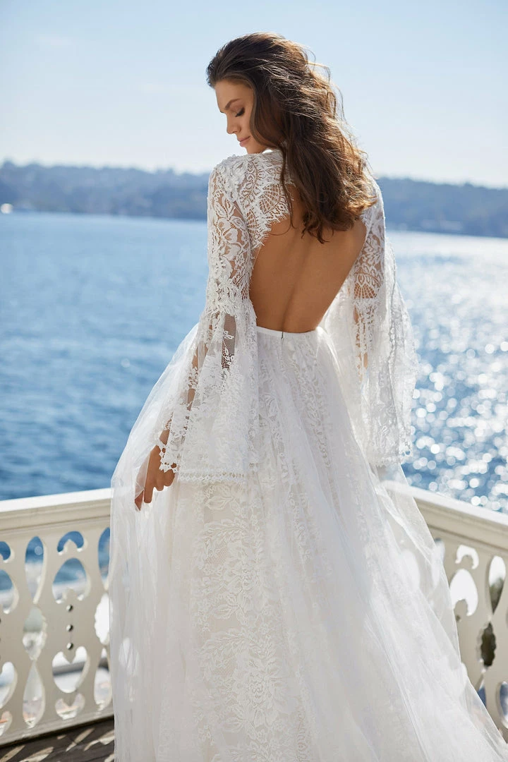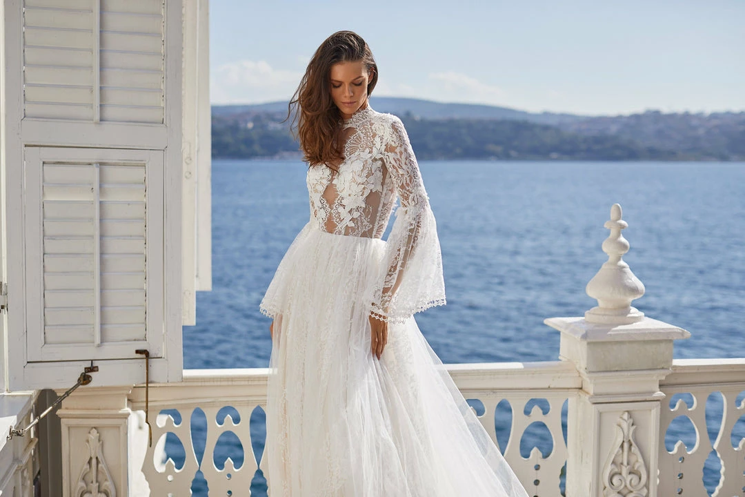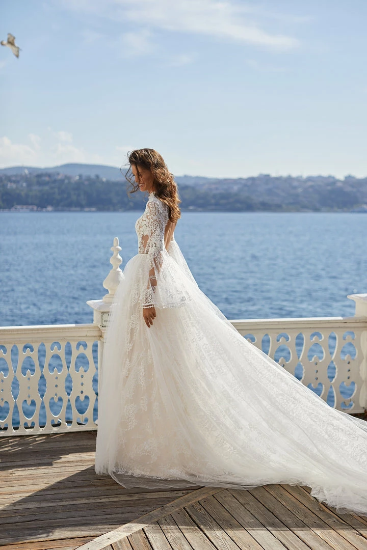Gorgeous lace & tulle turtleneck wedding ball gown in white. Features lace appliques, semi-transparent embroidered bodice, sheer lace flare sleeves, open back, and a delicate sheer tulle overlay skirt with a long train.