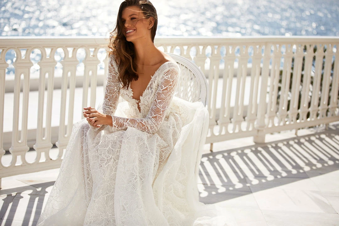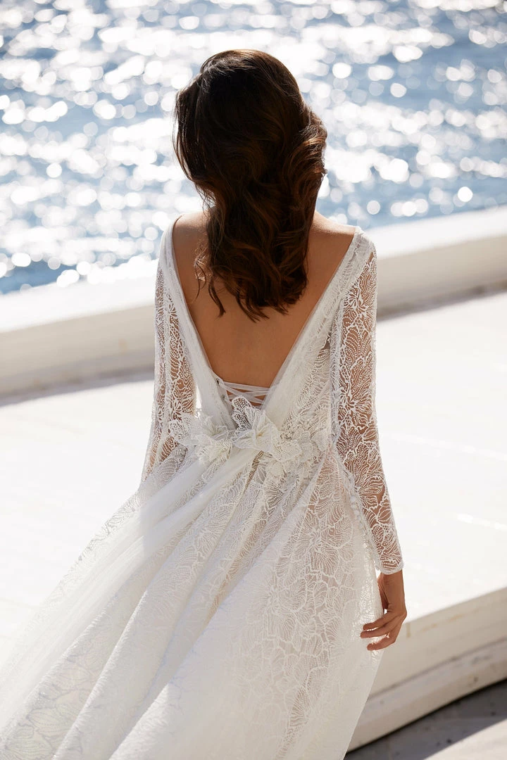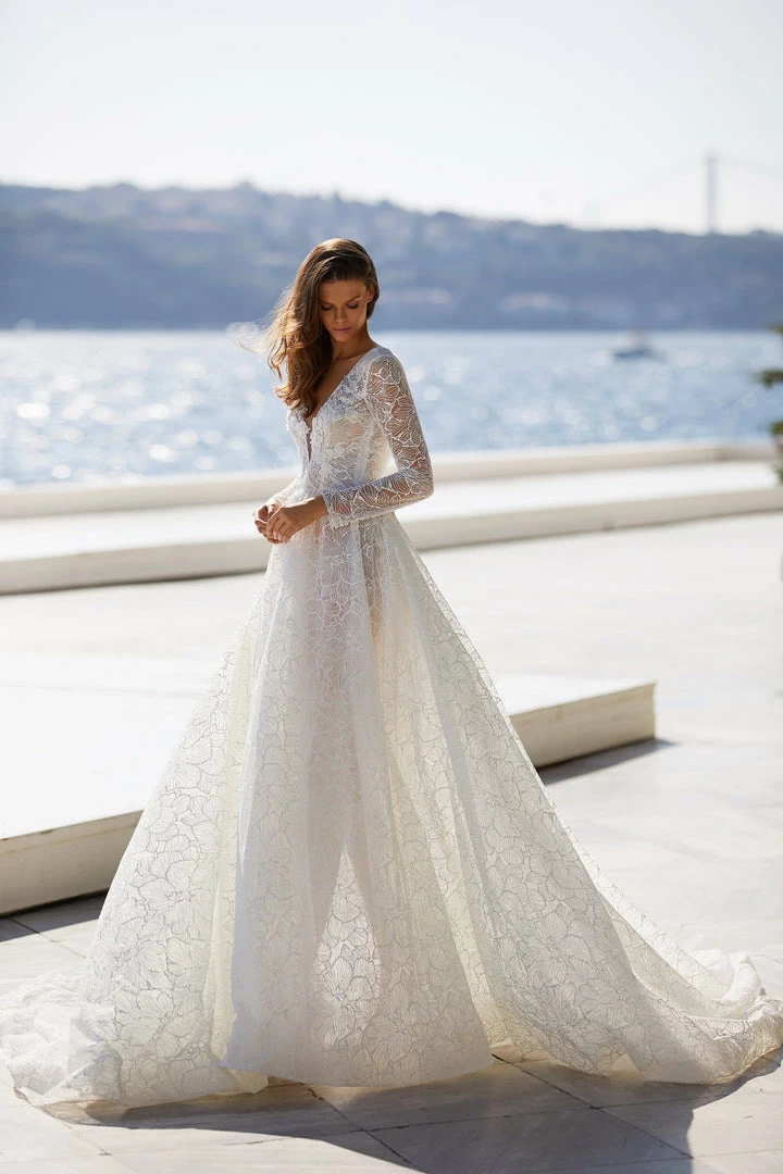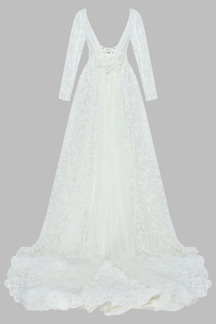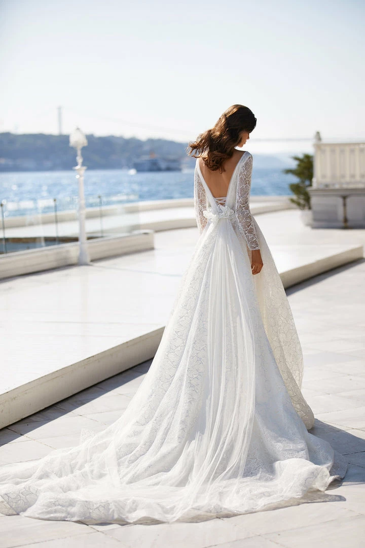 Incredible lace ball gown with a lace-embroidered V-neck bodice, sheer long sleeves, open back, and a gorgeous tulle long train.