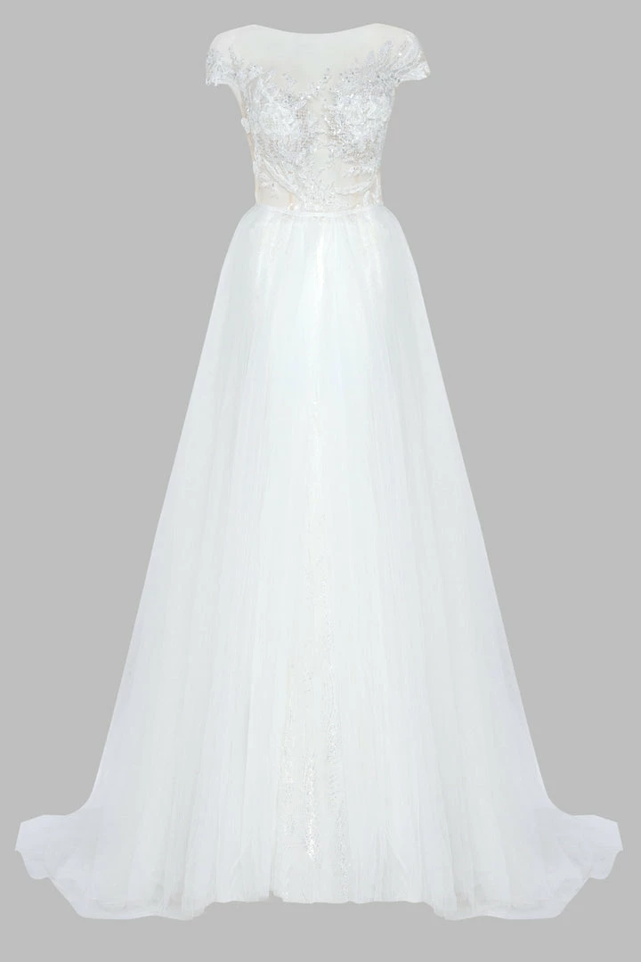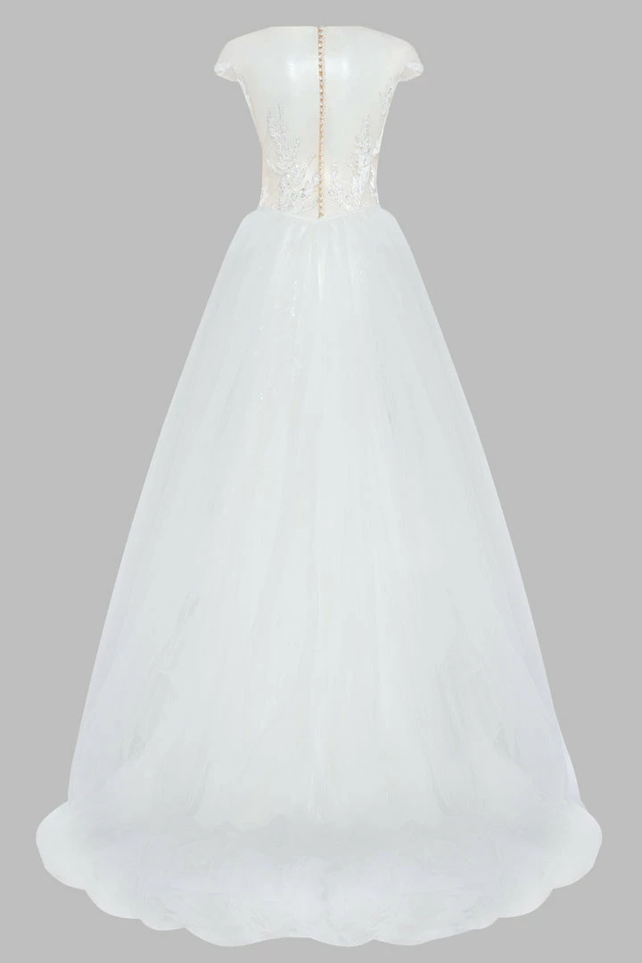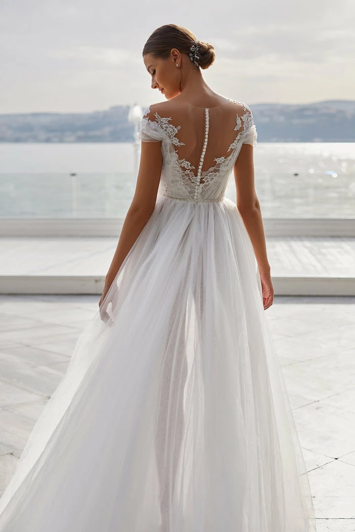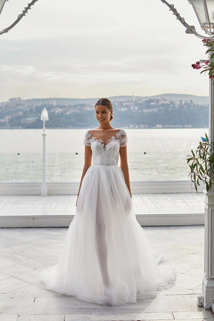 Dreamy off-the-shoulder A-line wedding dress with a lace-applique ruched bodice, heart-shaped neckline, open button-up back, and a delicate tulle skirt.