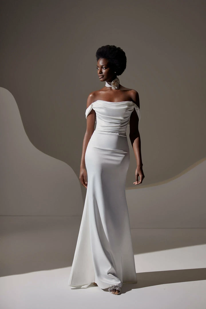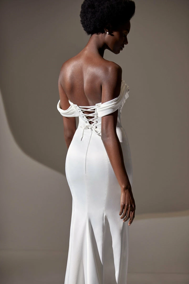 Mermaid off-the-shoulder wedding dress in satin with a draped corset.