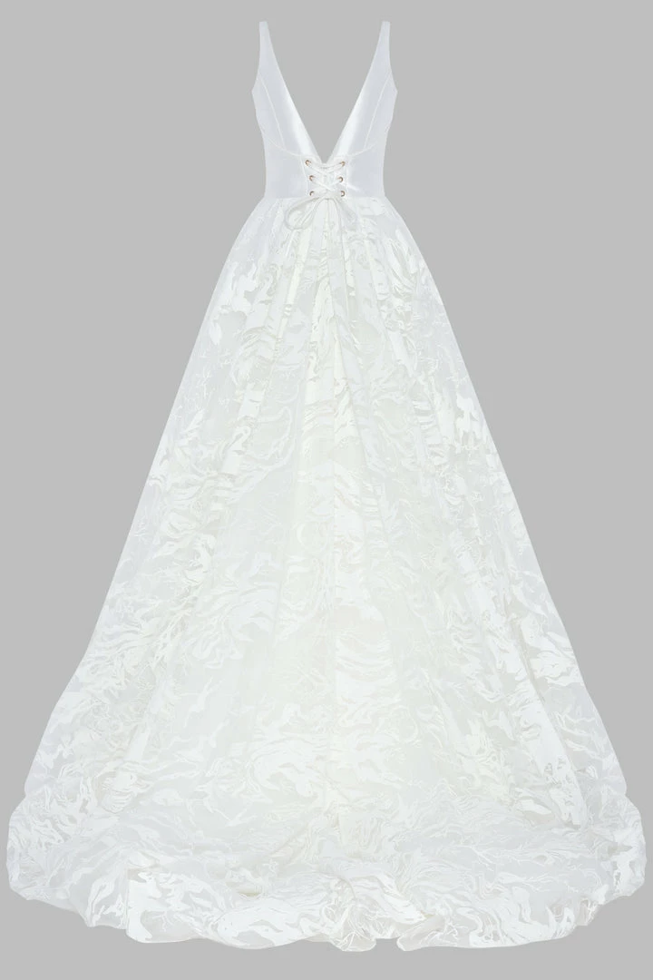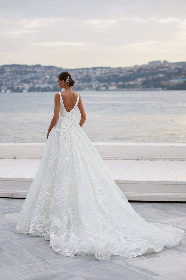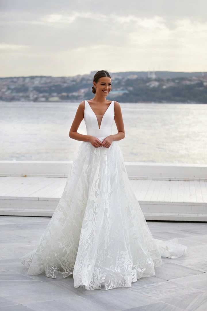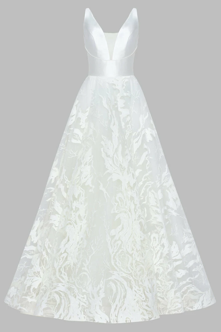 Gorgeous sleeveless A-line wedding dress with a white V-neck bodice, open back, and a full lace-embroidered tulle skirt.