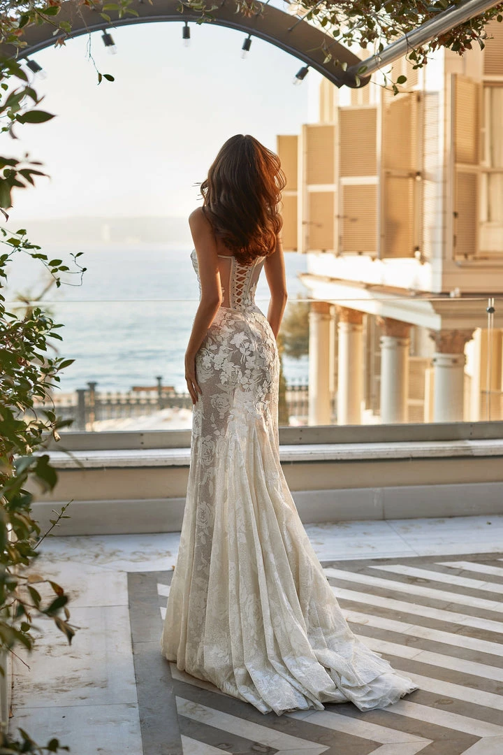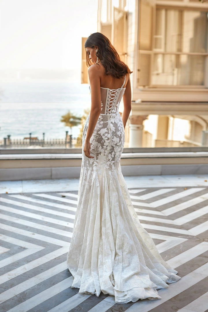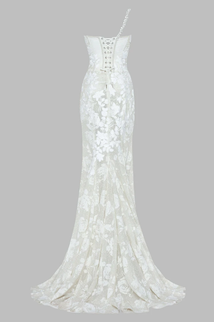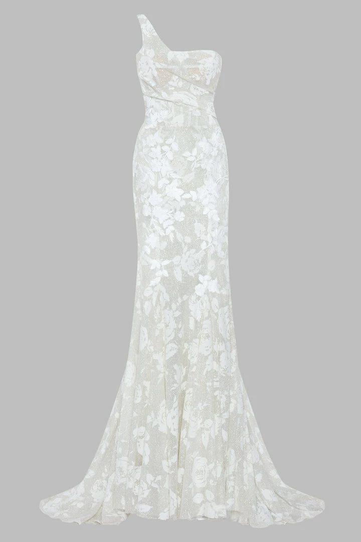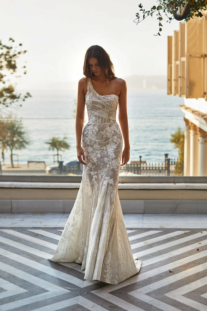 Elegant, sparkly one-shoulder mermaid wedding gown with a sparkling silvery fabric, lace applique detailing, open lace-up back, and a delicate long train.