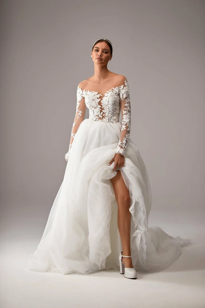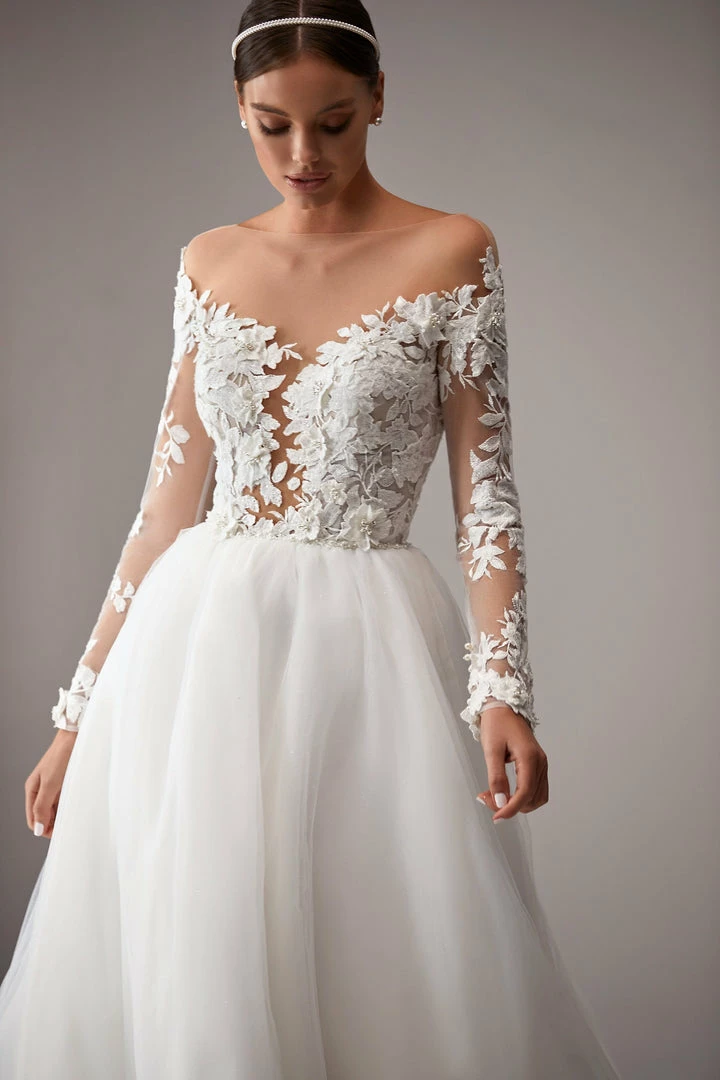 A-line wedding dress in ivory. Features a lace-applique bodice, off-the-shoulder, long sleeves, open back, and a long train.